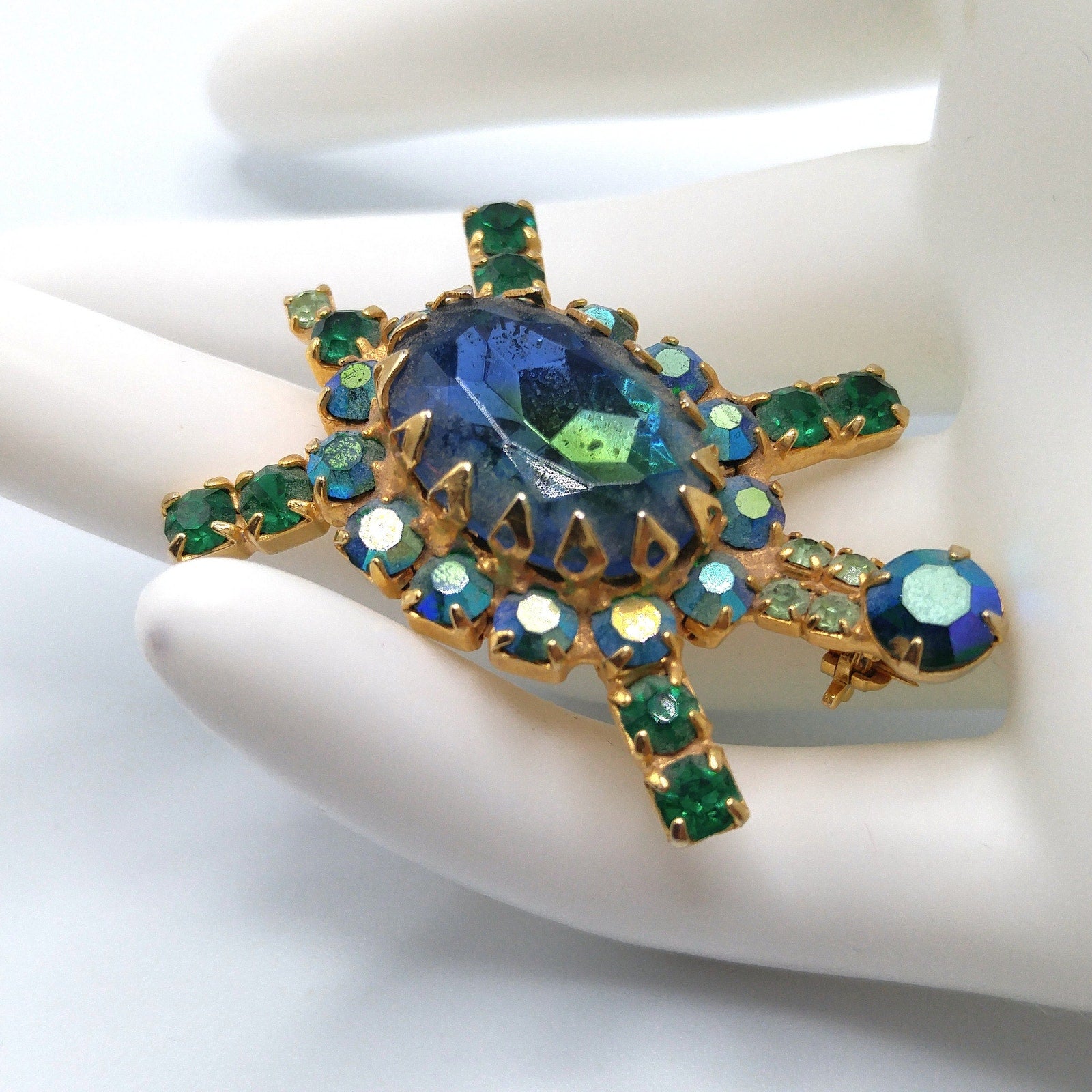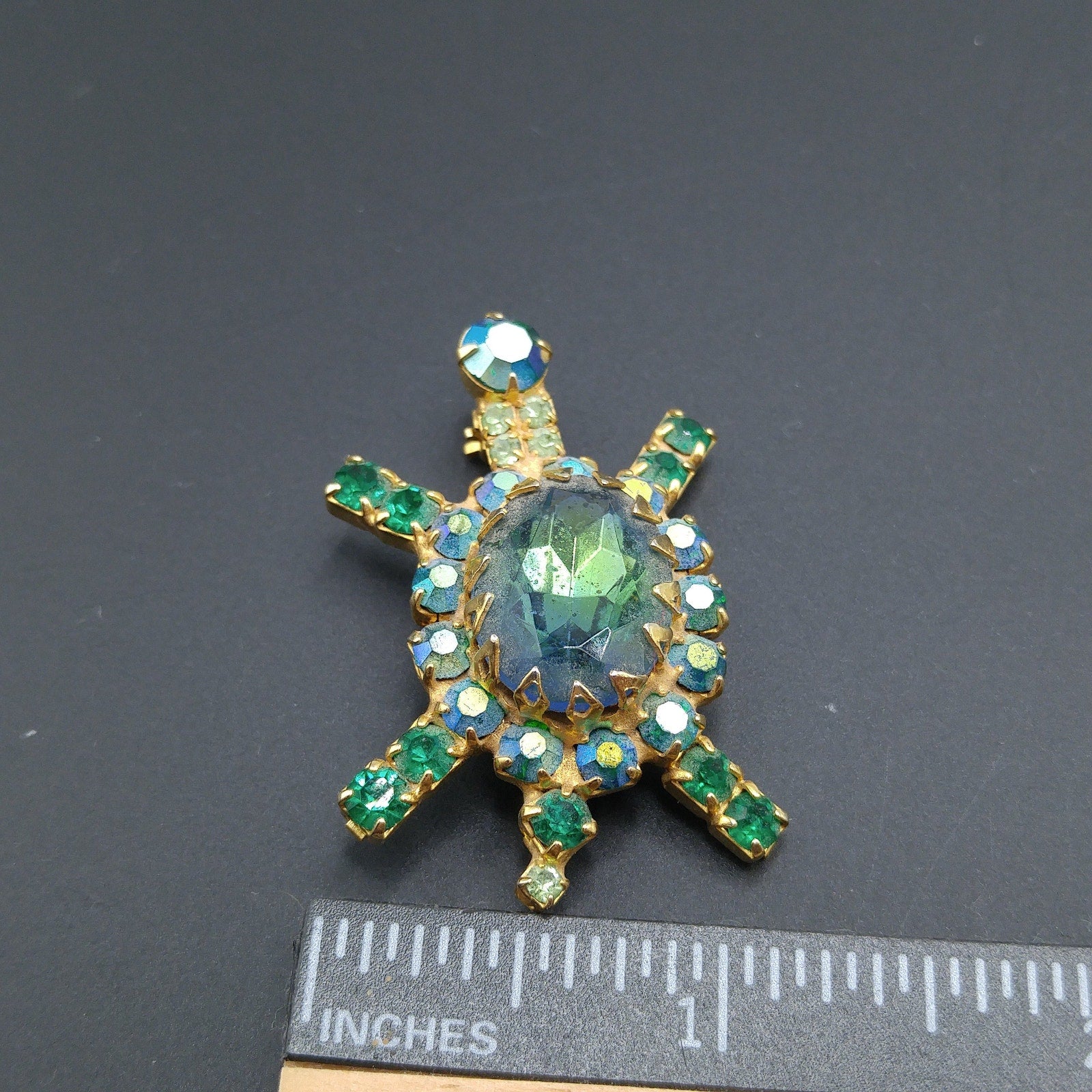 *Description: Beautiful turtle rhinestone brooch with green and blue rhinestones, aurora borealis, and a gold plated backing from the 1960s.  This brooch would be a great gift for someone who loves turtles and all animals. This would be a great addition to your vintage jewelry collection or make a great vintage gift!