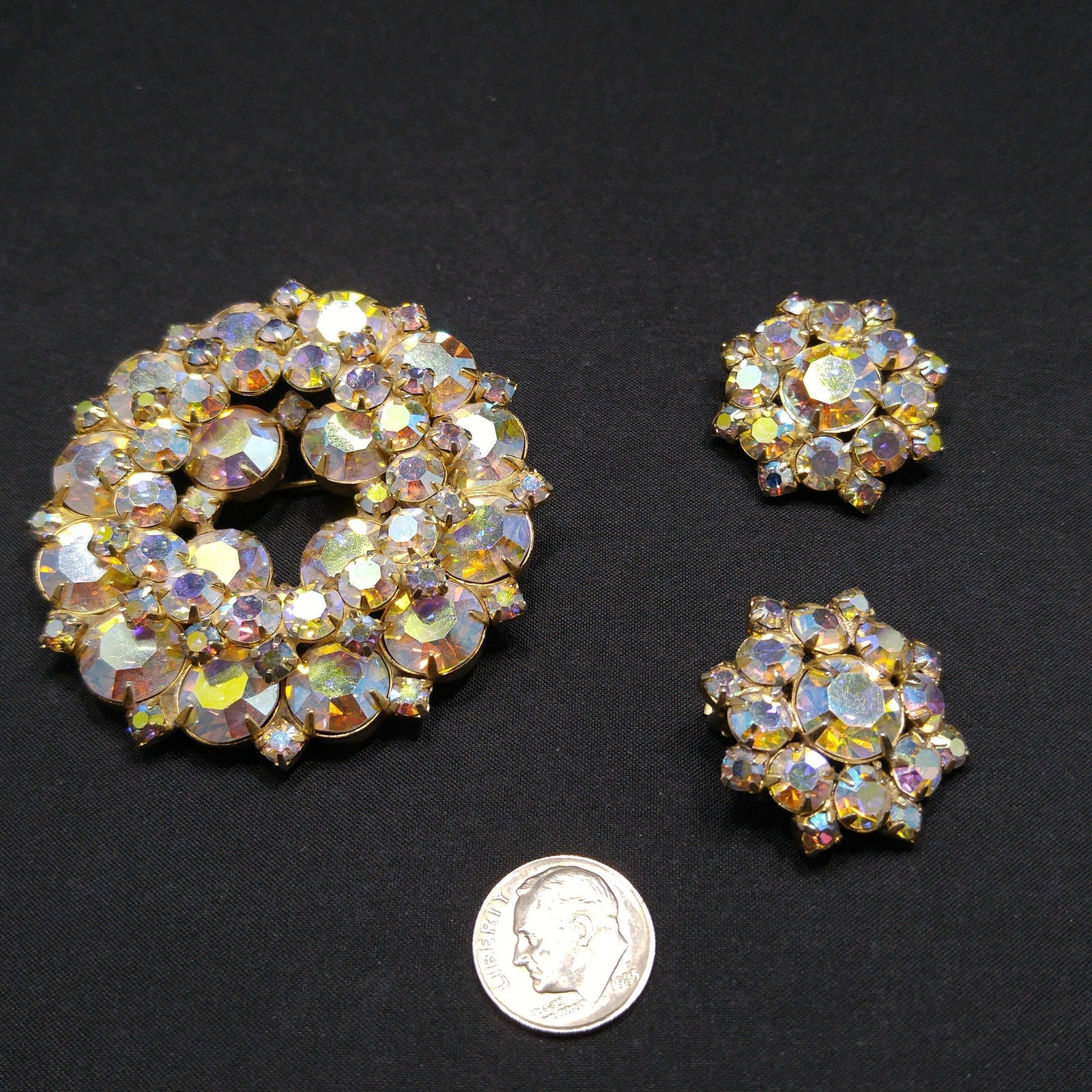 *Description: This is a beautiful aurora borealis rhinestone floral brooch and matching earrings set from the 1960s. The brooch has two rivets meaning the front of the brooch is a second piece which has been attached. The pin is a part of the brooch and the design is high quality with characteristics of Weiss or D & E designs. These pieces are unsigned but have designer qualities and would make an excellent addition to your vintage jewelry collection or make a great vintage gift!
