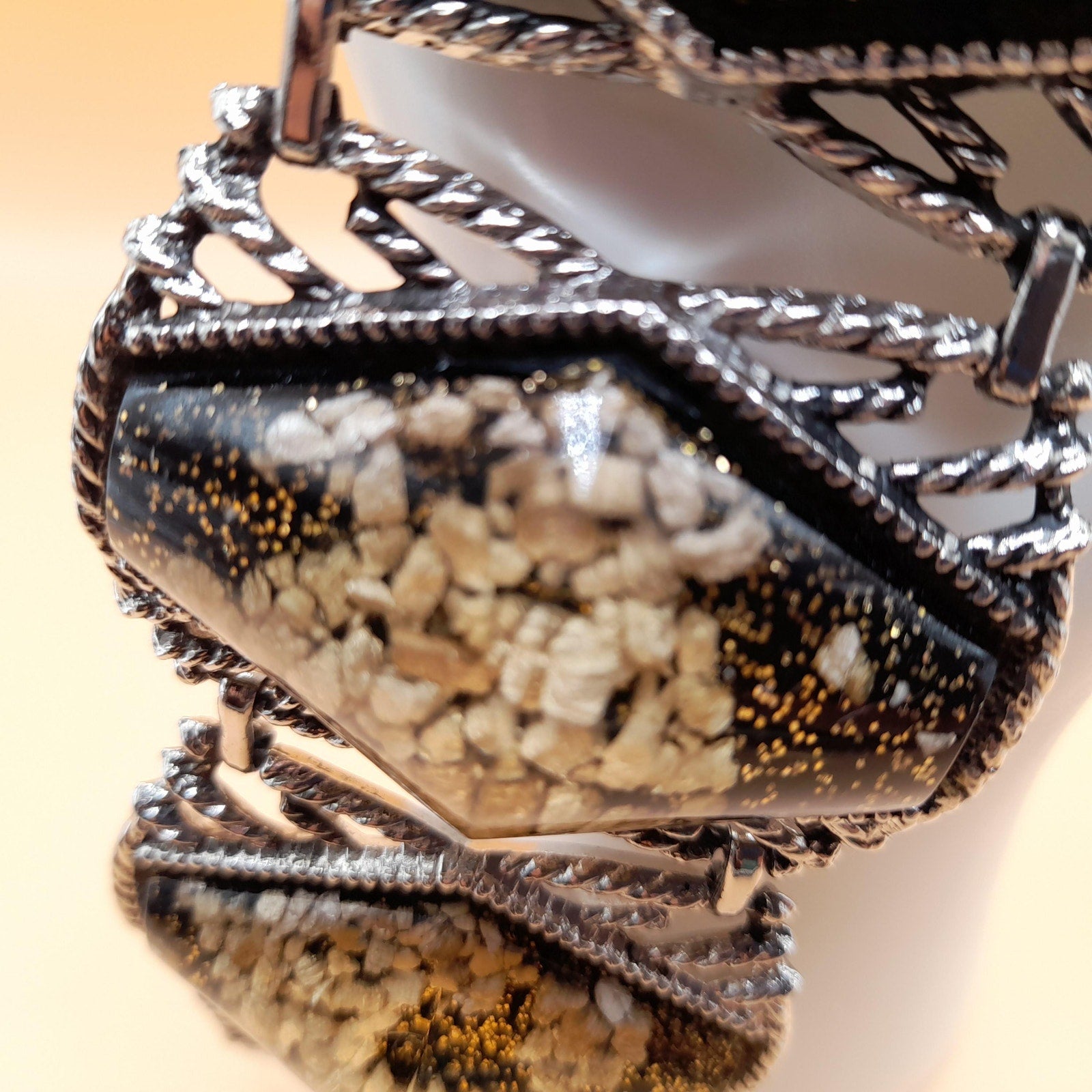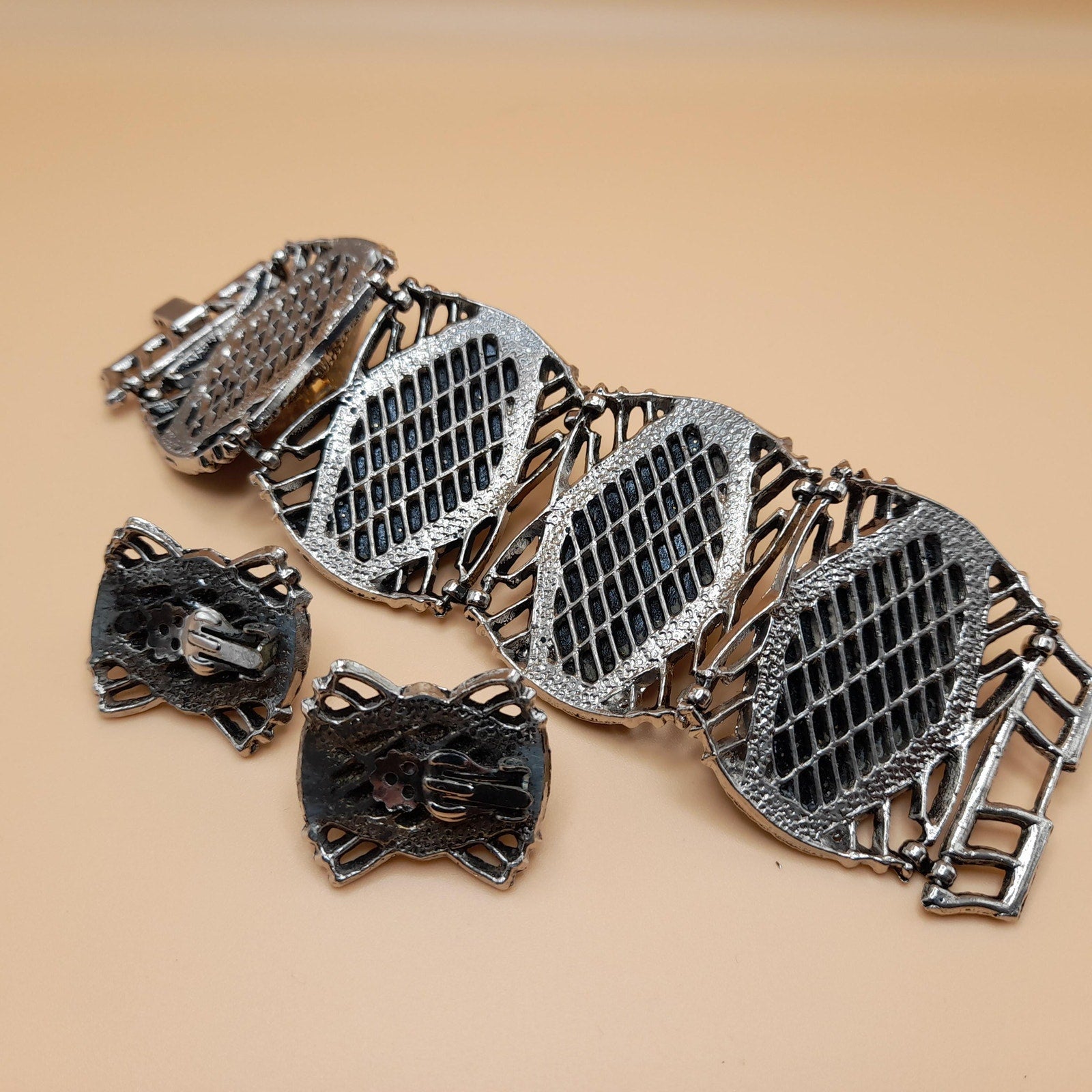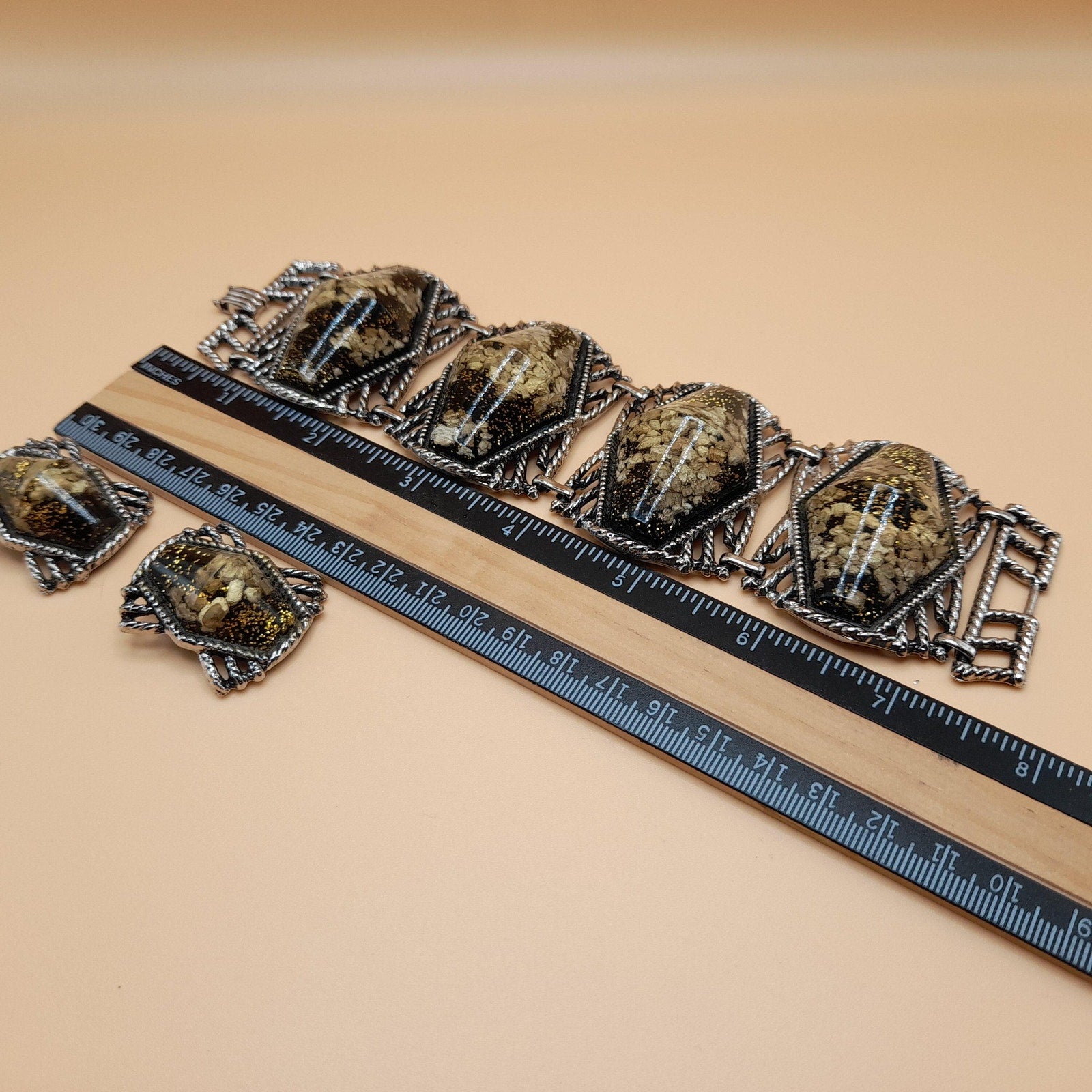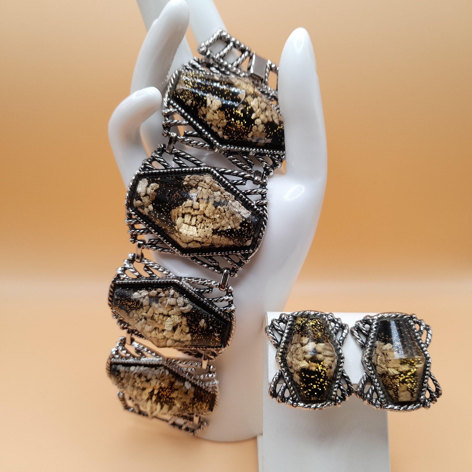 *Description: This is a beautiful mid-century unsigned Selro Selini bracelet and clip on earrings set from the 1950s. The bracelet and earrings are made with clear molded Lucite with tiny items inside each link. The metal is an antique gold tone metal. The bracelet and earrings are chunky as was popular during the 1950s. The bracelet is unique and in very good condition. The earrings were worn more than the bracelet which shows little wear. The earrings show wear on the backs usually due to perfume or hair spray. The front panel links on each look great. This would be a great addition to your vintage jewelry collection or make a great vintage gift!