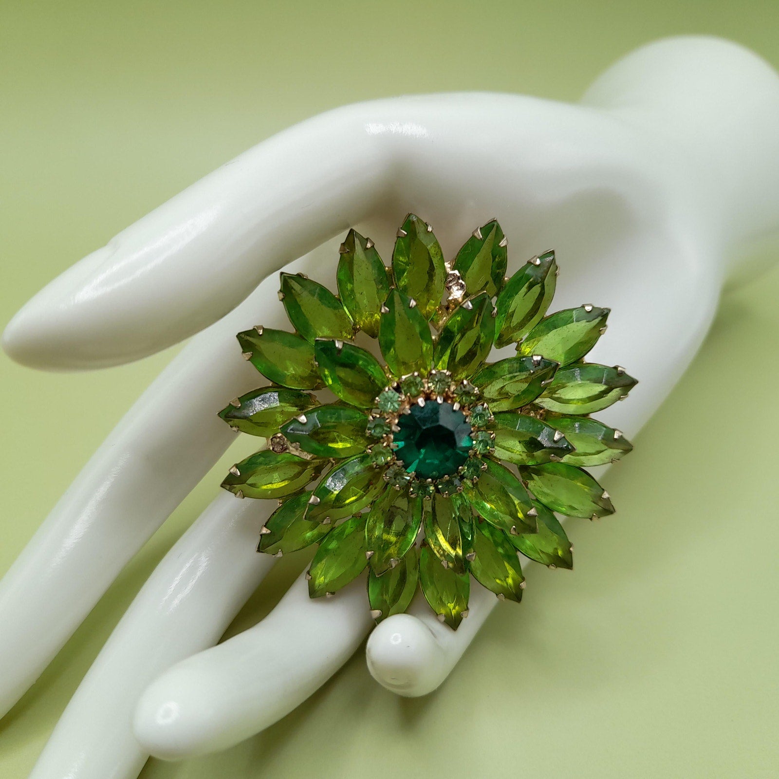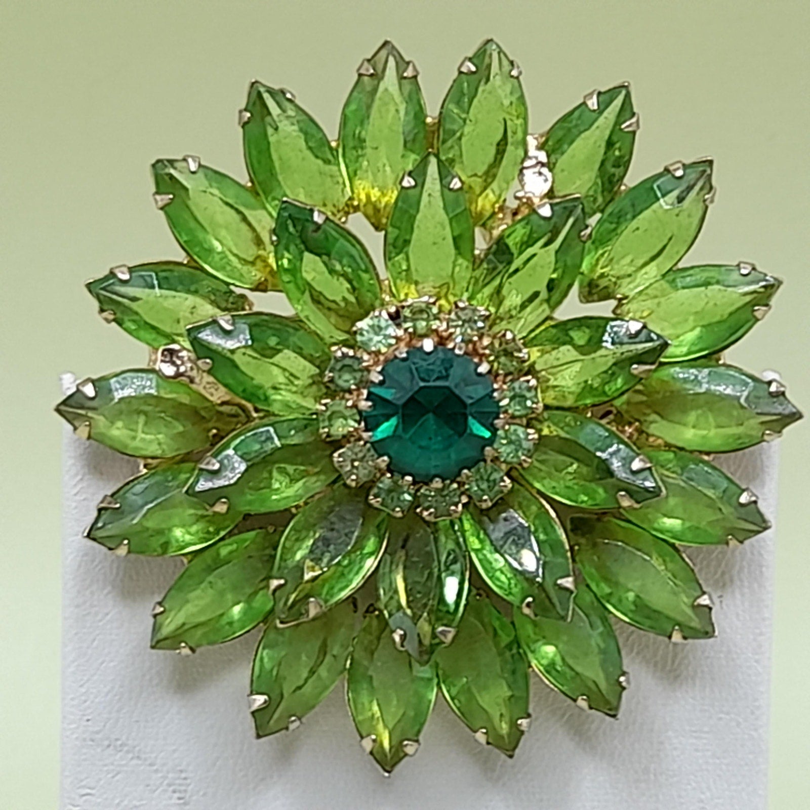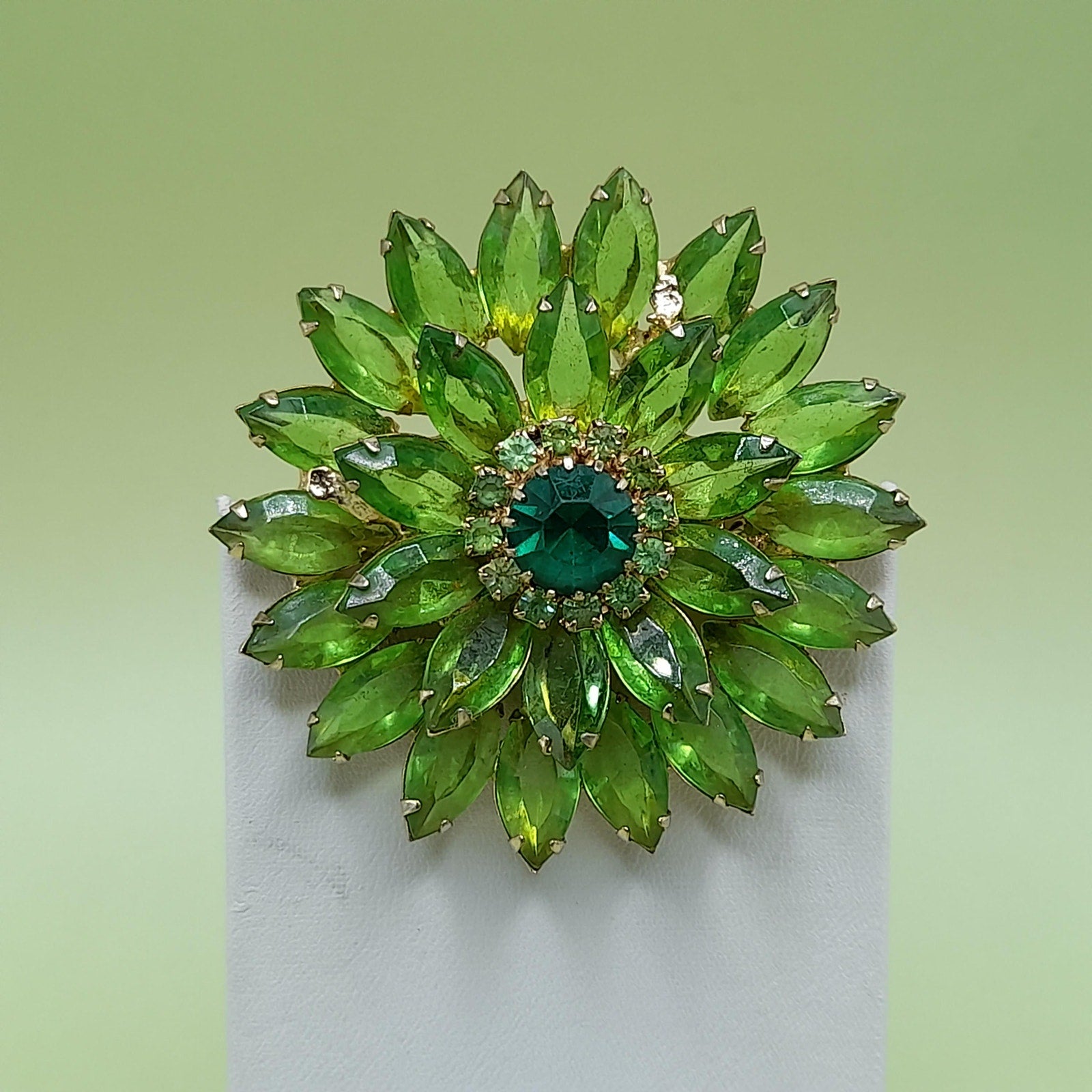 *Description: This is a beautiful green unsigned Weiss on a gold tone backing from the 1960s. I located this brooch signed by WEISS on the back. This brooch has several clumps of gold plating on the back which peeks through the front which appears to have been there originally. The back is unique with metal tubes built into the construction of the leveling flower. This would be a great addition to your vintage jewelry collection or make a great vintage gift!