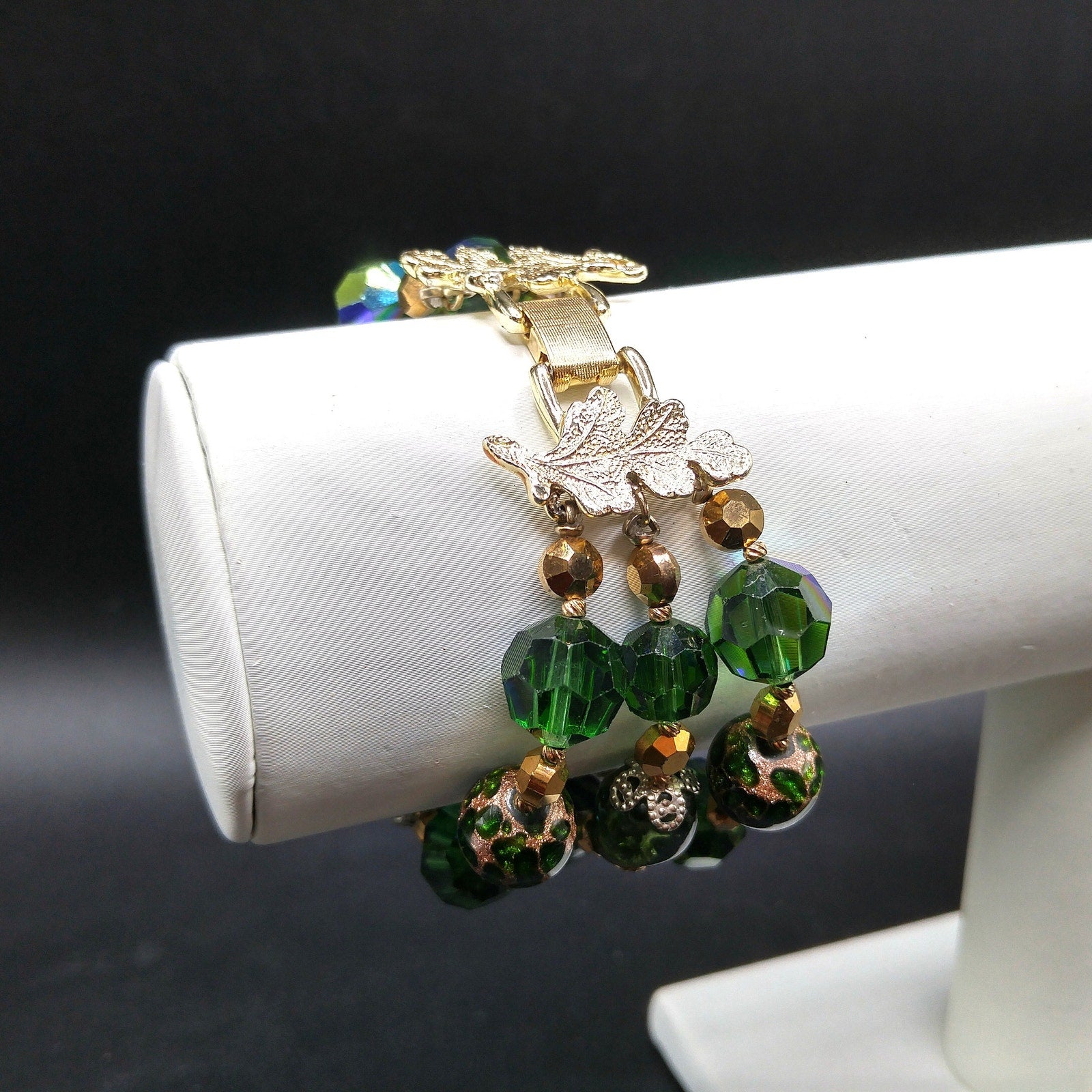 This exquisite 1960s Vendome bracelet feels like a walk through an enchanted forest. Three strands of rich emerald, olive, and antique-gold crystals are paired with rare art glass beads, some with textured moss-like finishes and swirling patterns. Aurora borealis accents catch the light in flashes of blue-green and gold, giving the bracelet a jewel-toned glow.