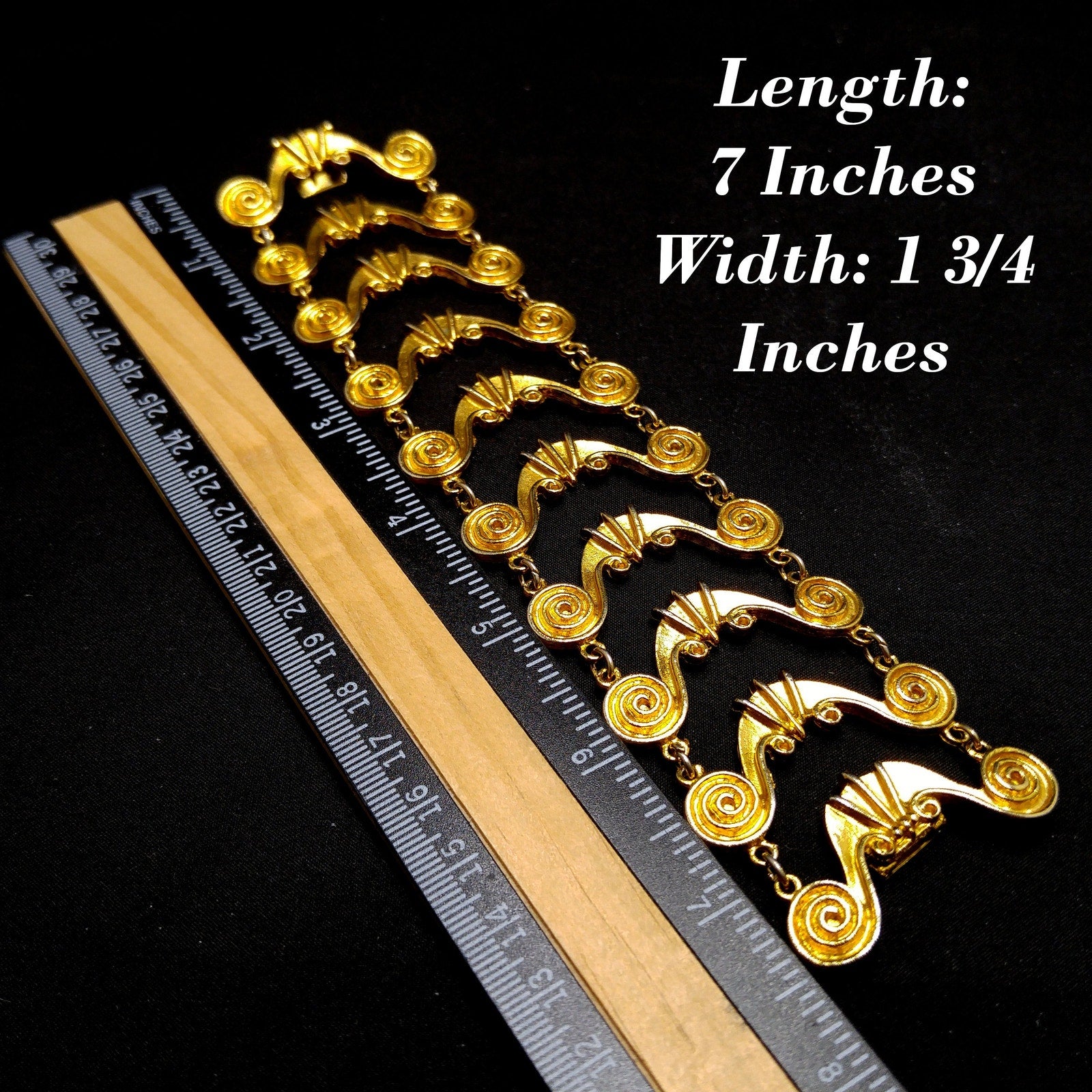 This exquisite 1950s Vendome bracelet features an impressive wide-band design with raised swirling motifs and ornate openwork detailing. The bracelet is finished in rich gold plating and showcases Vendome’s signature craftsmanship and sculptural artistry.
