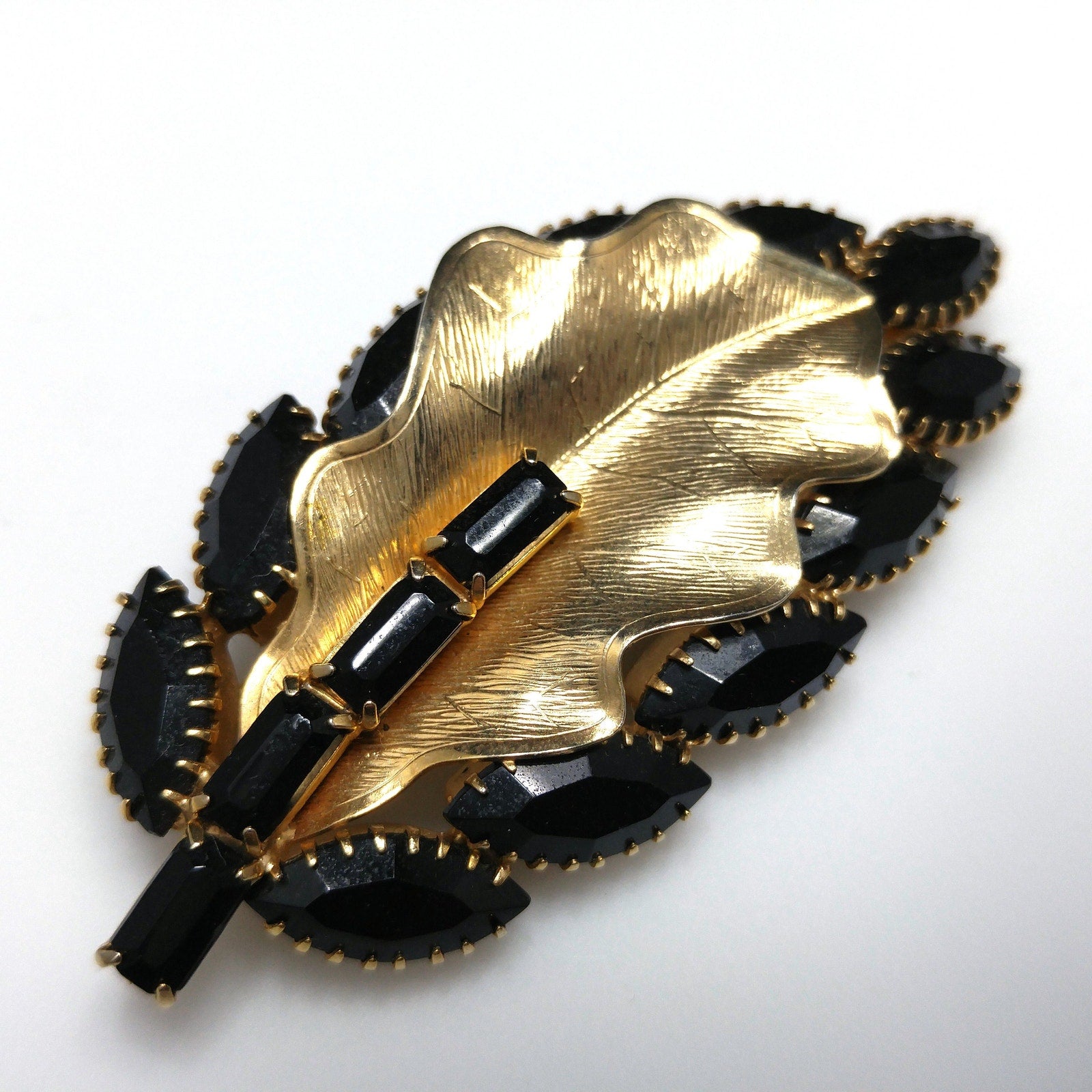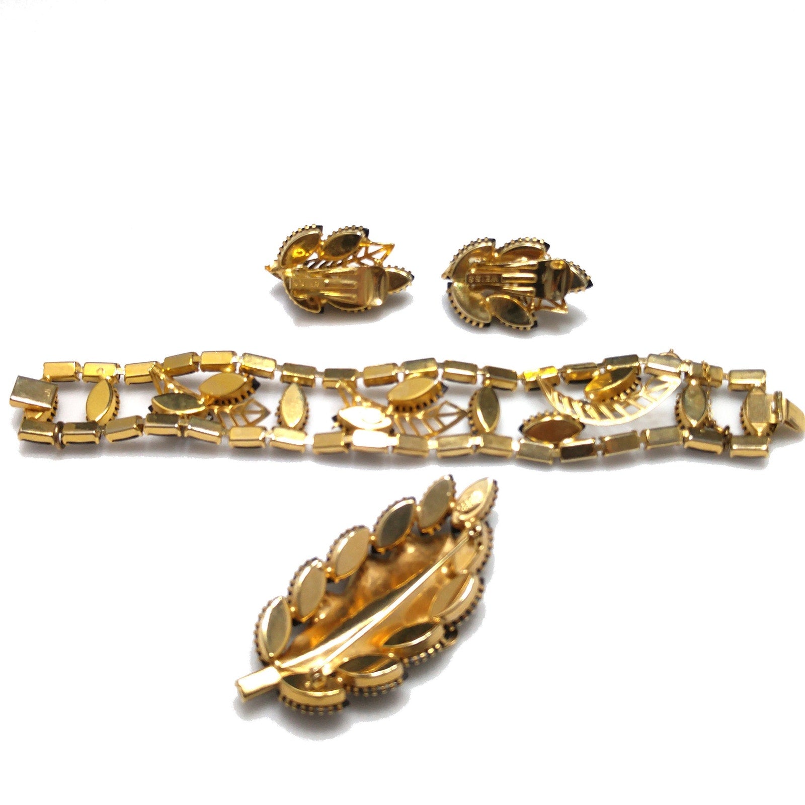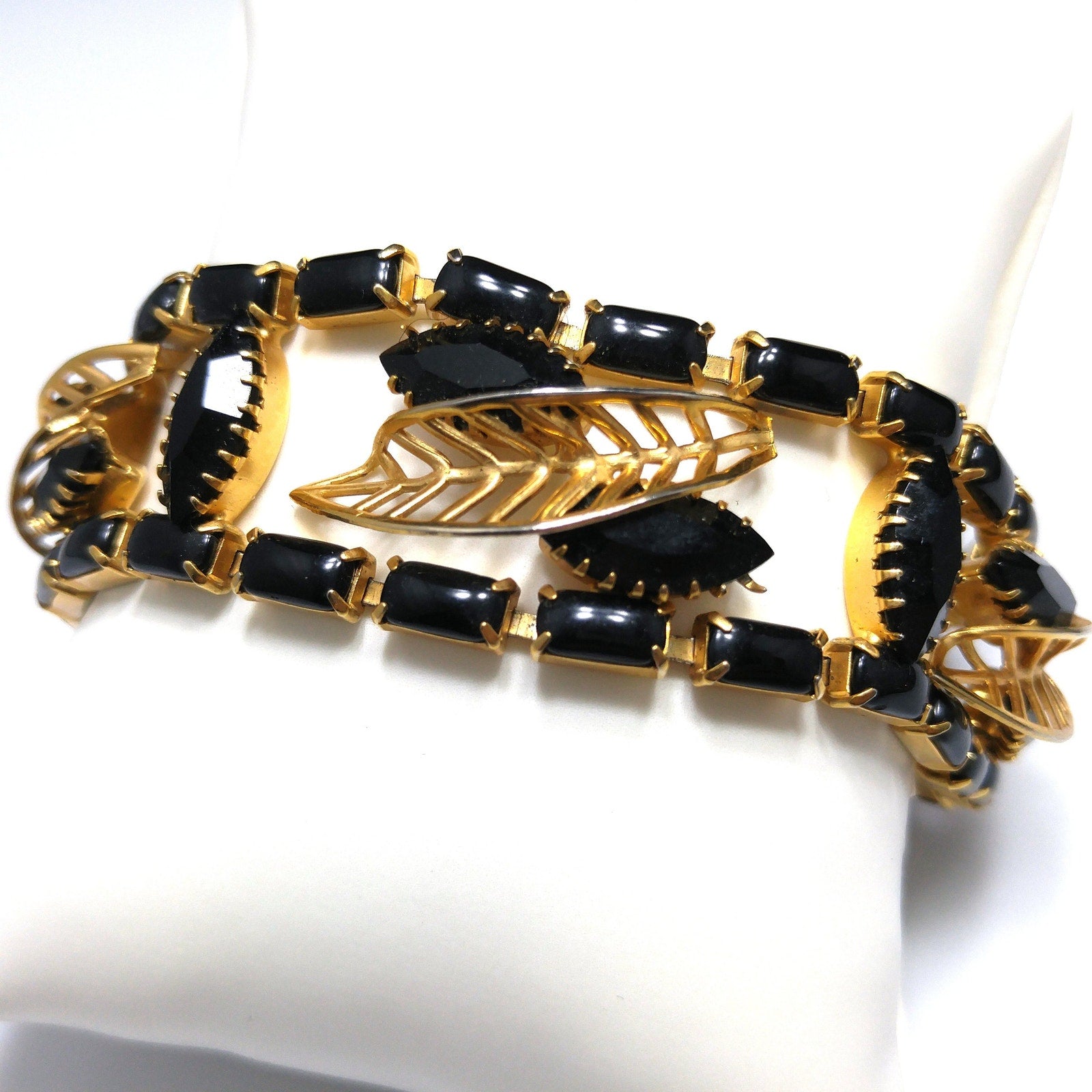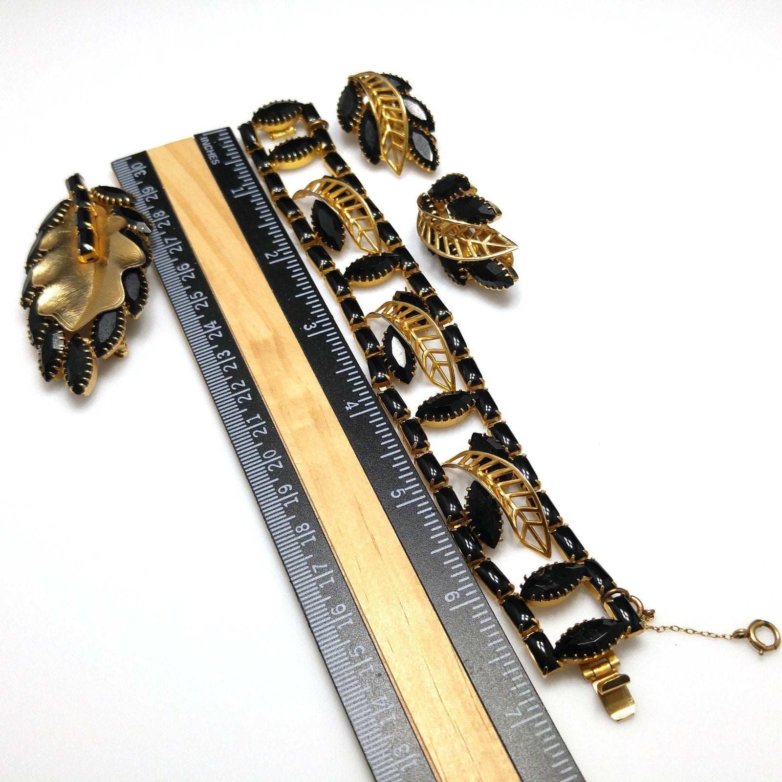 This stunning vintage Weiss jewelry set from the 1950s features a matching bracelet, brooch, and clip-on earrings in a sophisticated leaf motif. Each piece is crafted in gold-plated metal and set with deep black crystal rhinestones in marquise and baguette cuts. The stones are prong-set with the signature dog-tooth style—multiple prongs securing each rhinestone for a dramatic, high-quality finish.