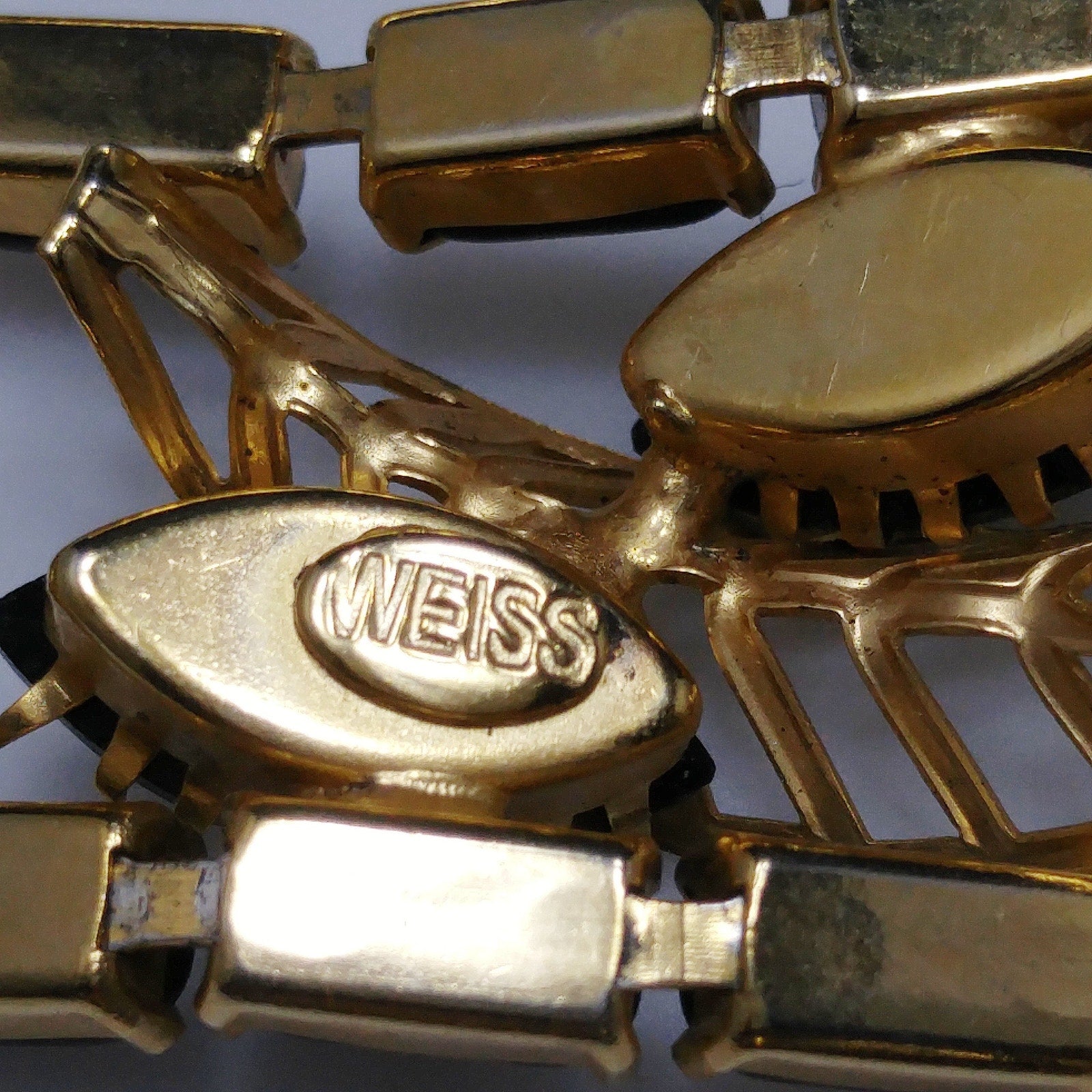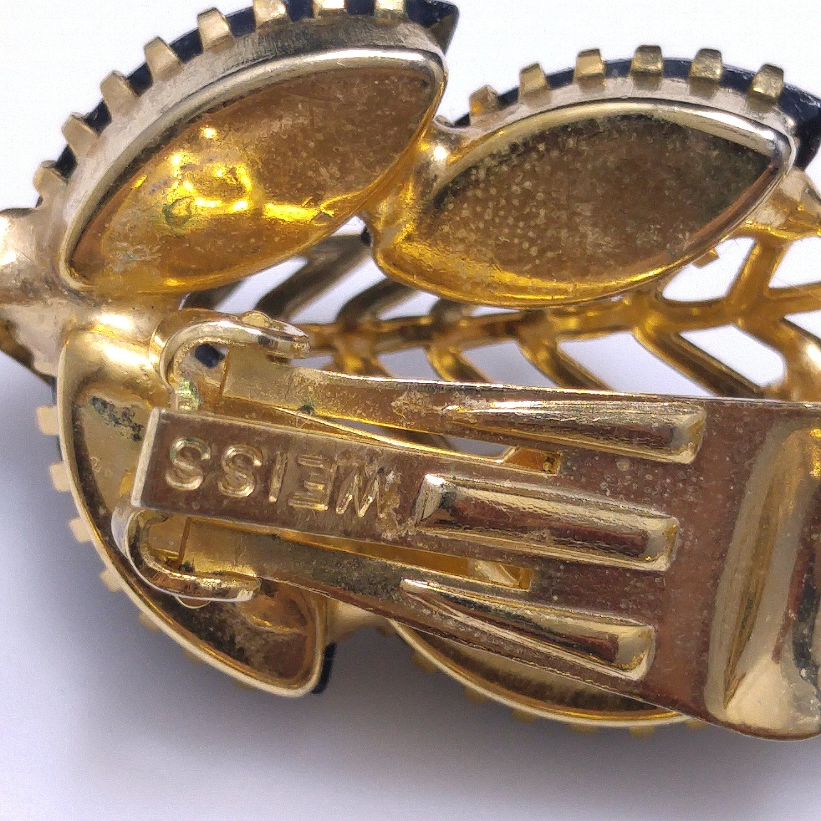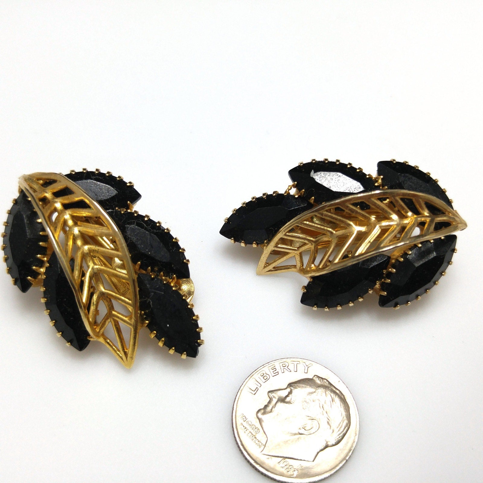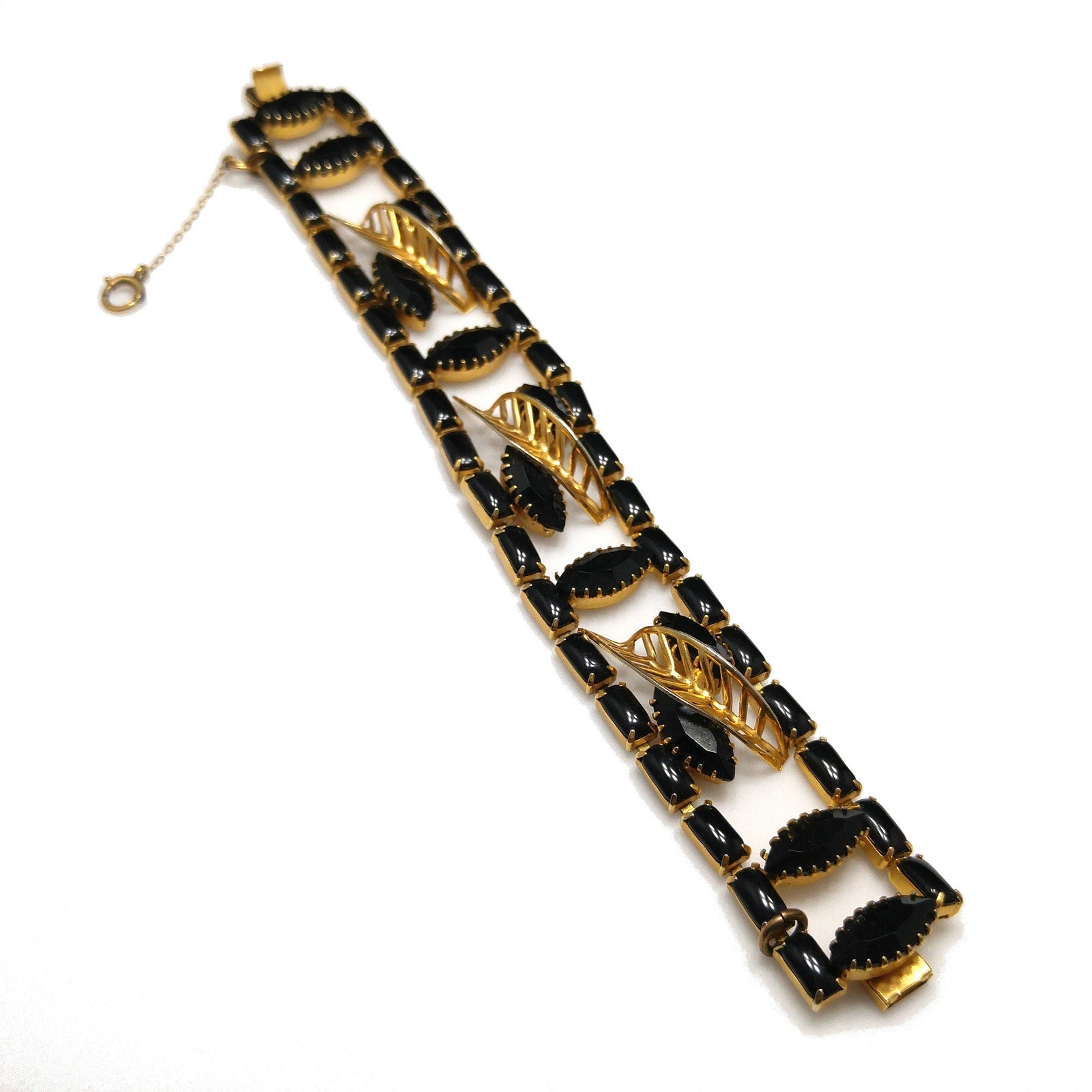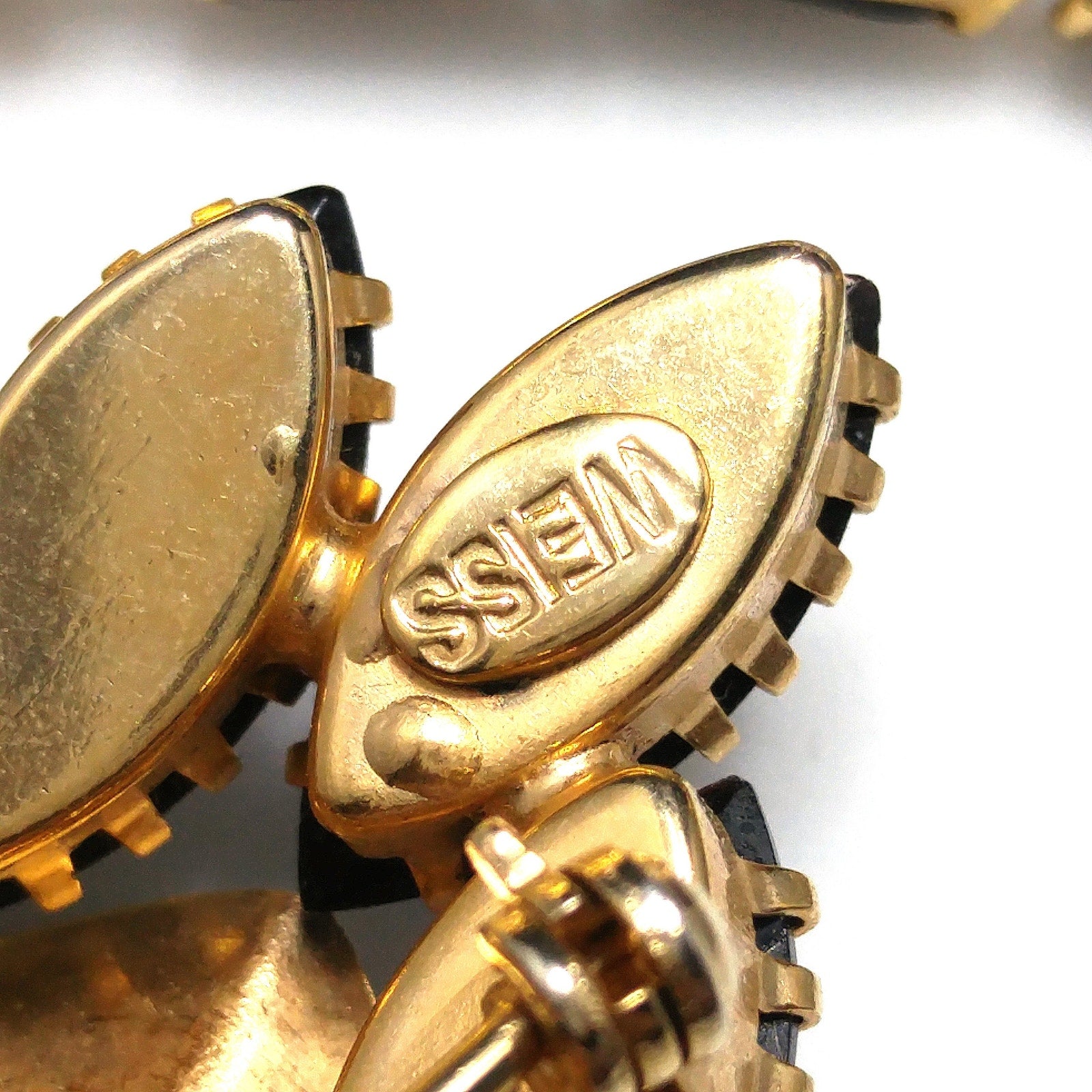 This stunning vintage Weiss jewelry set from the 1950s features a matching bracelet, brooch, and clip-on earrings in a sophisticated leaf motif. Each piece is crafted in gold-plated metal and set with deep black crystal rhinestones in marquise and baguette cuts. The stones are prong-set with the signature dog-tooth style—multiple prongs securing each rhinestone for a dramatic, high-quality finish.