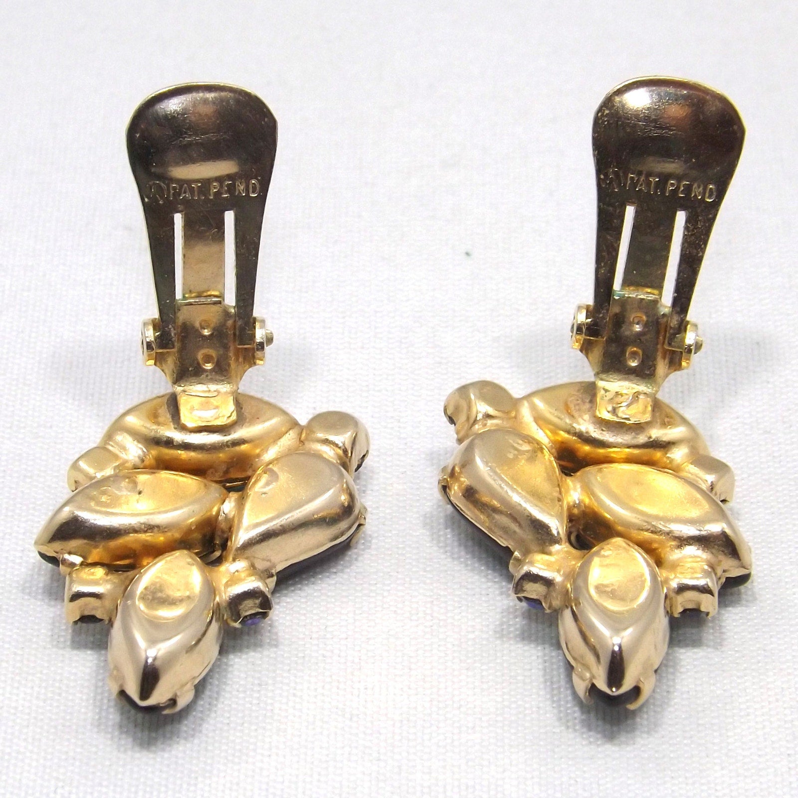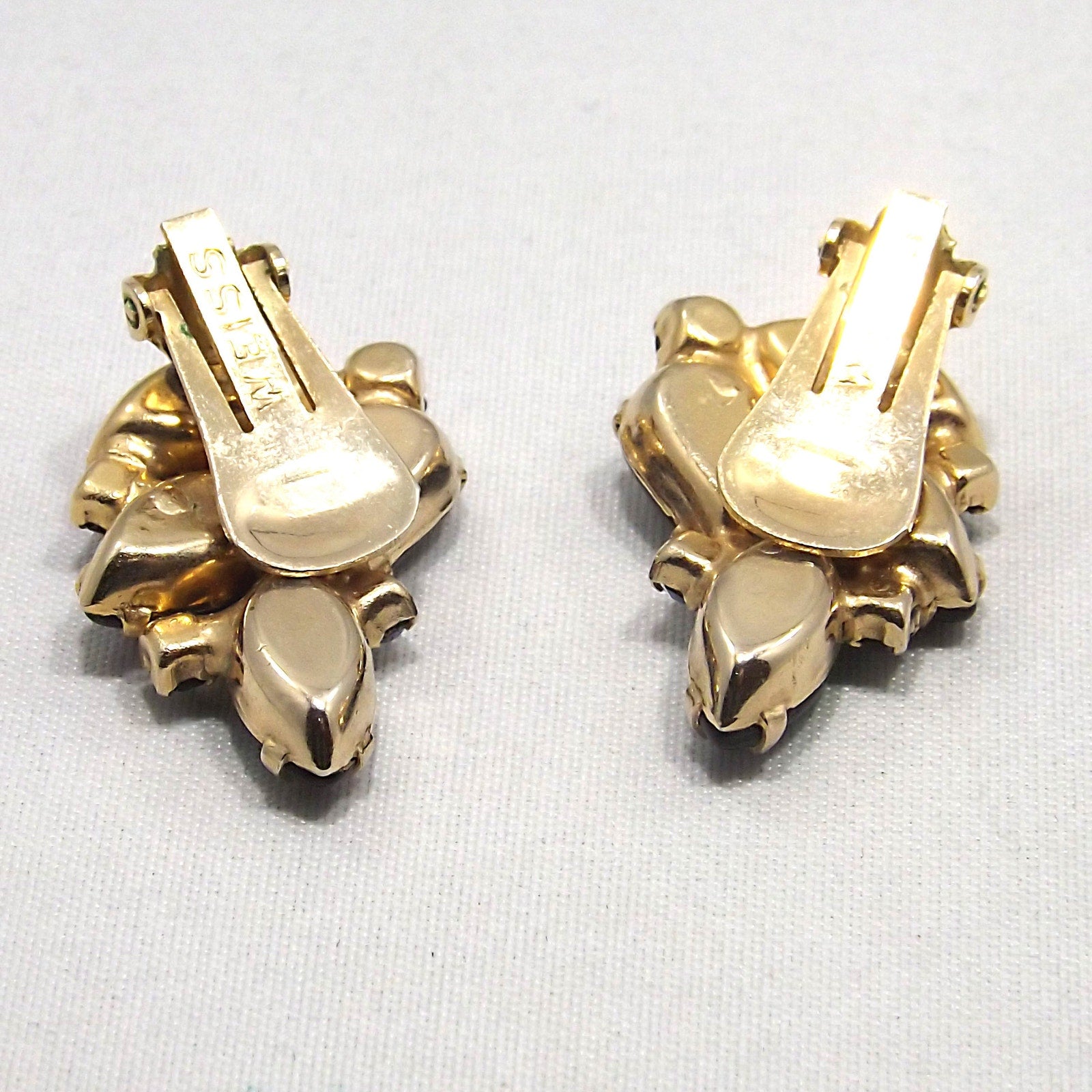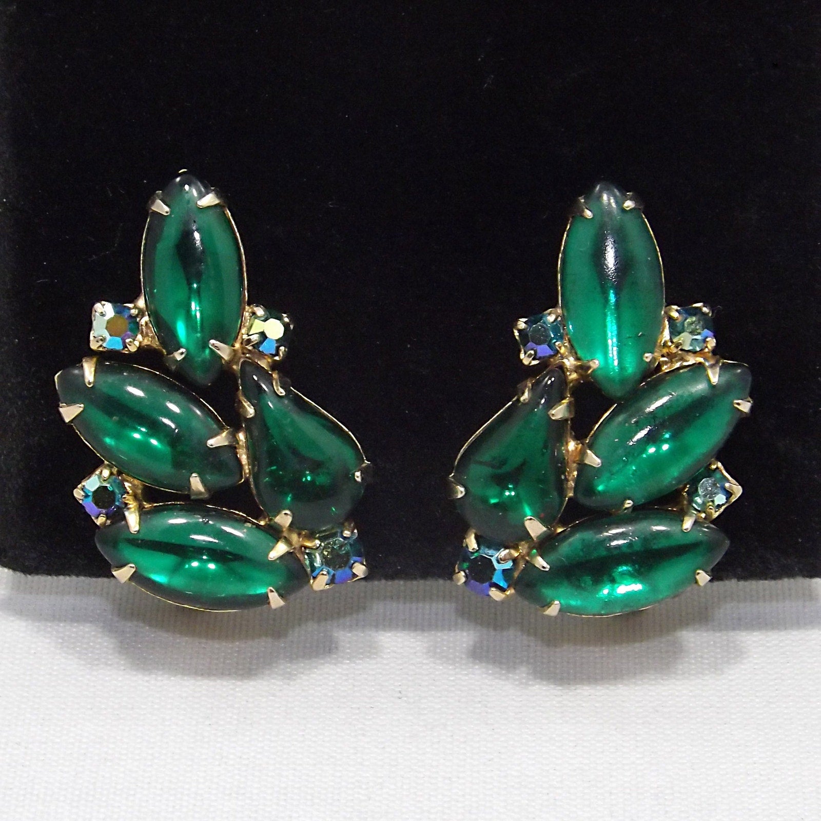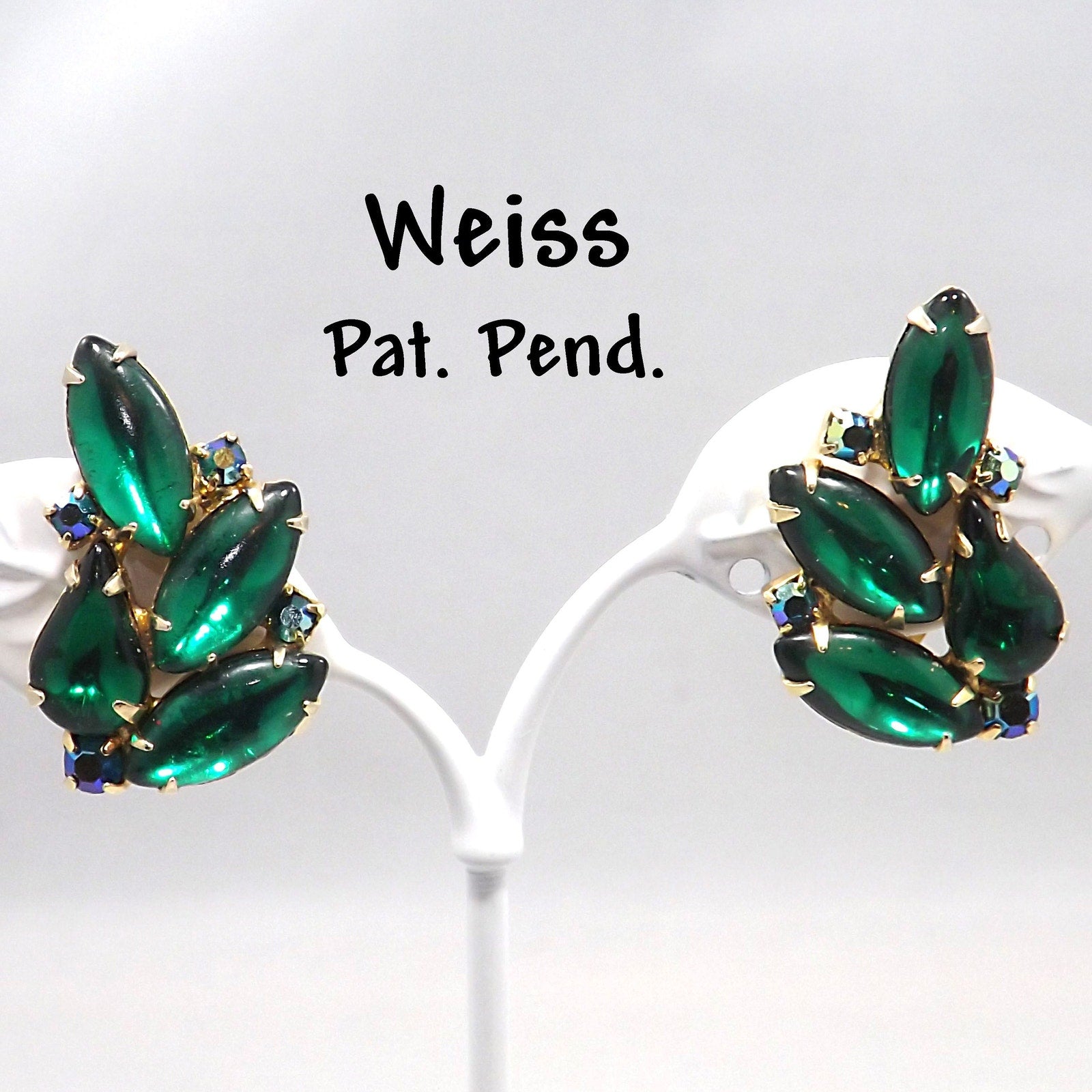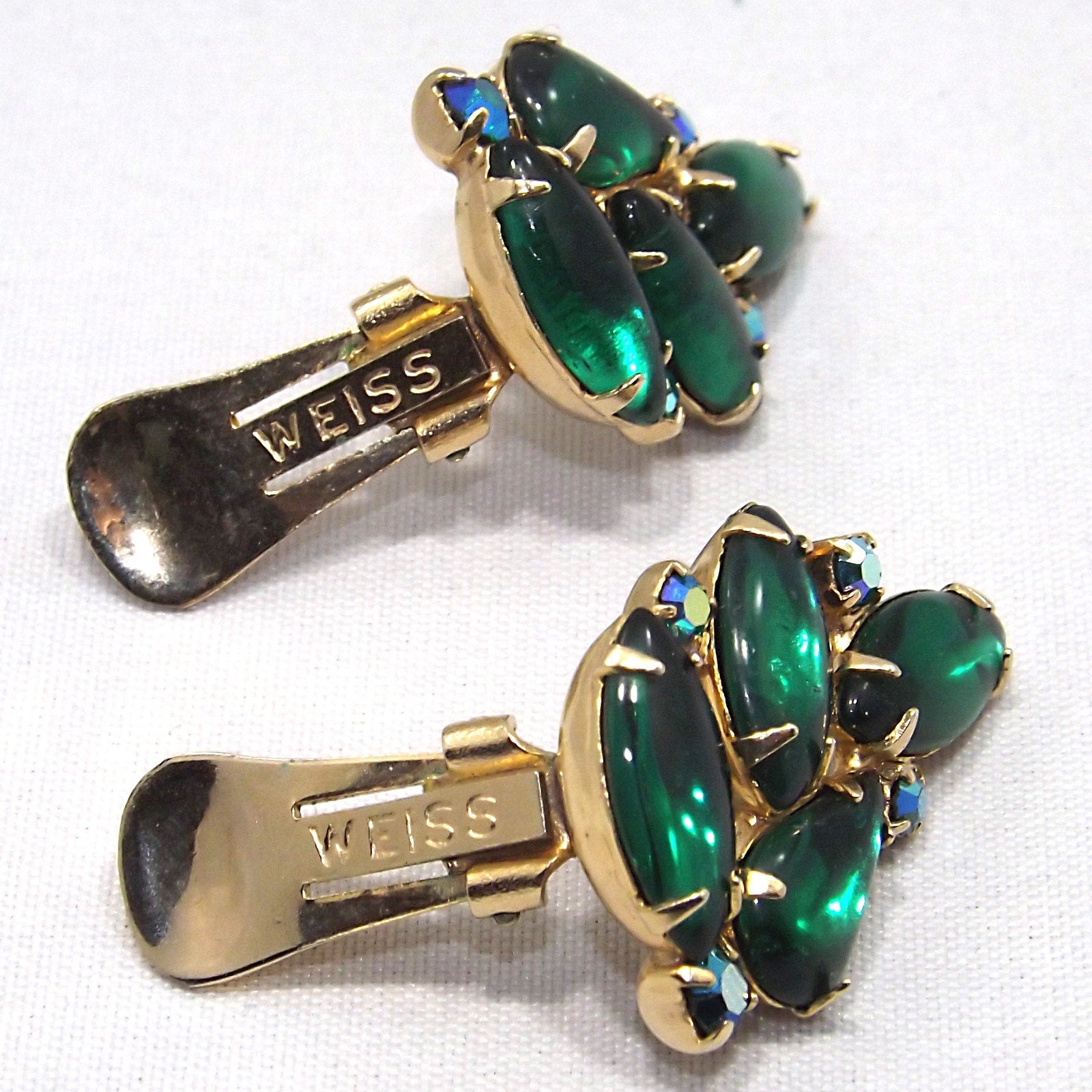 *Description: This is a beautiful pair of emerald green WEISS halo clip earrings with gold plated metal base; acid tested by me with 10K and 14K. These earrings are particularly beautiful because they are designed with emerald green marquise cut cabochons, prong set, then highlighted with green aurora borealis chatons which give a hint of blue as they are moved in the light. The earring clips are stamped WEISS on the back and then on the inside of the clip is stamped Pat Pend. I think you would be very pleased with these earrings. Beautiful color, wonderful designer, highlighted with aurora borealis, and in great vintage condition.