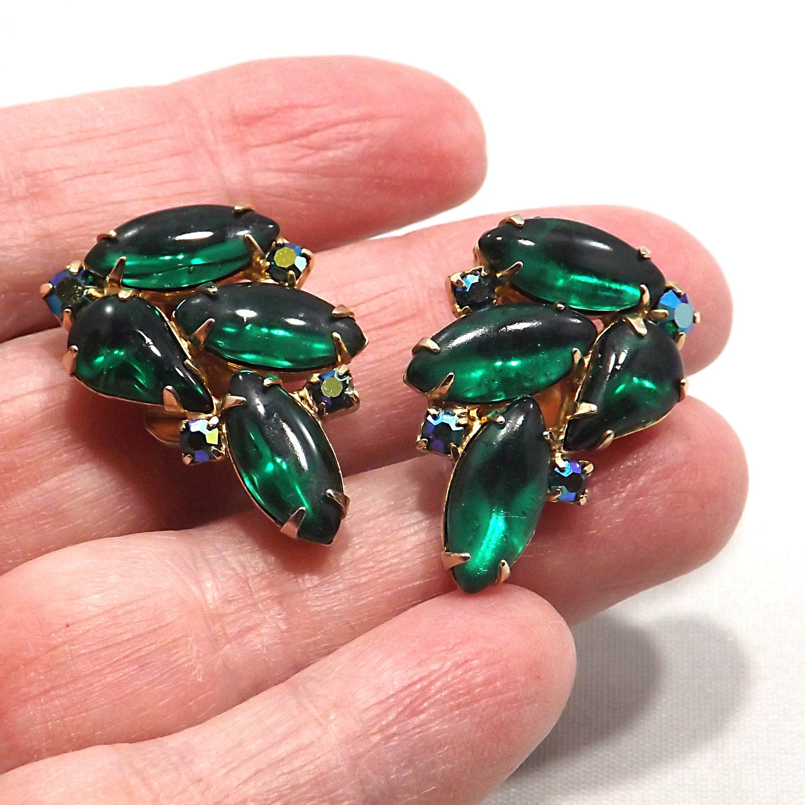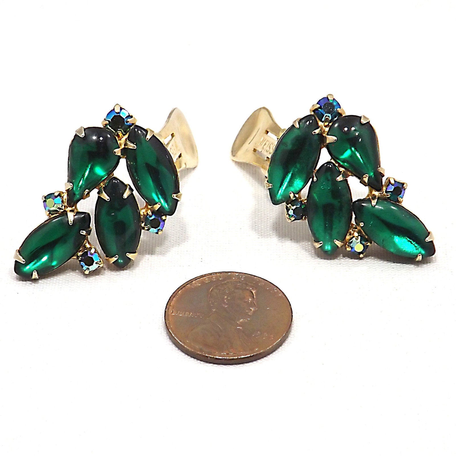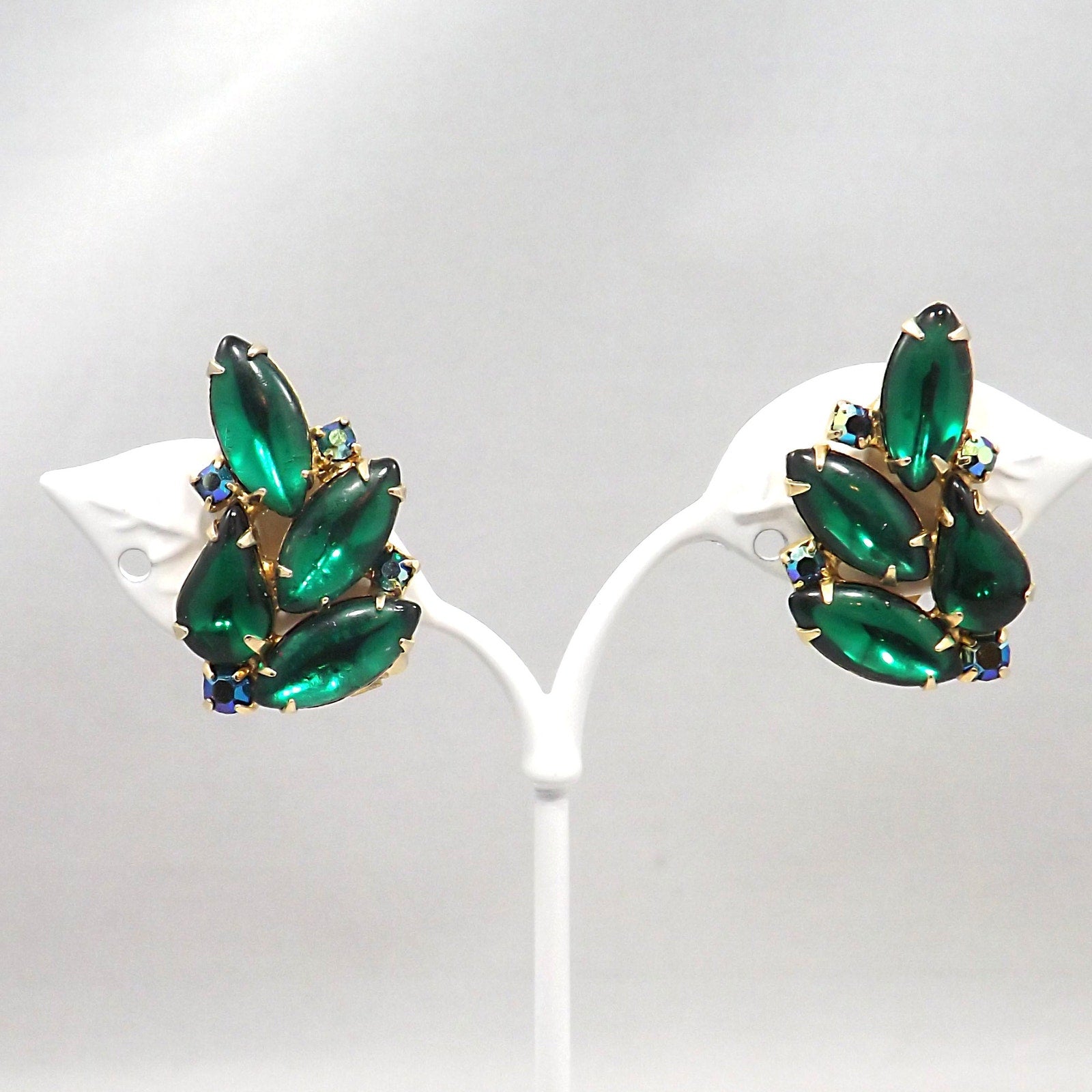 Vintage WEISS Green Clip Earrings Gold Plated Green Aurora Borealis Chaton Rhinestones Emerald Green Marquise Cut Cabochons Vintage Jewelry