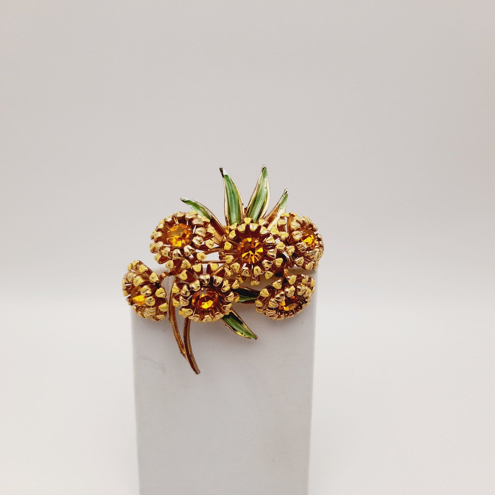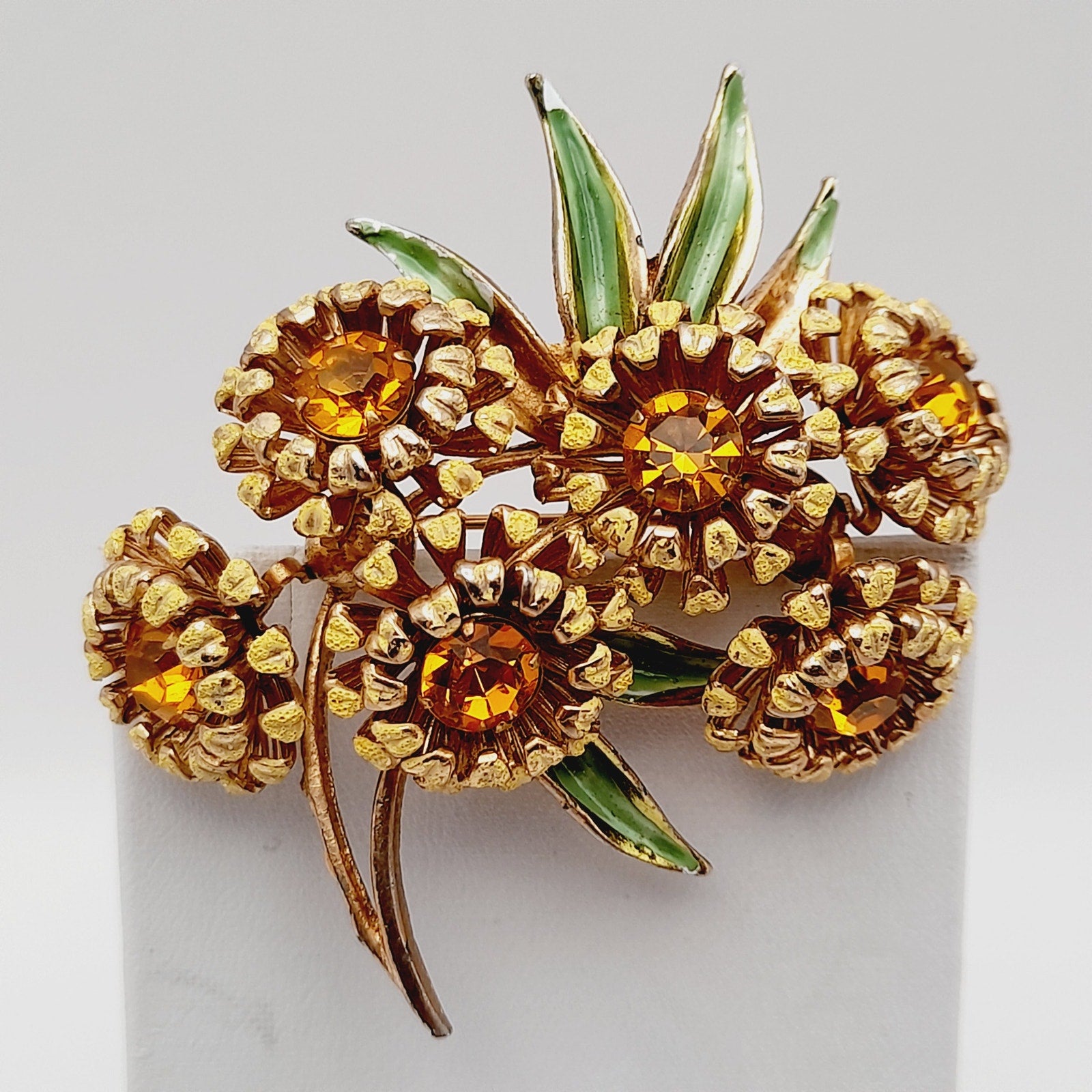 This is a stunning vintage Weiss sunflower brooch from the 1950s, featuring glowing light topaz rhinestones in a sculpted floral cluster design. Each flower is meticulously set with prong-set stones, surrounded by textured gold-tone petals and accented with hand-enameled green leaves for added dimension. The craftsmanship and vibrant warmth of this piece embody Weiss’ signature mid-century glamour.