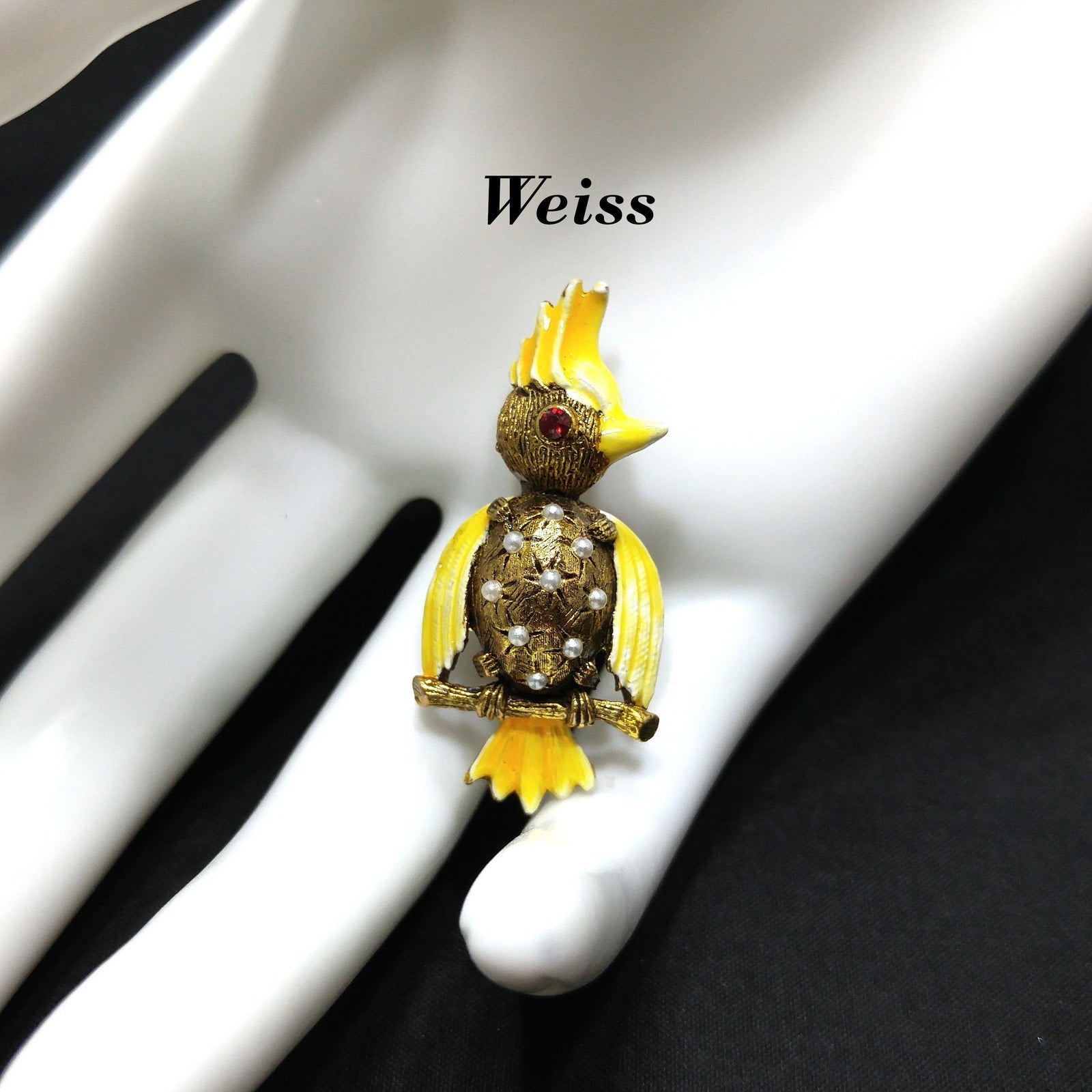 The bird has a textured gold-plated finish, faux seed pearl accents, a bright red rhinestone eye, and beautiful hand-enameled yellow detailing on the crest, wings, beak, and tail. Weiss produced only a small series of enamel figural birds during this era, making this one exceptionally hard to find.