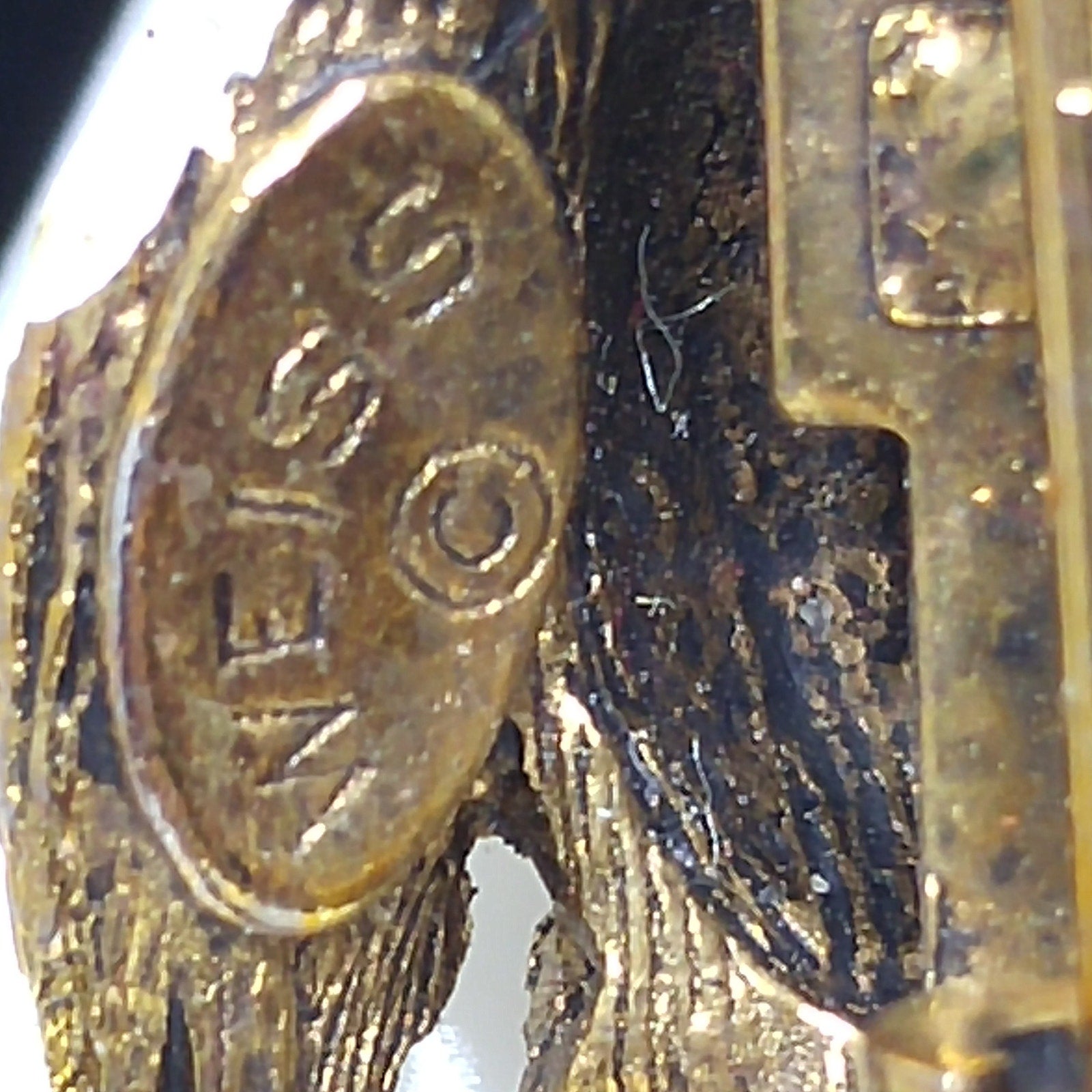 Colors/Stones: Yellow enamel, faux pearls, red rhinestone eye