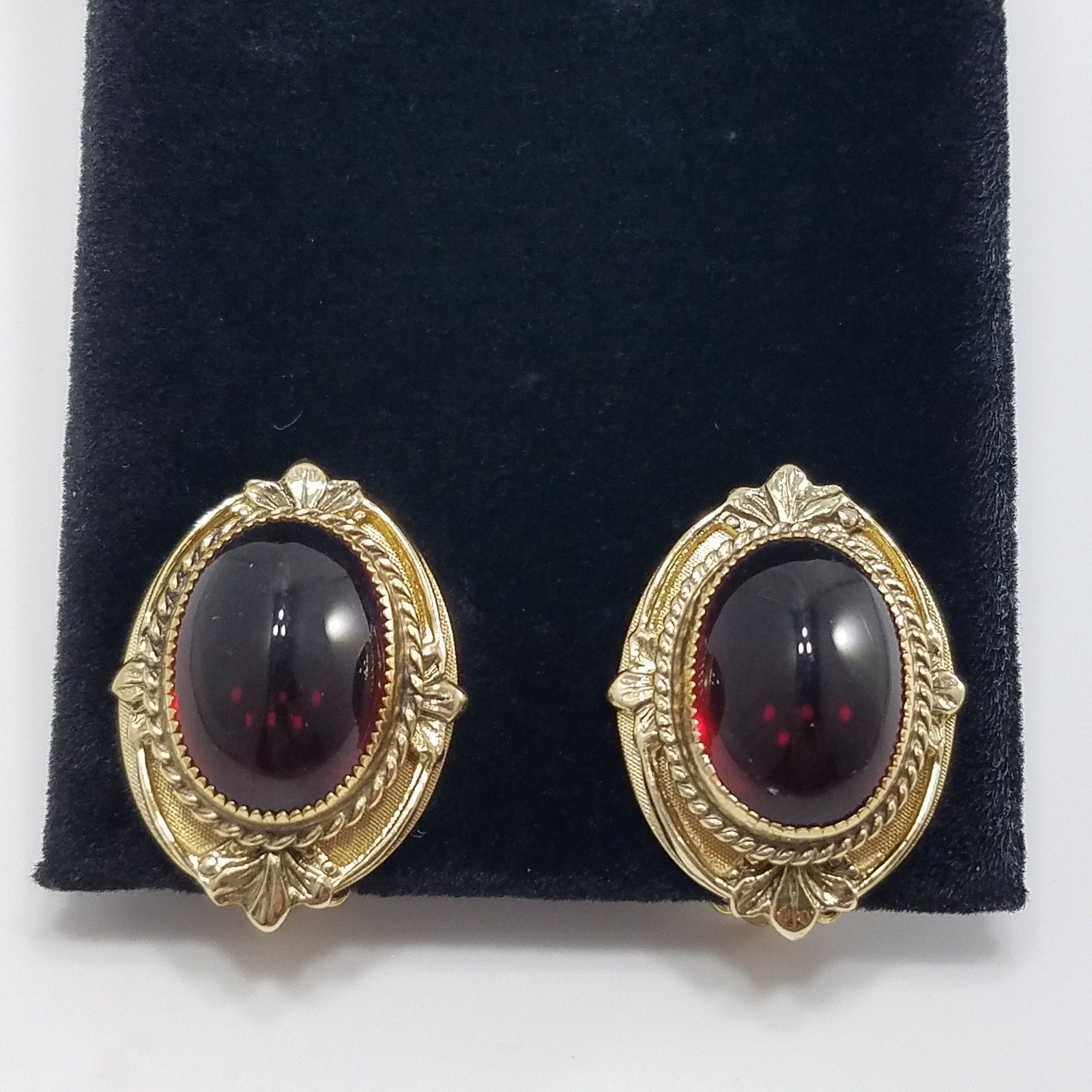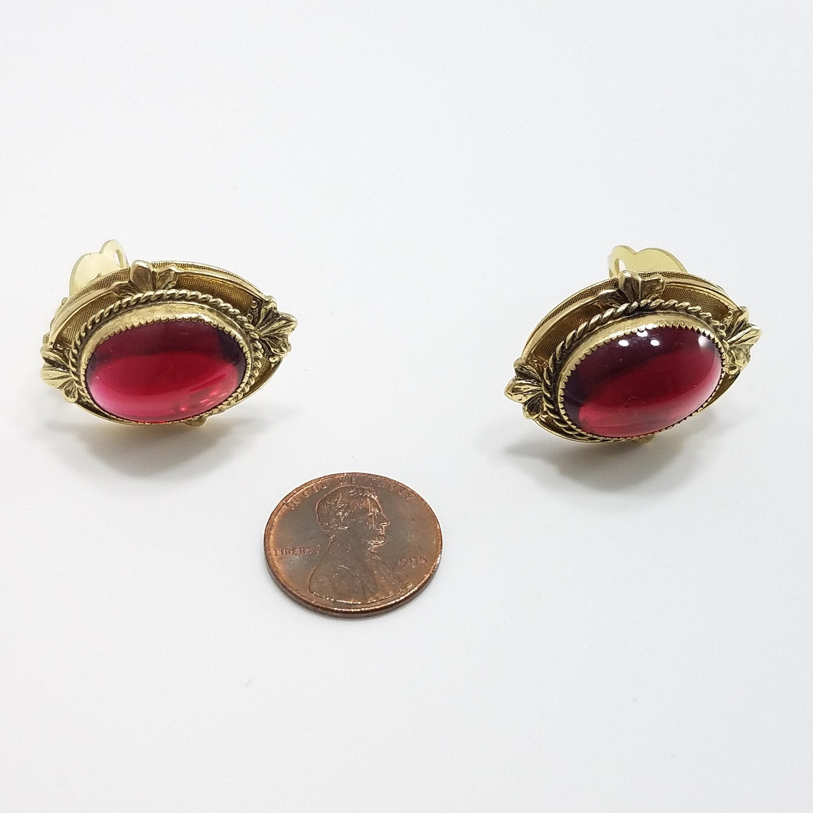 Vintage Whiting & Davis Co Red Gold Clip Earrings 1960s Gold Tone, Red Cabochon
