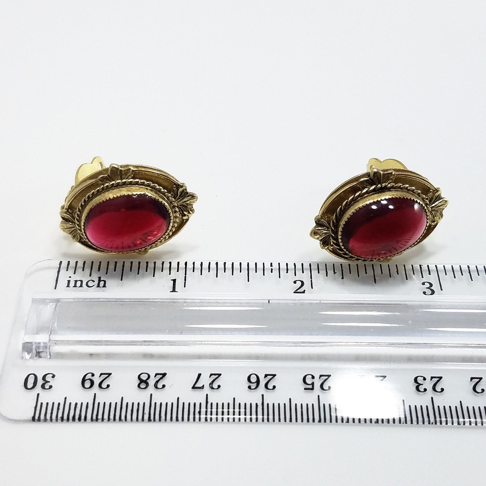Vintage Whiting & Davis Co Red Gold Clip Earrings 1960s Gold Tone with Large Red Cabochon Bevel Set Open Back Vintage Clip Earrings Jewelry