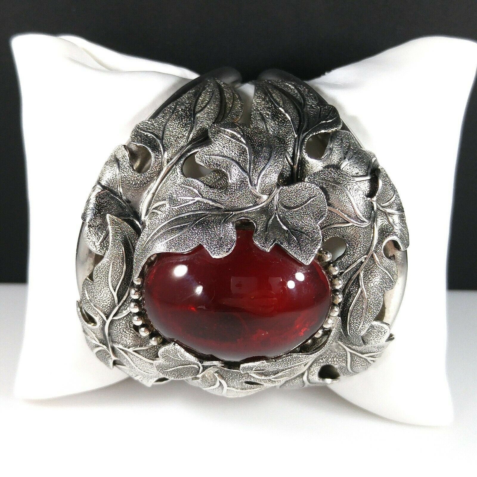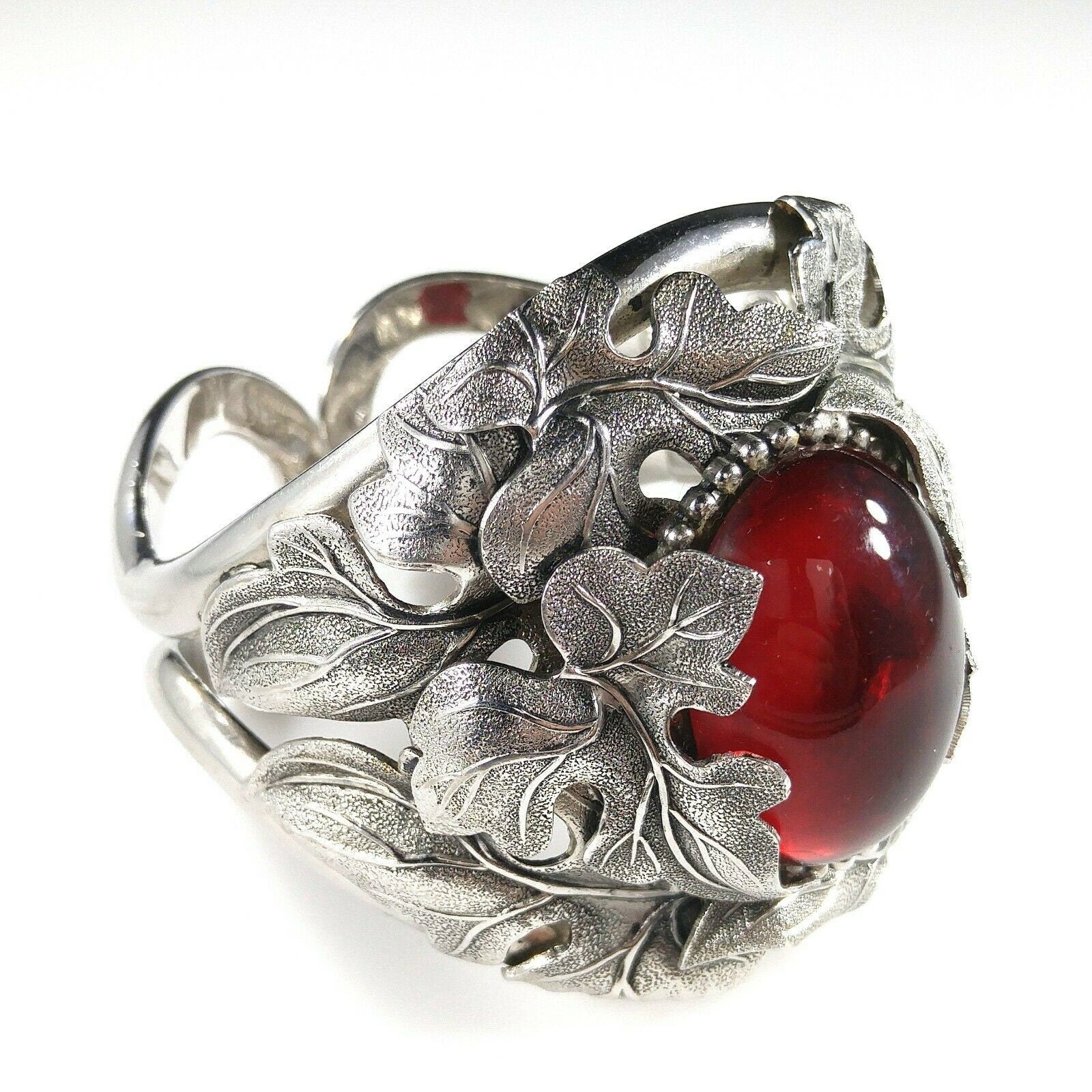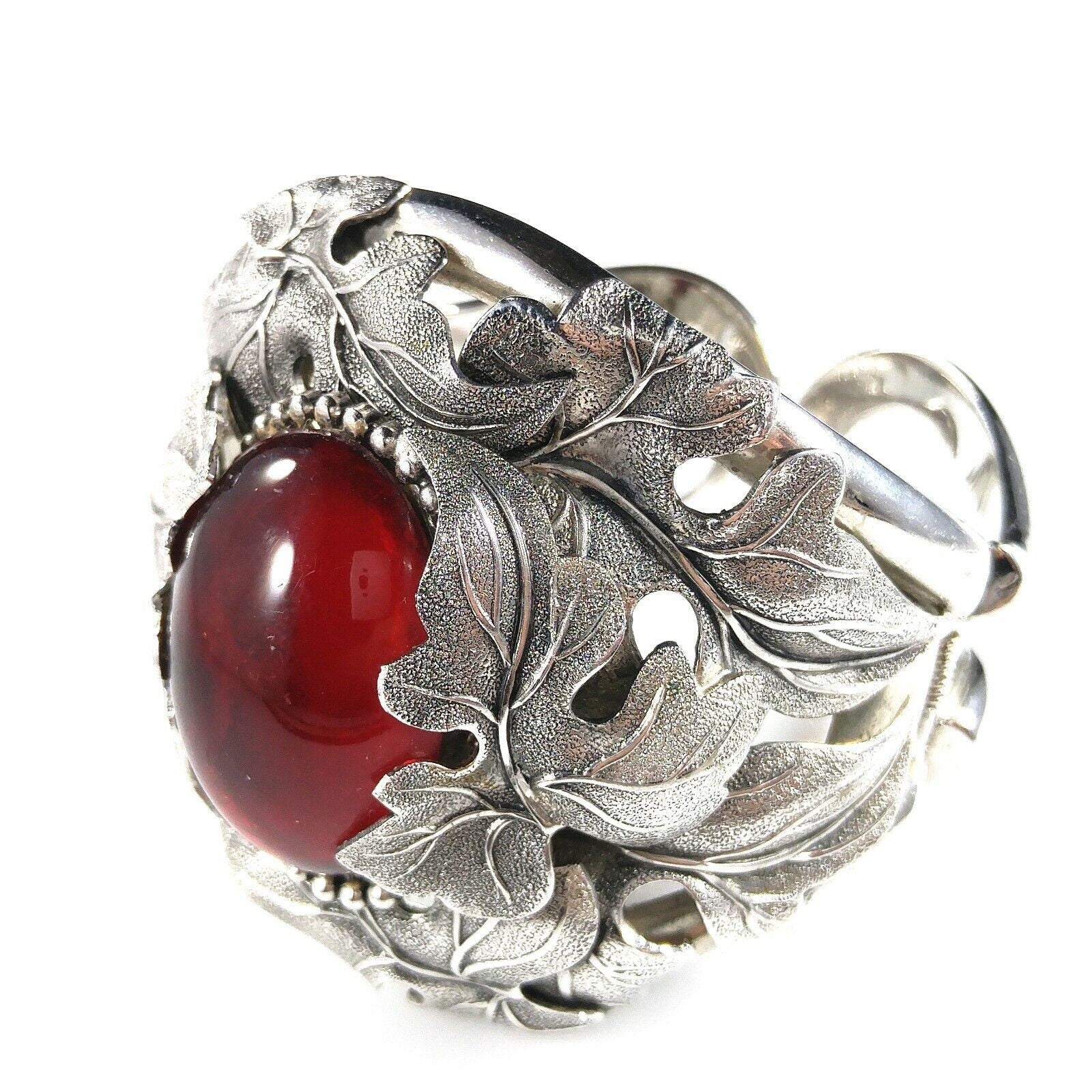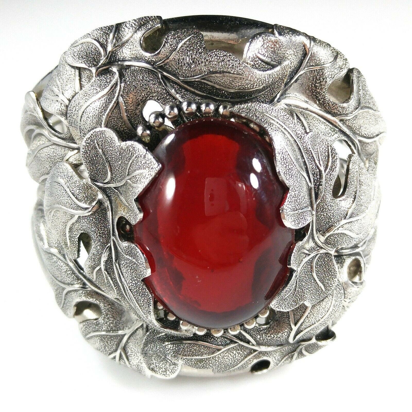 *Description: This is a beautiful and unique Whiting and Davis floral rhodium plated large cuff bracelet with a large red cabochon center from the 1960s. The matching necklace is featured in costume Jewelry 202 by Julia C Carroll on page 473. One side of the cuff bracelet is hinged, not both. The leaves are overlapping around the red stone. It is an heirloom piece. This would be a great addition to your vintage jewelry collection or make a great vintage gift!