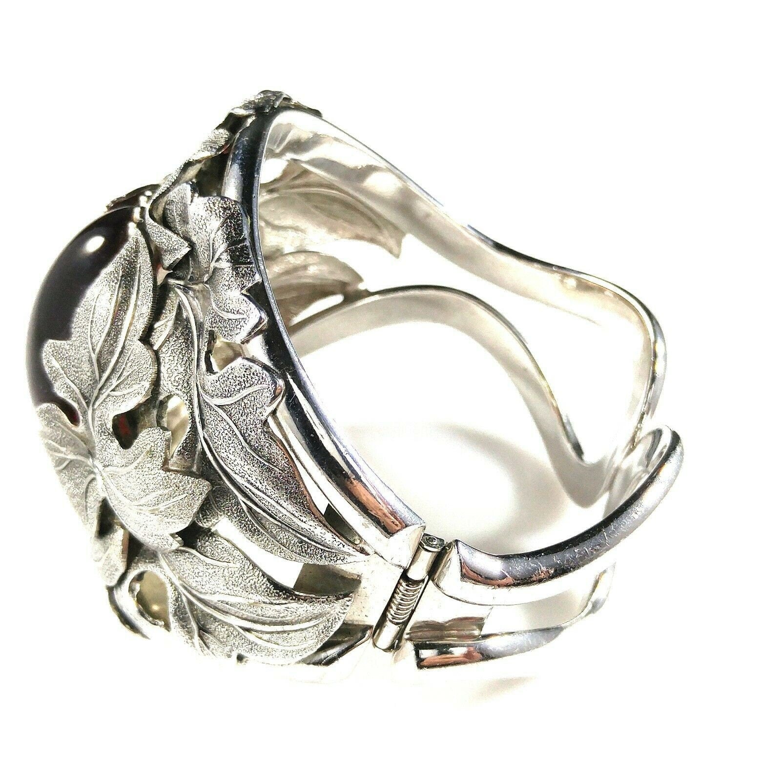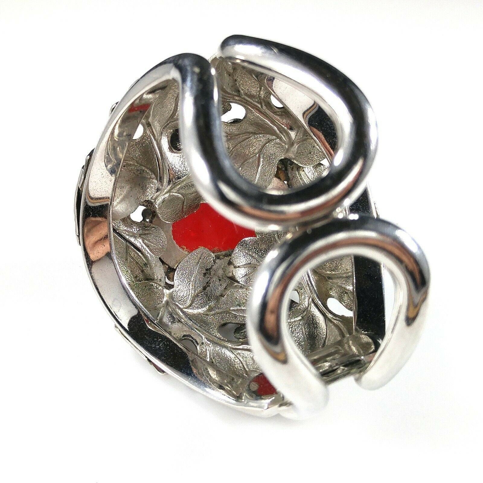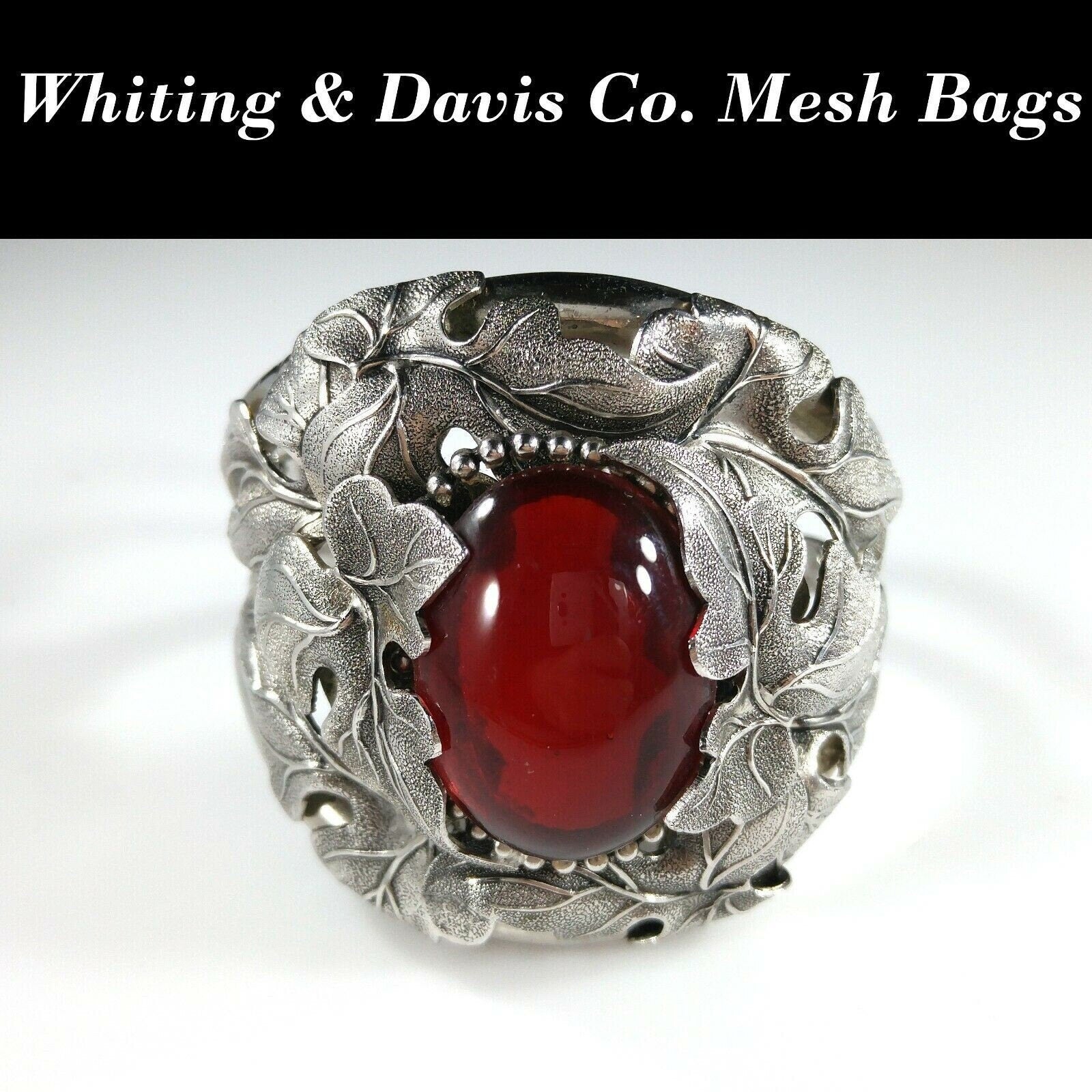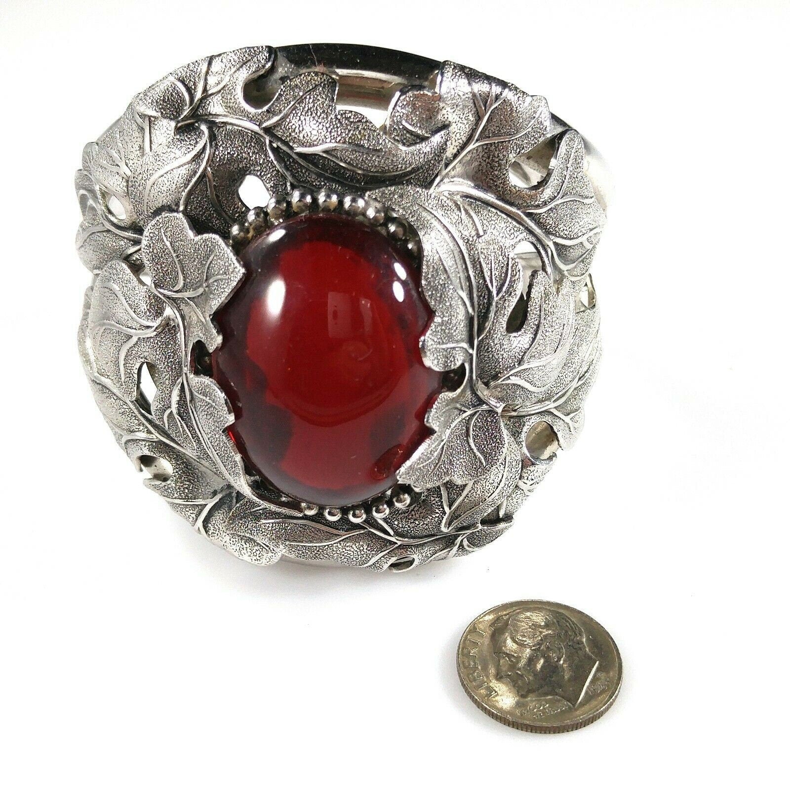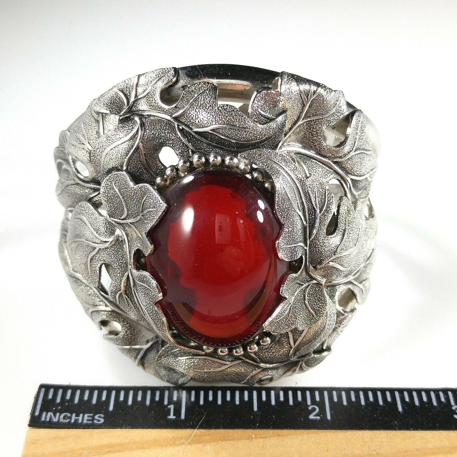 *Description: This is a beautiful and unique Whiting and Davis floral rhodium plated large cuff bracelet with a large red cabochon center from the 1960s. The matching necklace is featured in costume Jewelry 202 by Julia C Carroll on page 473. One side of the cuff bracelet is hinged, not both. The leaves are overlapping around the red stone. It is an heirloom piece. This would be a great addition to your vintage jewelry collection or make a great vintage gift!