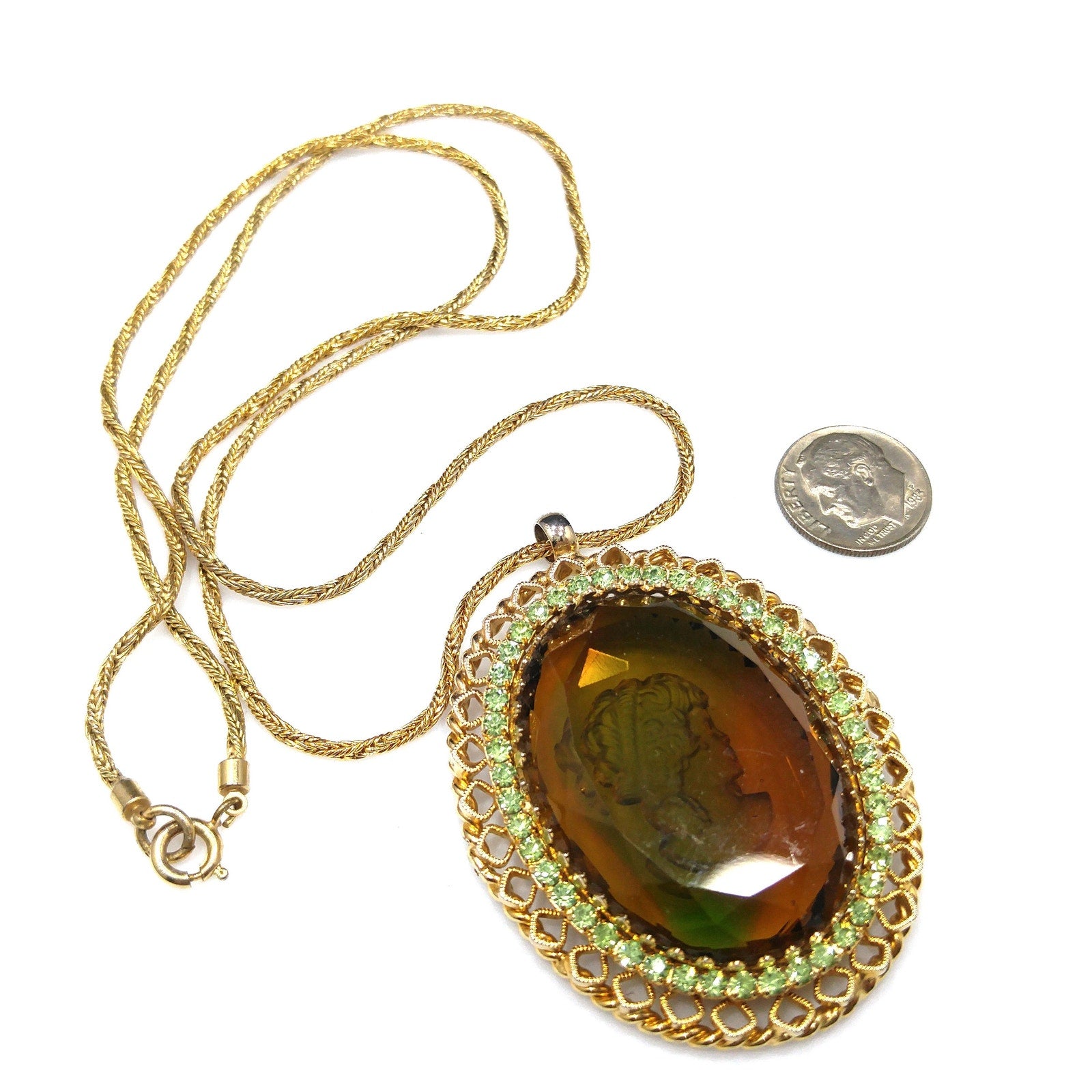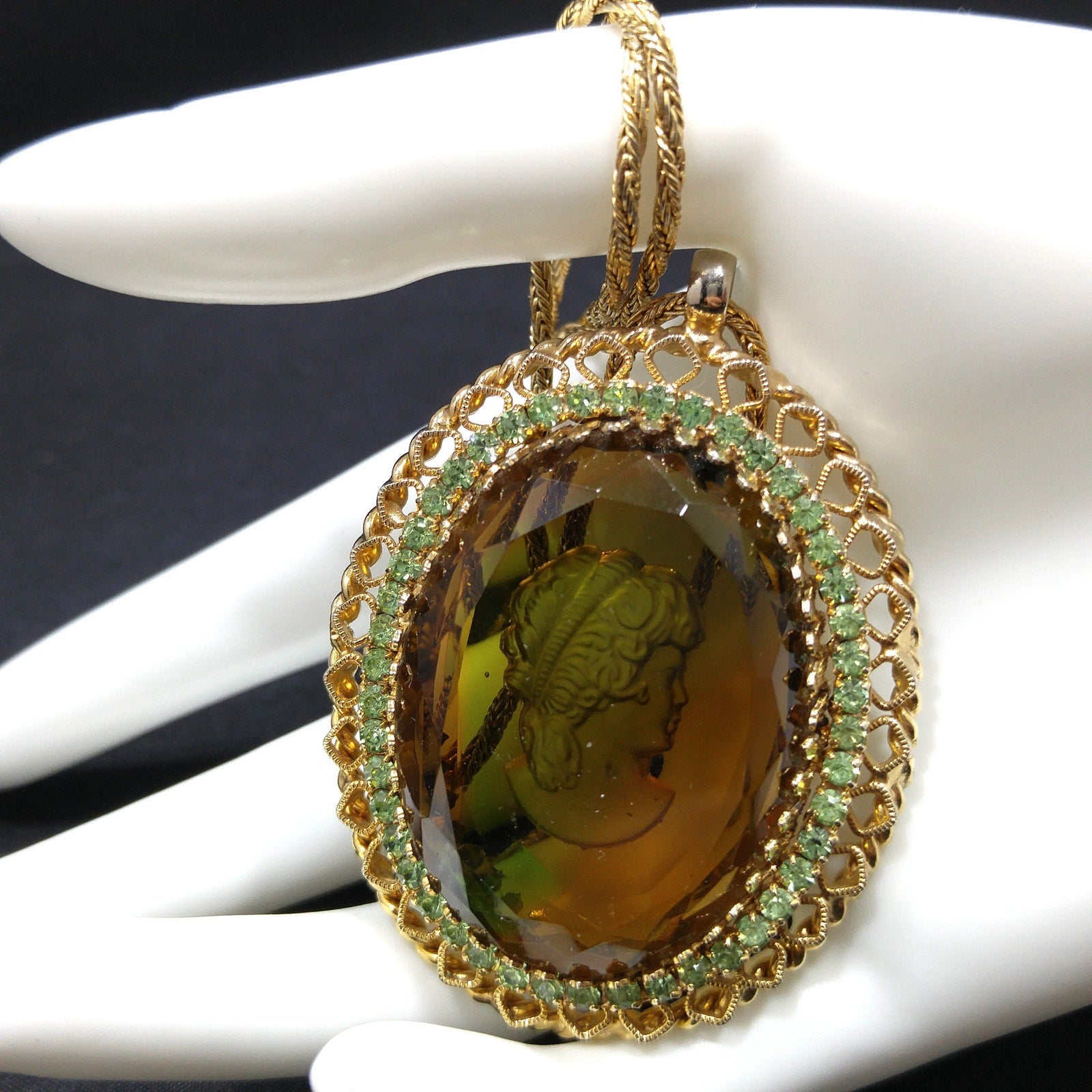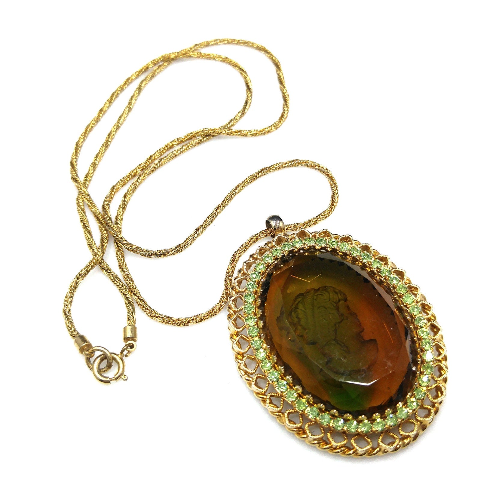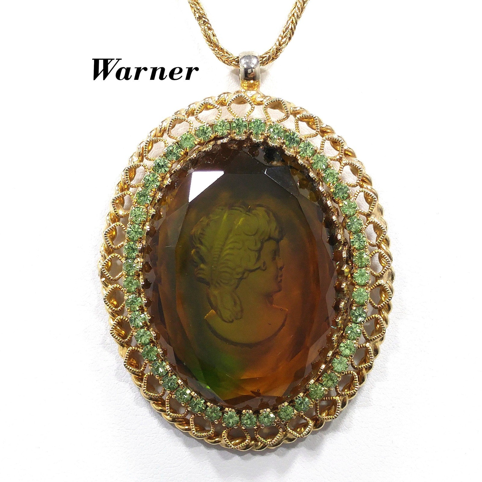*Description: This is a beautiful Warner intaglio cameo pendant necklace with peridot green rhinestones framing the cameo on a twisted rope chain from the 1960s. The necklace is gold plated and five of the peridot rhinestones are uranium glass. See last photo for details. This would be great necklace for your cameo collection and it would be a great addition to your vintage jewelry collection or make a great vintage gift!