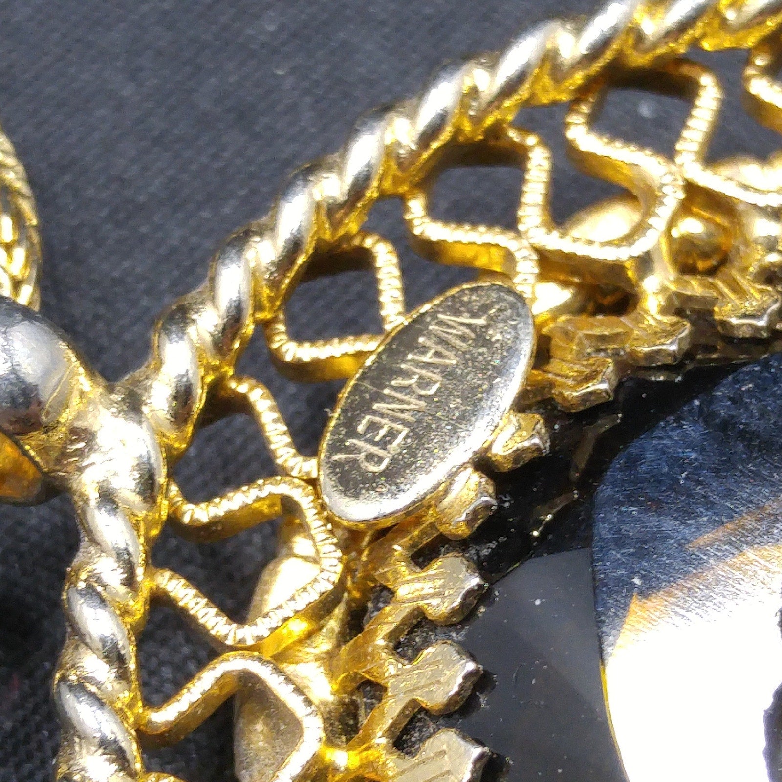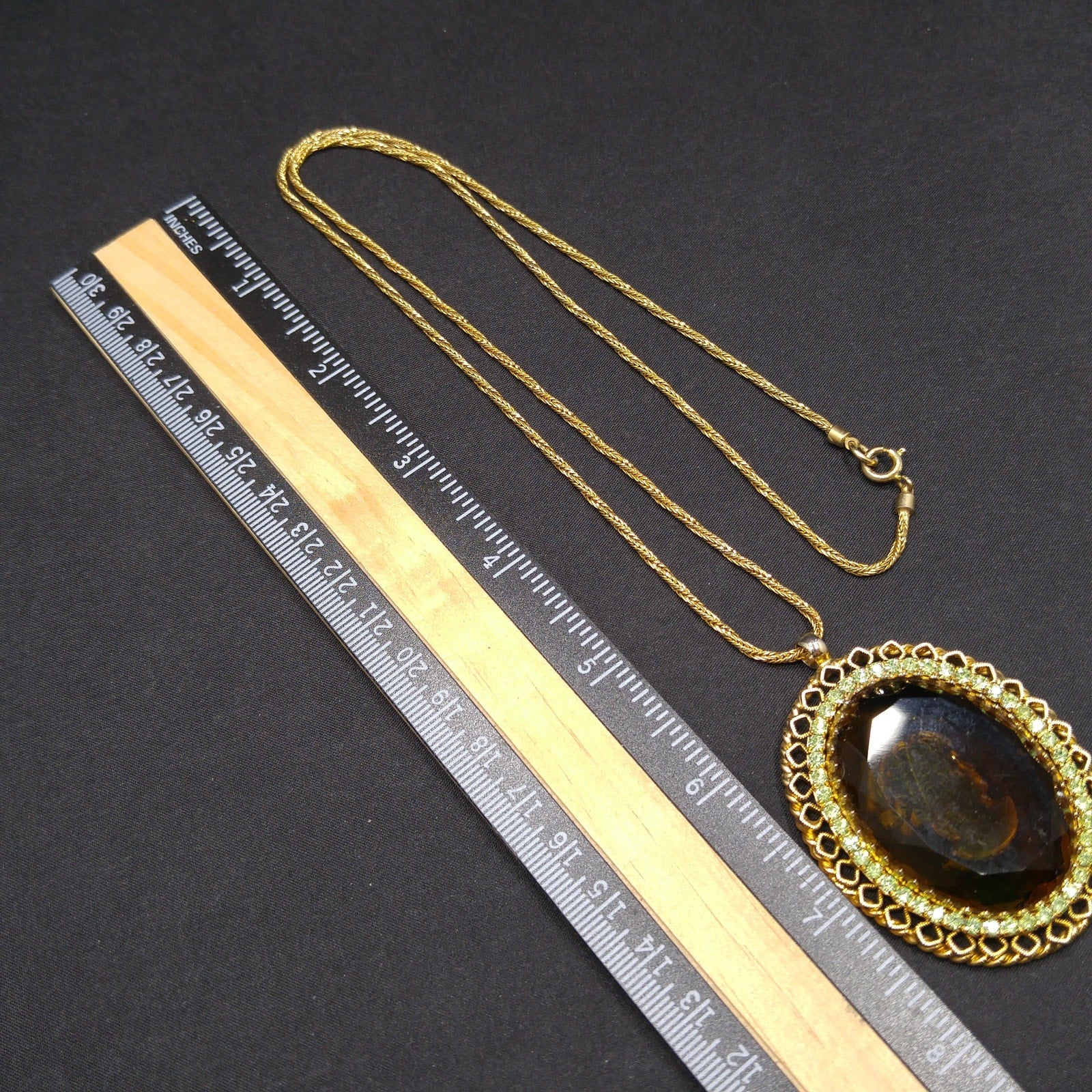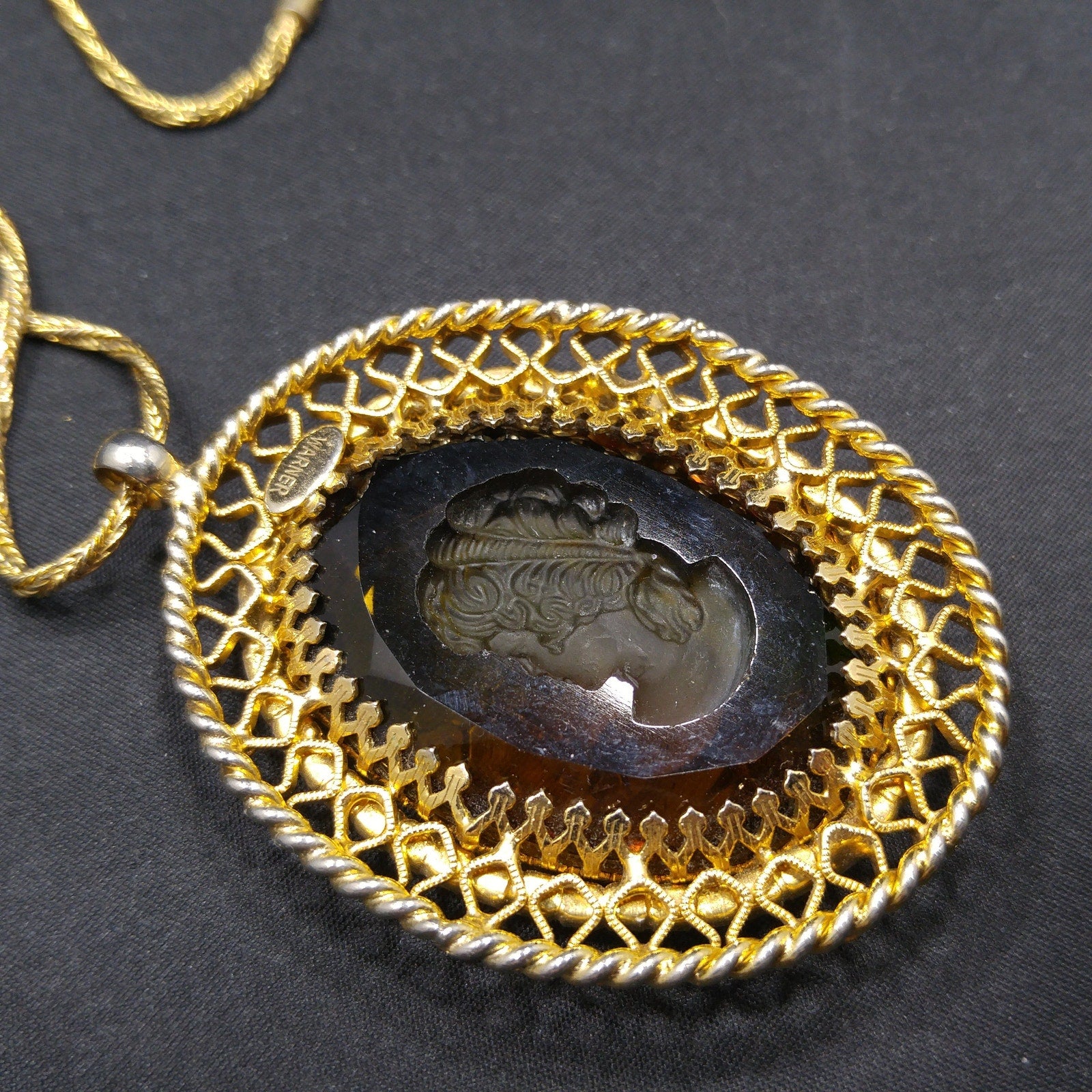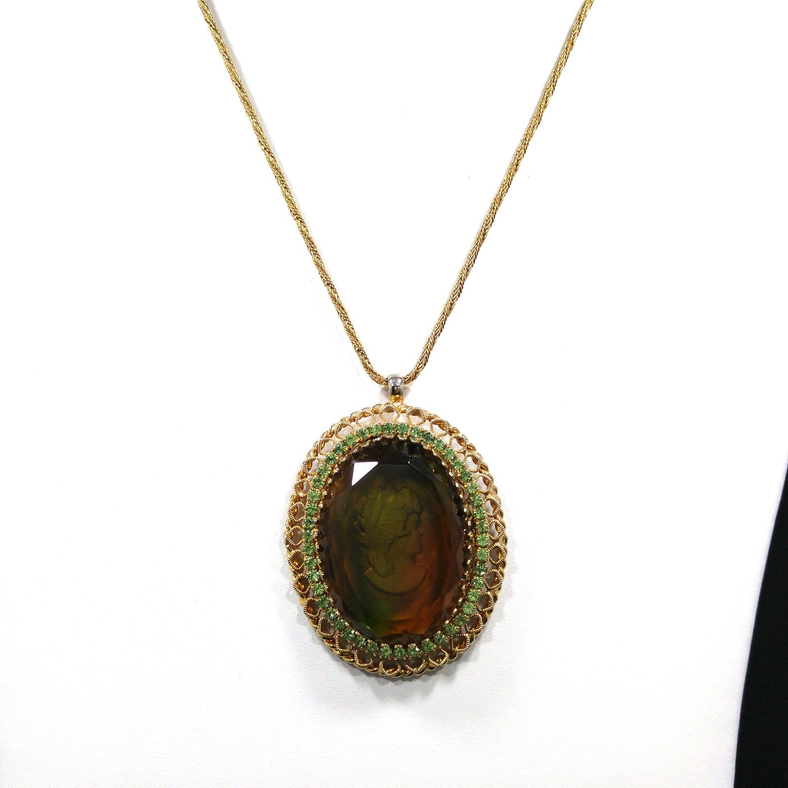 *Description: This is a beautiful Warner intaglio cameo pendant necklace with peridot green rhinestones framing the cameo on a twisted rope chain from the 1960s. The necklace is gold plated and five of the peridot rhinestones are uranium glass. See last photo for details. This would be great necklace for your cameo collection and it would be a great addition to your vintage jewelry collection or make a great vintage gift!