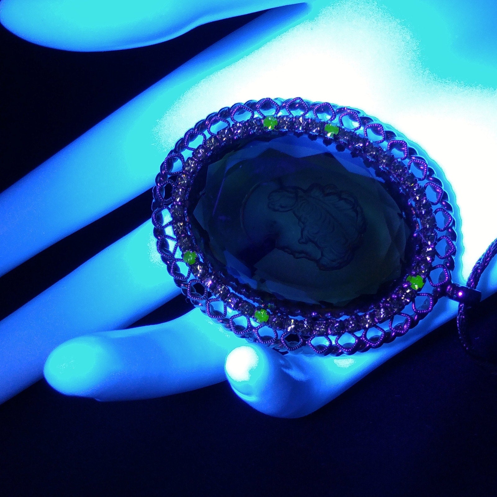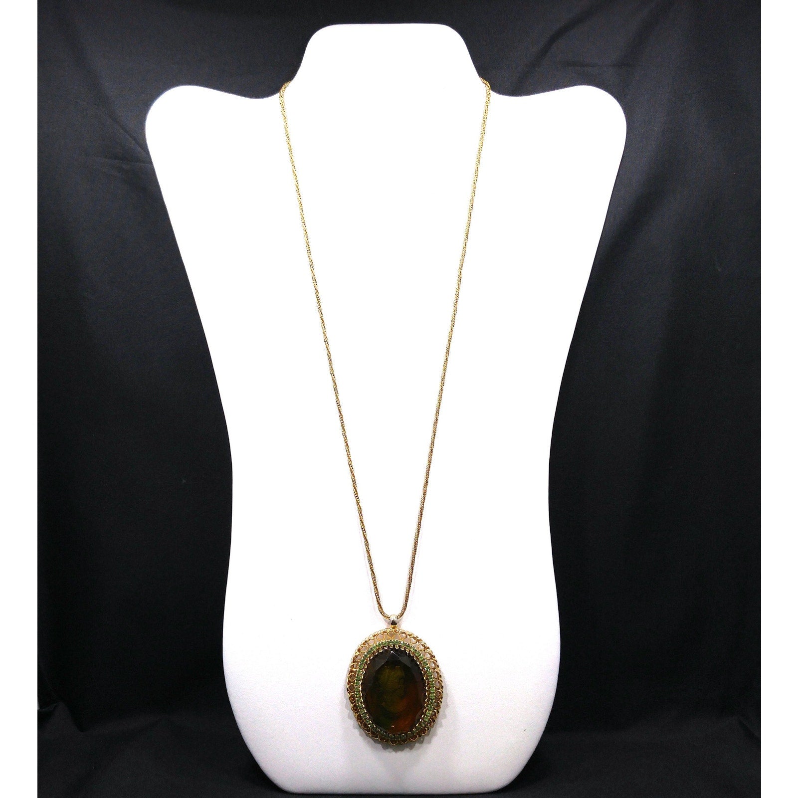 Warner Cameo Intaglio Pendant Necklace, Peridot Rhinestones, 5 Uranium Glass, 1960s Vintage Jewelry