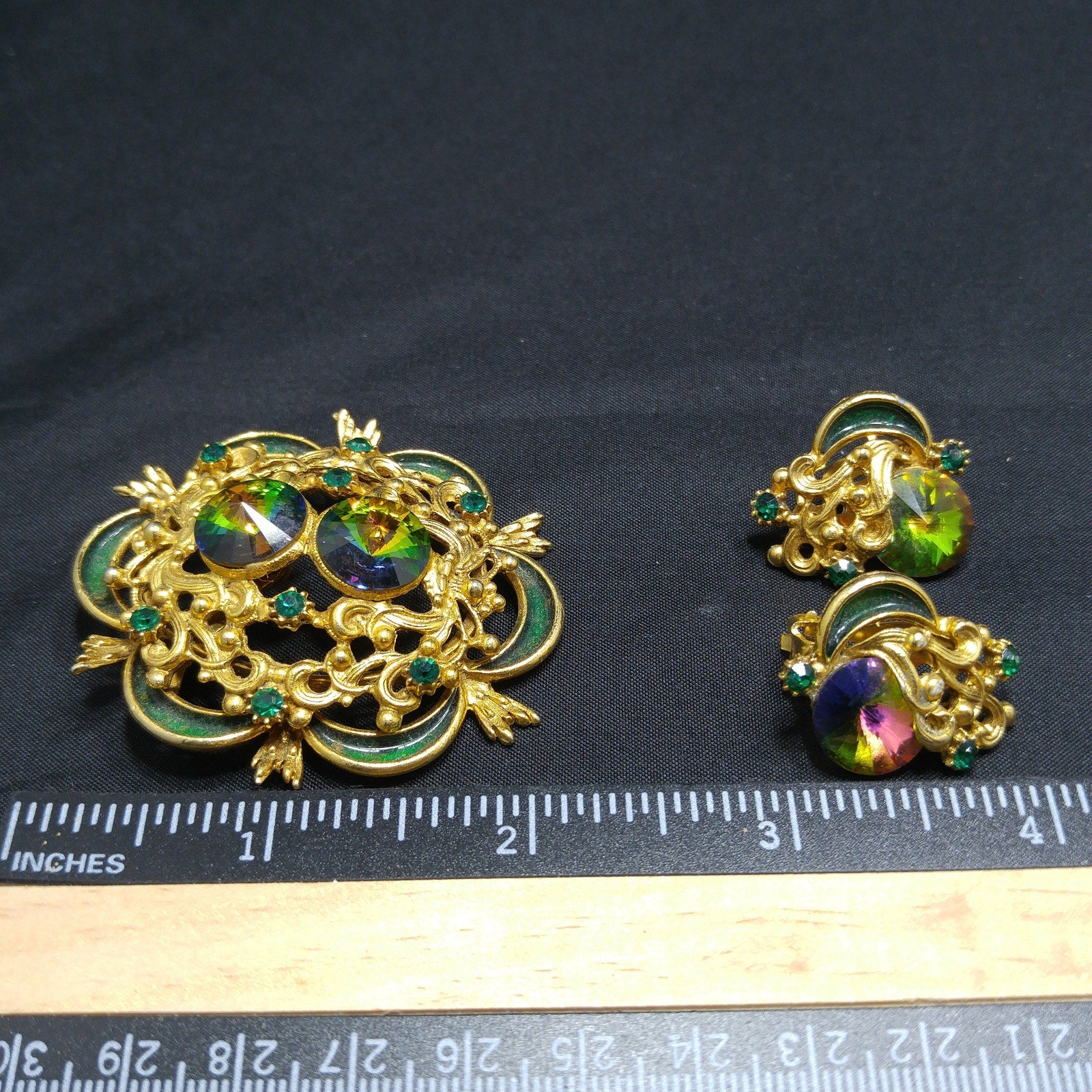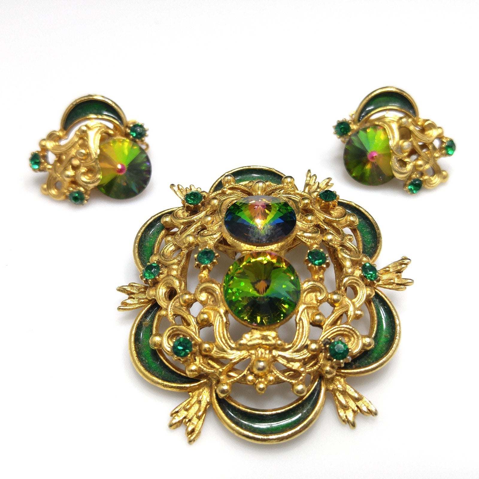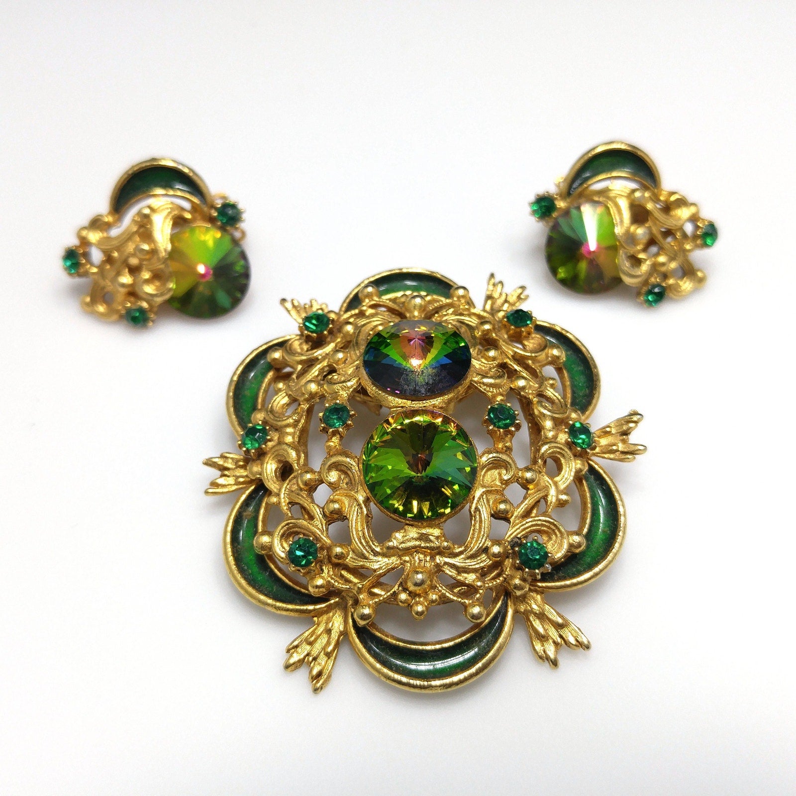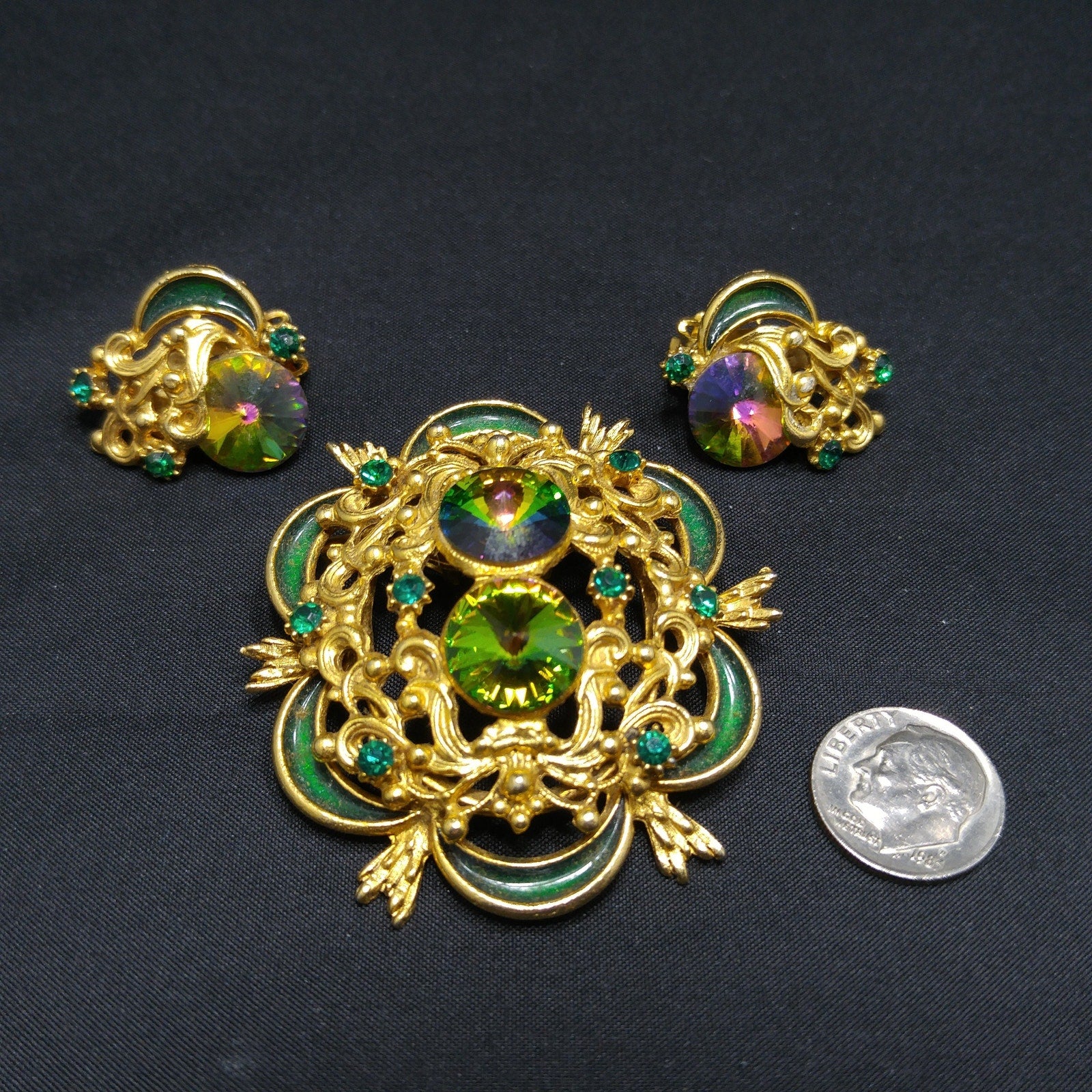 *Description: This is a beautiful green watermelon rivoli rhinestone brooch and matching clip earring set from the 1960s. In addition to the watermelon rhinestones, you also have emerald green rhinestone chatons and green enamel on a gold plated setting. The back of the brooch has the V raised rivet holding the clasp with a rolling c pin on the back. The earrings are clips which securely close. This is a great vintage set and would be a great addition to your vintage jewelry collection or make a great vintage gift!