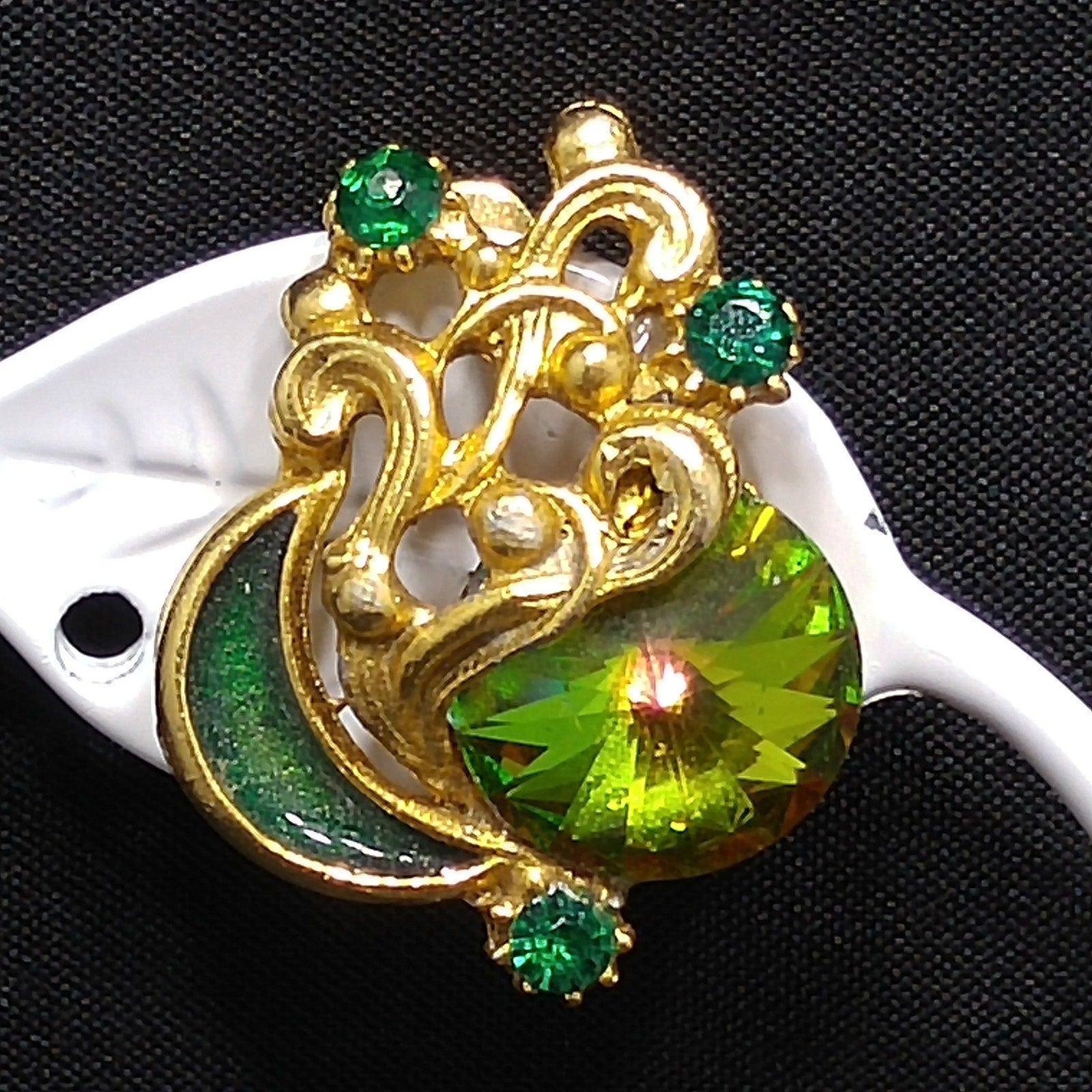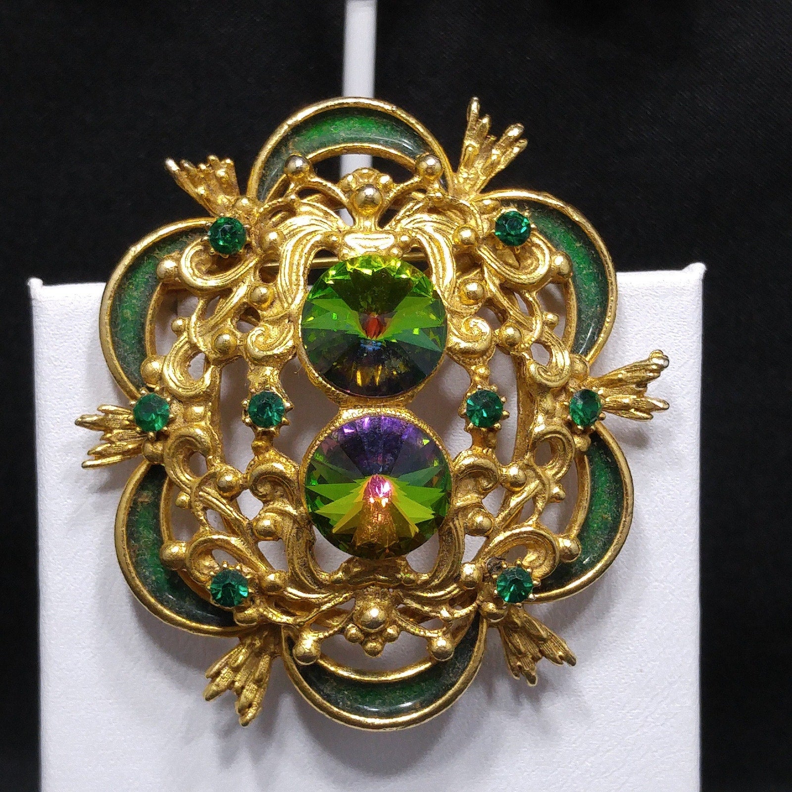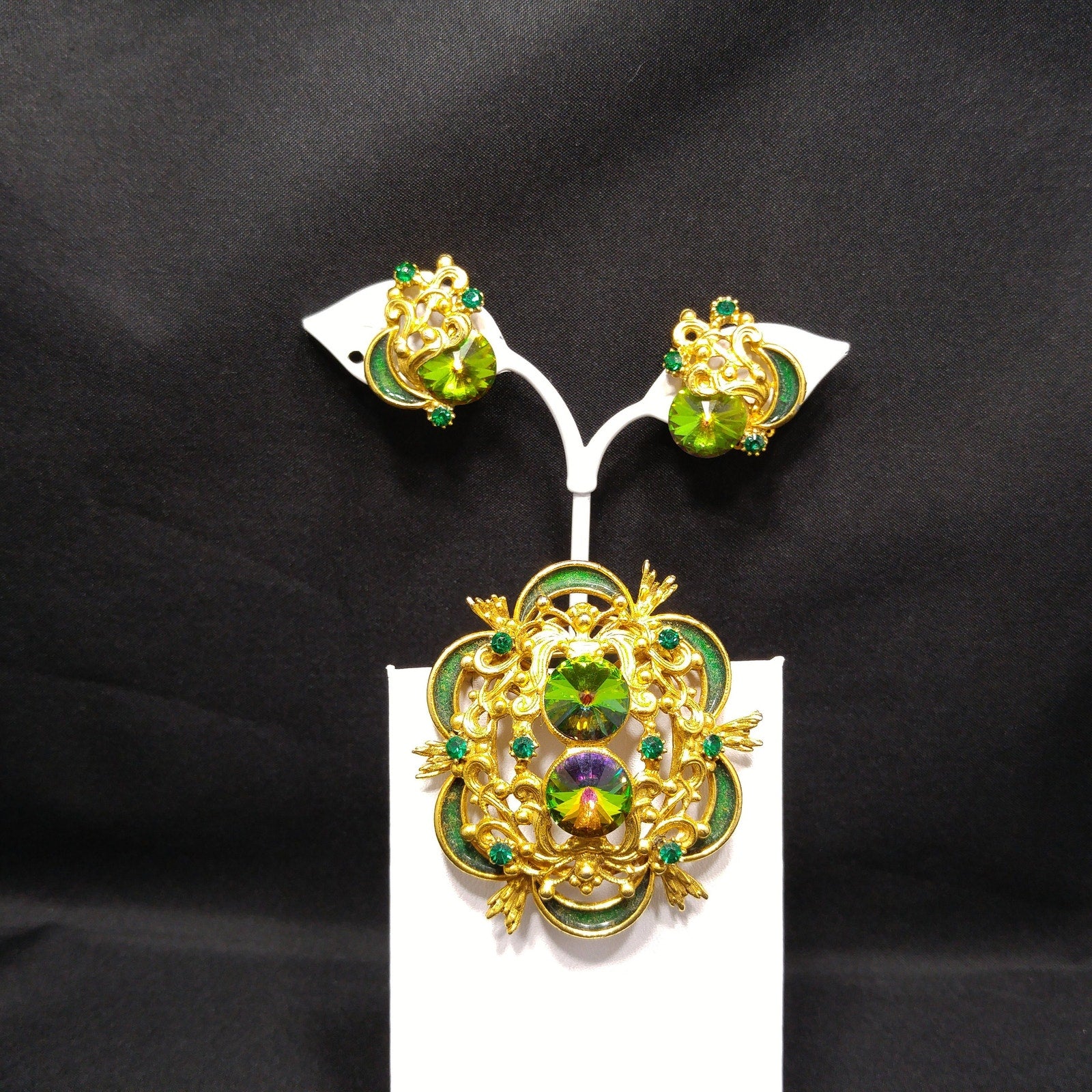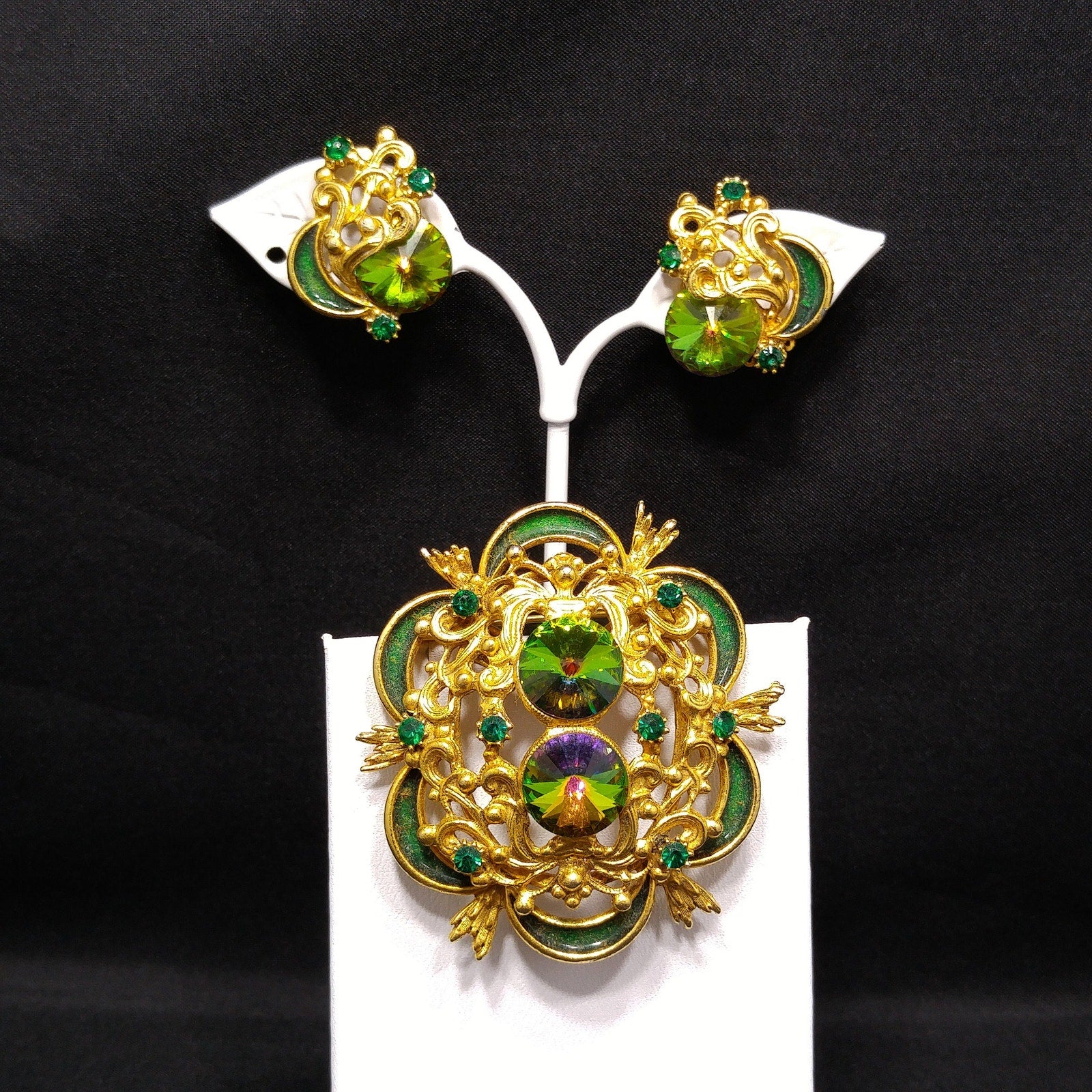 *Description: This is a beautiful green watermelon rivoli rhinestone brooch and matching clip earring set from the 1960s. In addition to the watermelon rhinestones, you also have emerald green rhinestone chatons and green enamel on a gold plated setting. The back of the brooch has the V raised rivet holding the clasp with a rolling c pin on the back. The earrings are clips which securely close. This is a great vintage set and would be a great addition to your vintage jewelry collection or make a great vintage gift!