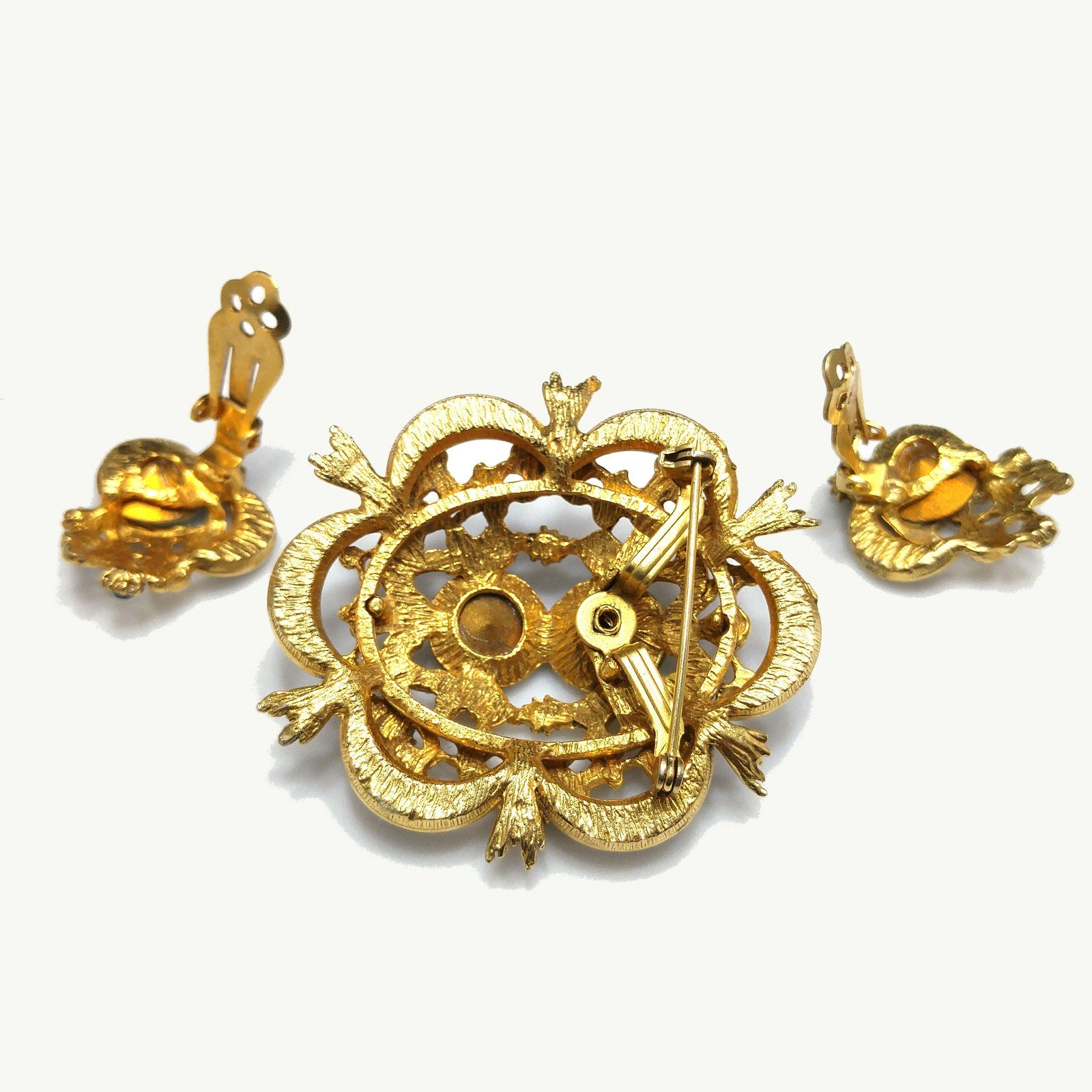 Watermelon Rivoli Rhinestone Brooch & Earrings, Gold Plated, 1960s Vintage Jewelry