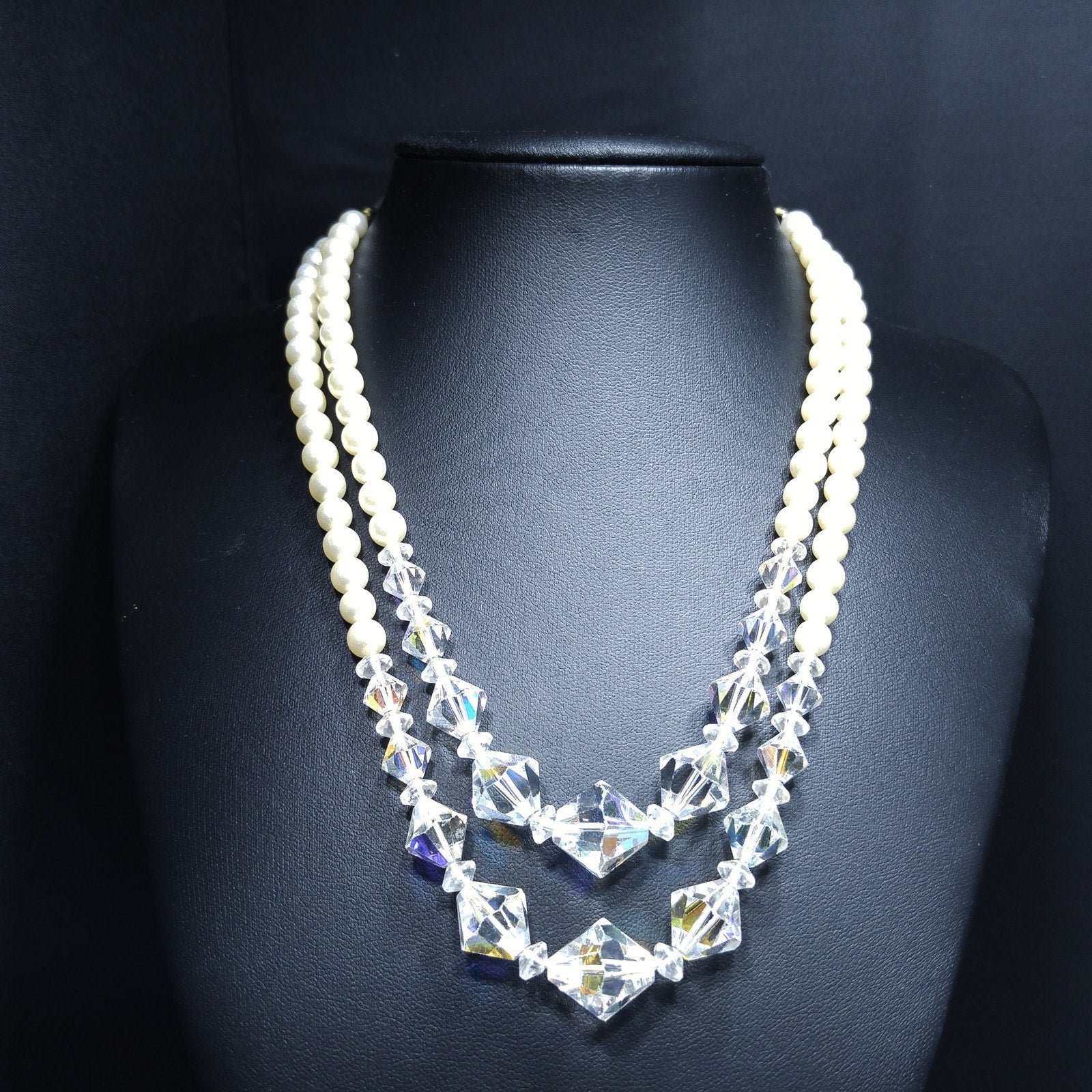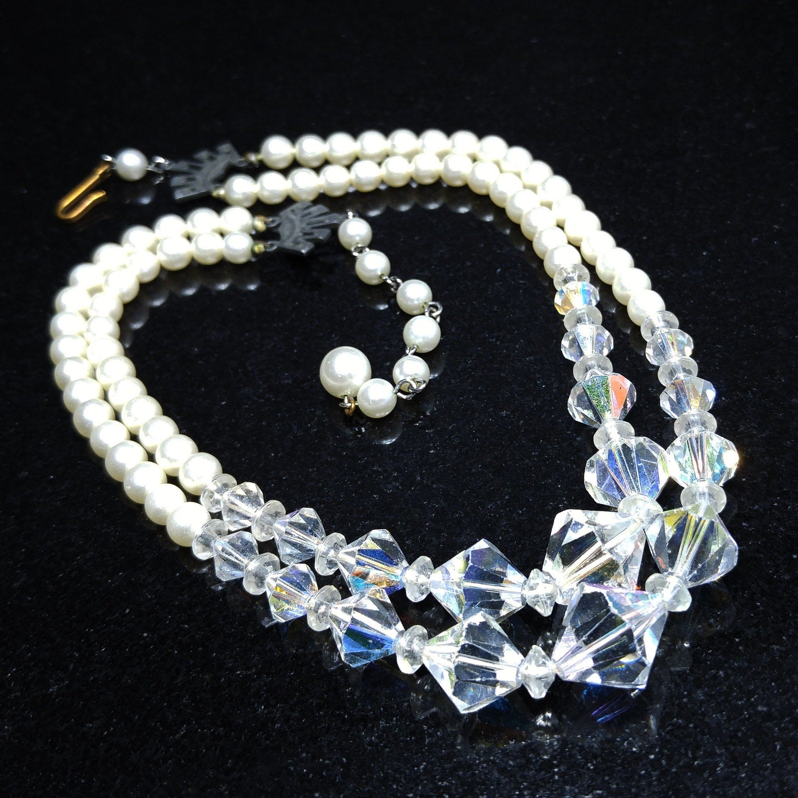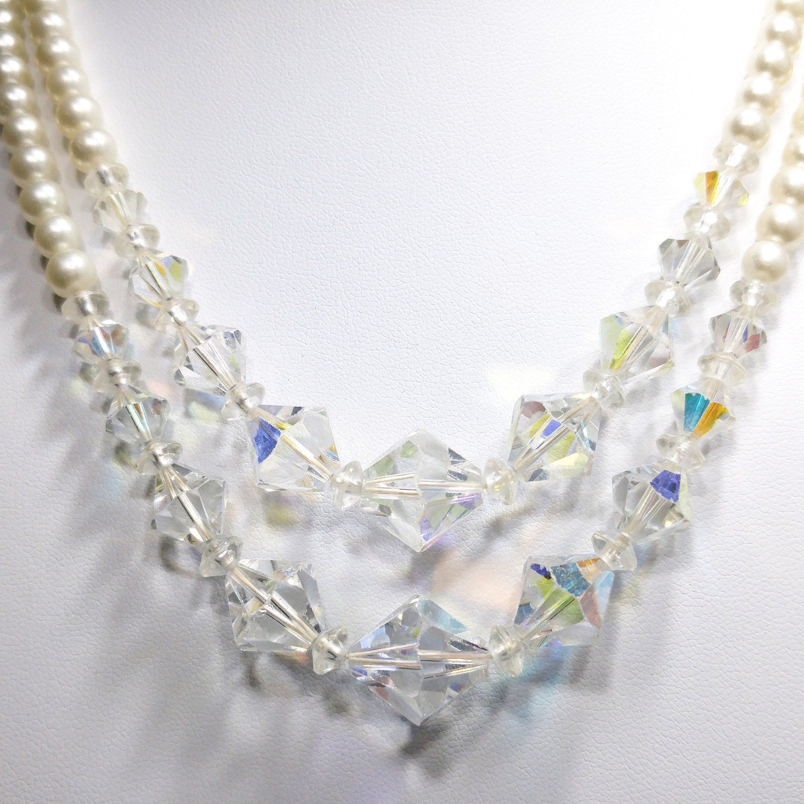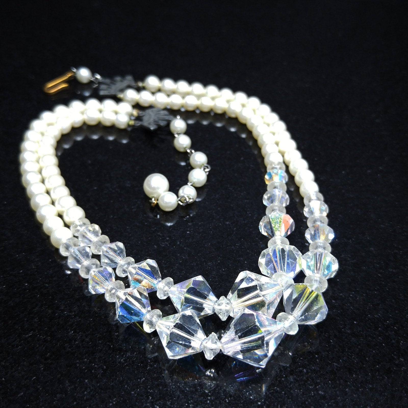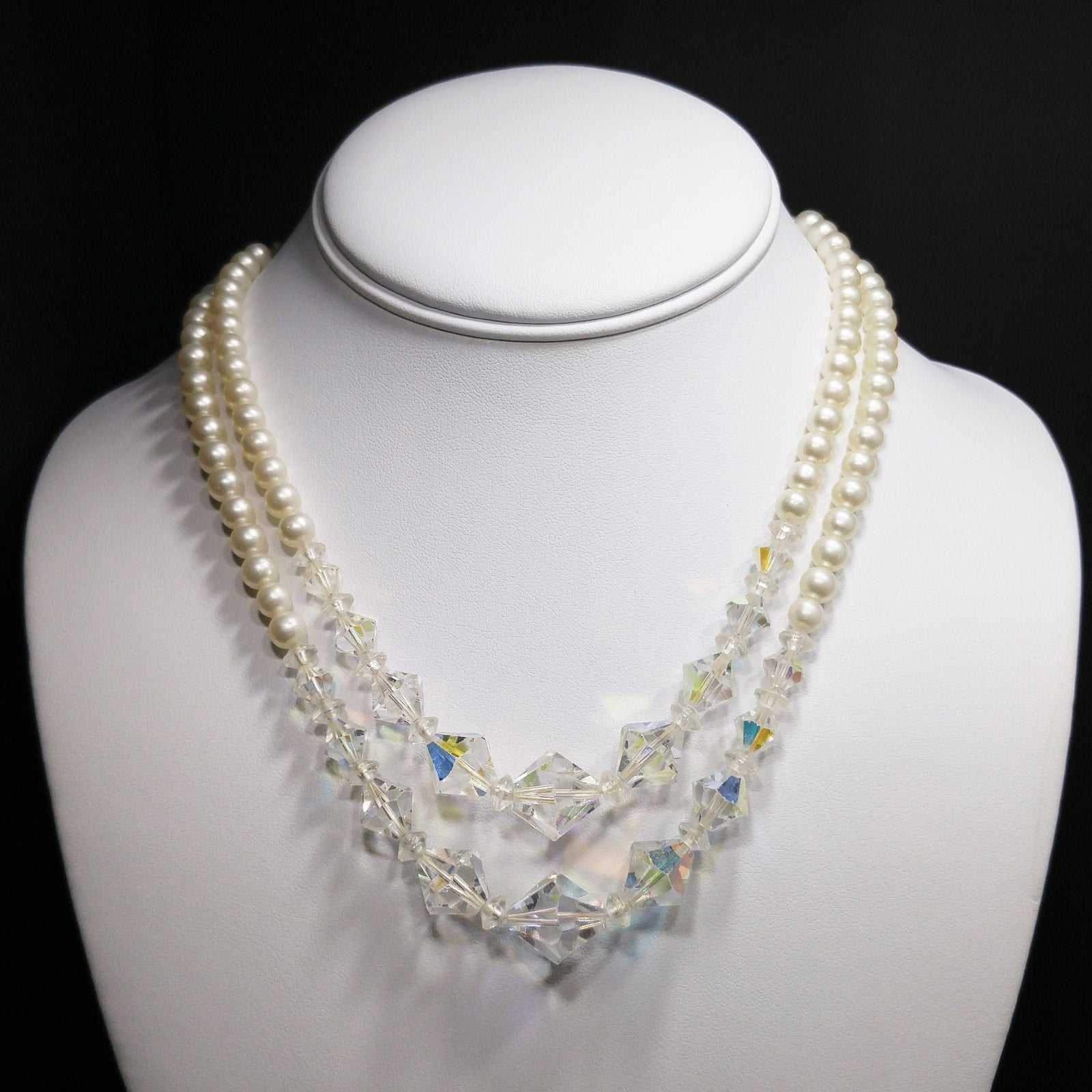 *Description: This is a beautiful vintage crystal and faux pearl necklace in circulation around the mid-1950s. There are two strands of flowing beads and the crystal aurora borealis clear bicone crystal beads fall in the front of both strands. This would be a beautiful wedding, bridesmaid, or wedding party necklace and also any other formal event. This necklace would also make a great vintage gift. Perfect for "something old" and something beautiful!