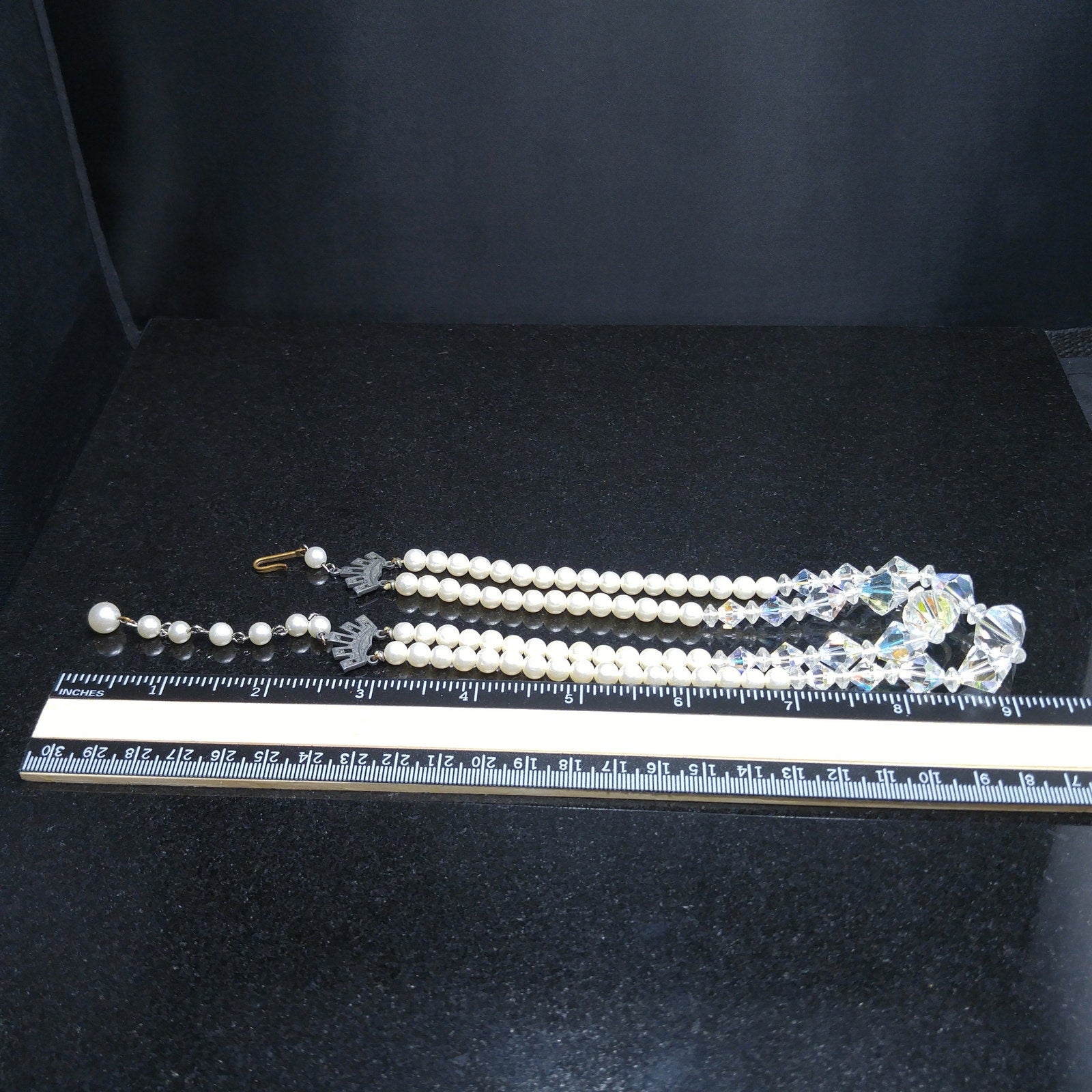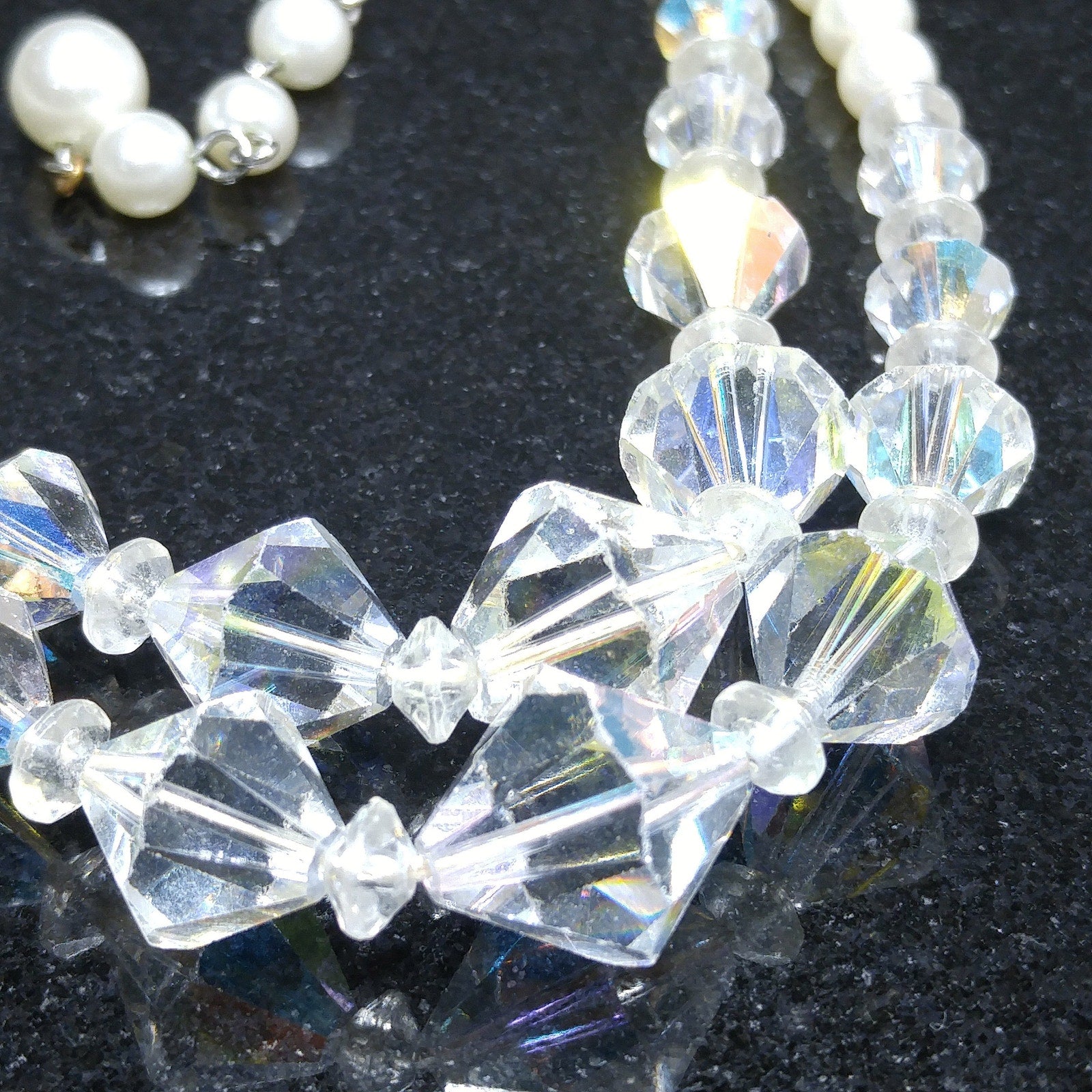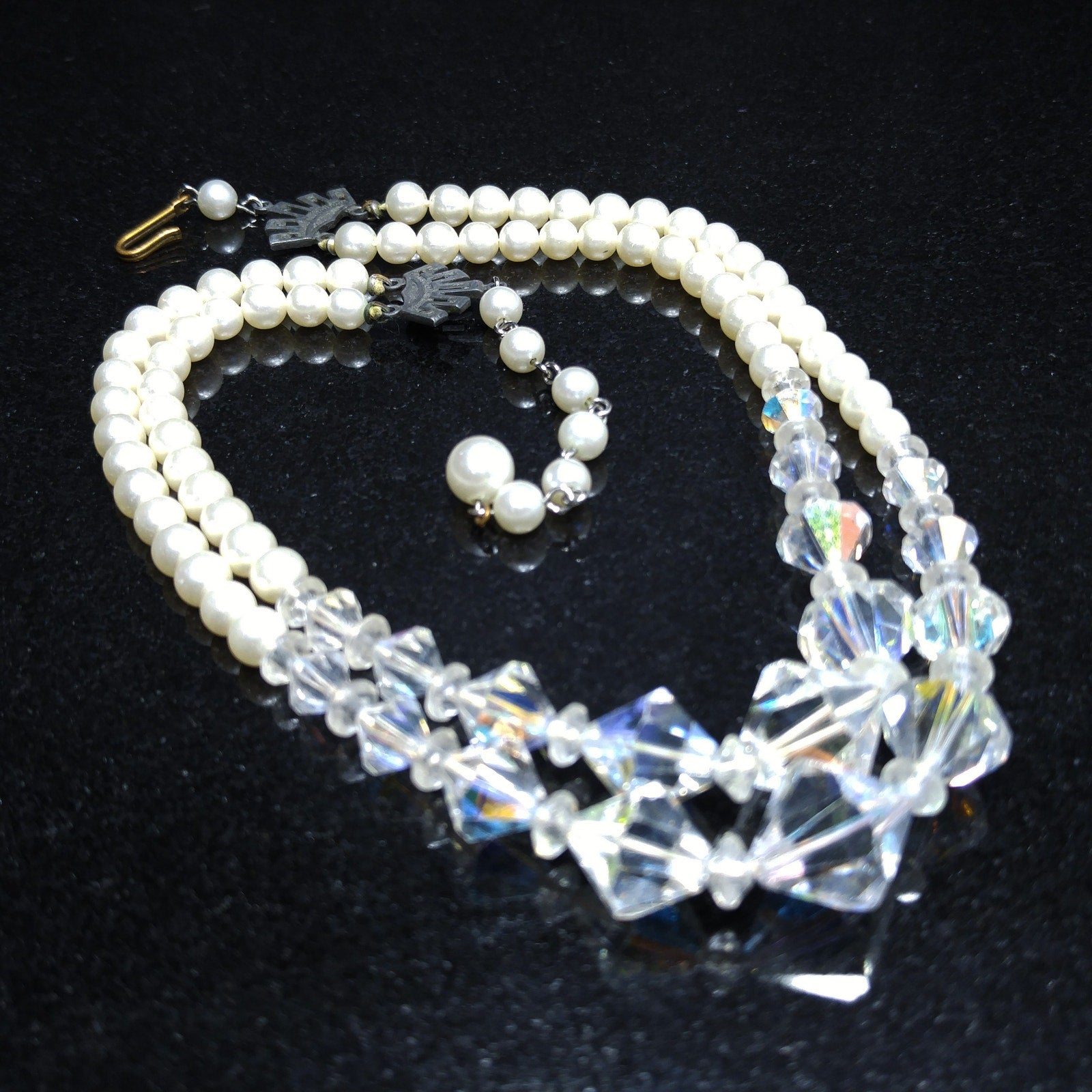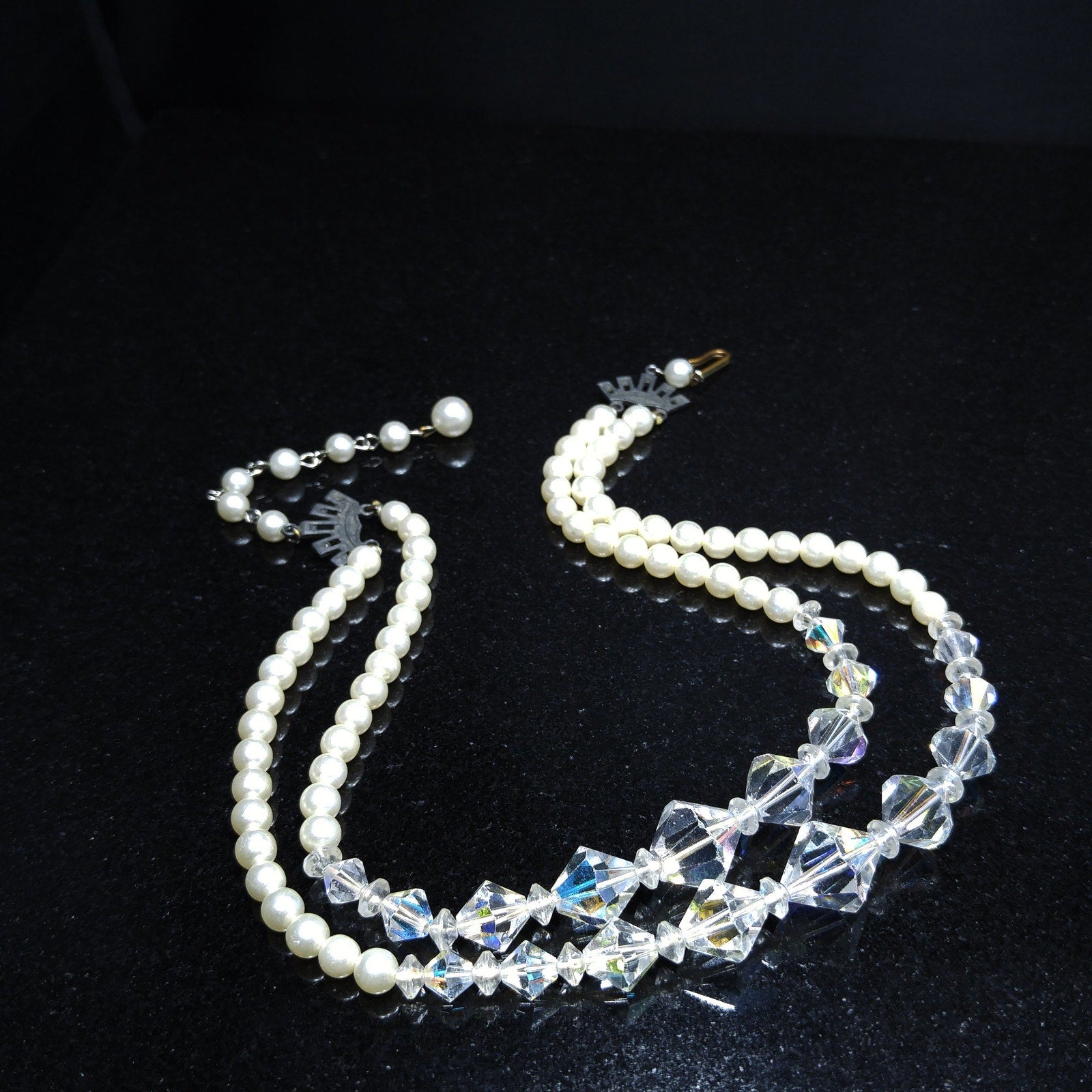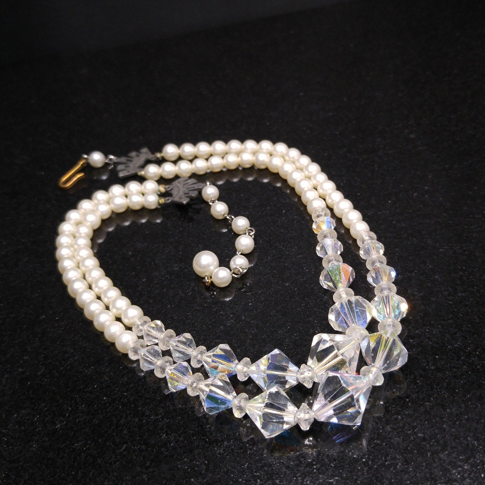 *Description: This is a beautiful vintage crystal and faux pearl necklace in circulation around the mid-1950s. There are two strands of flowing beads and the crystal aurora borealis clear bicone crystal beads fall in the front of both strands. This would be a beautiful wedding, bridesmaid, or wedding party necklace and also any other formal event. This necklace would also make a great vintage gift. Perfect for "something old" and something beautiful!