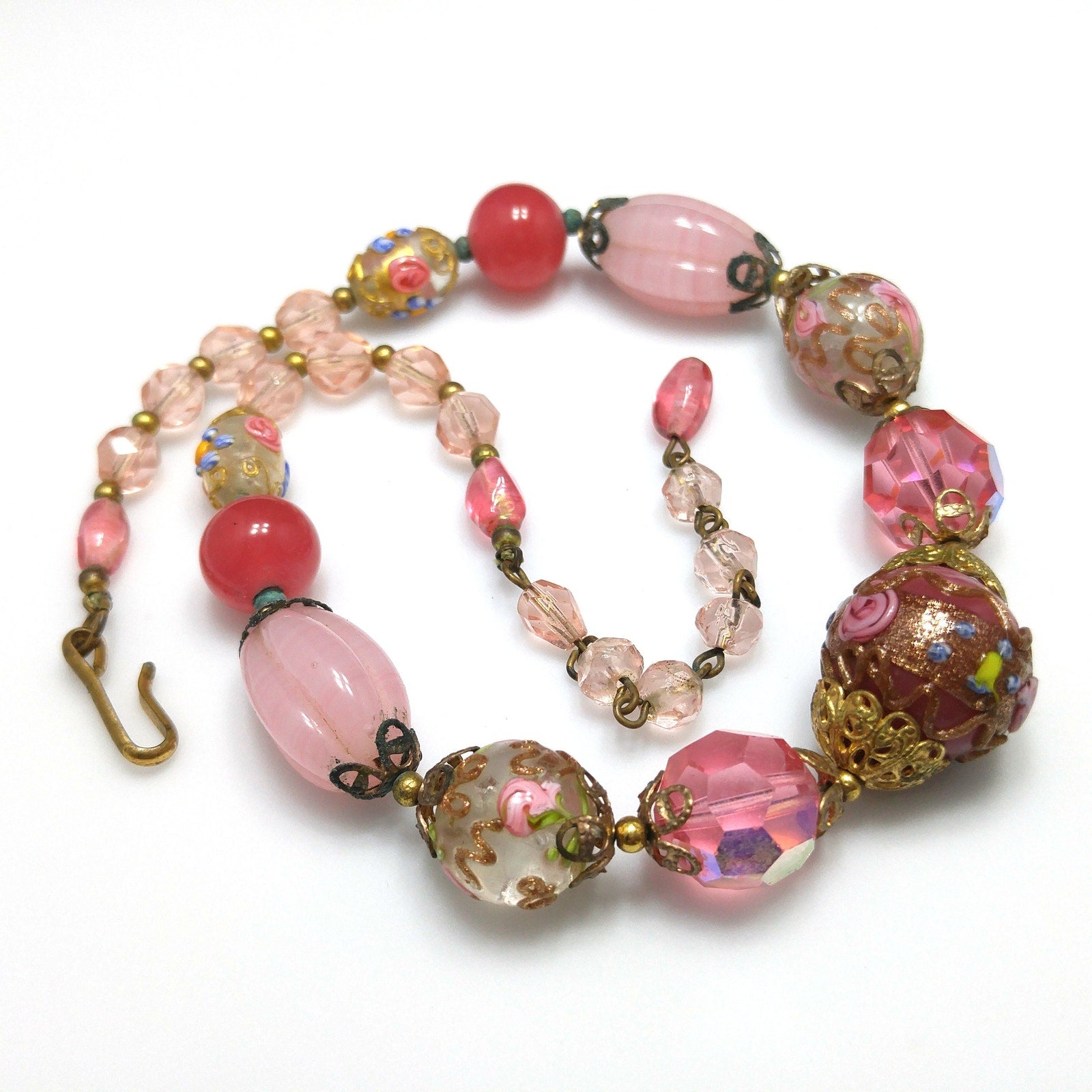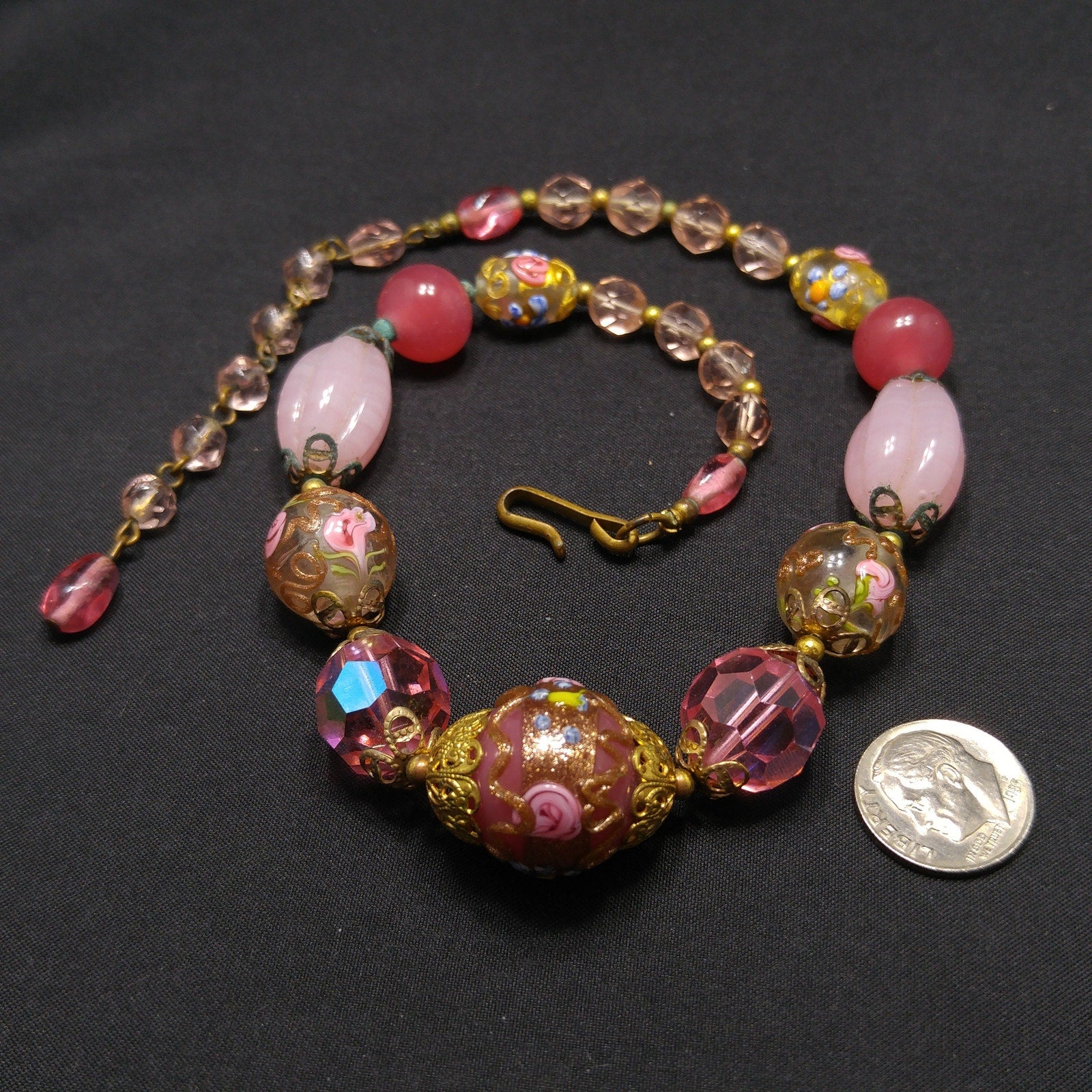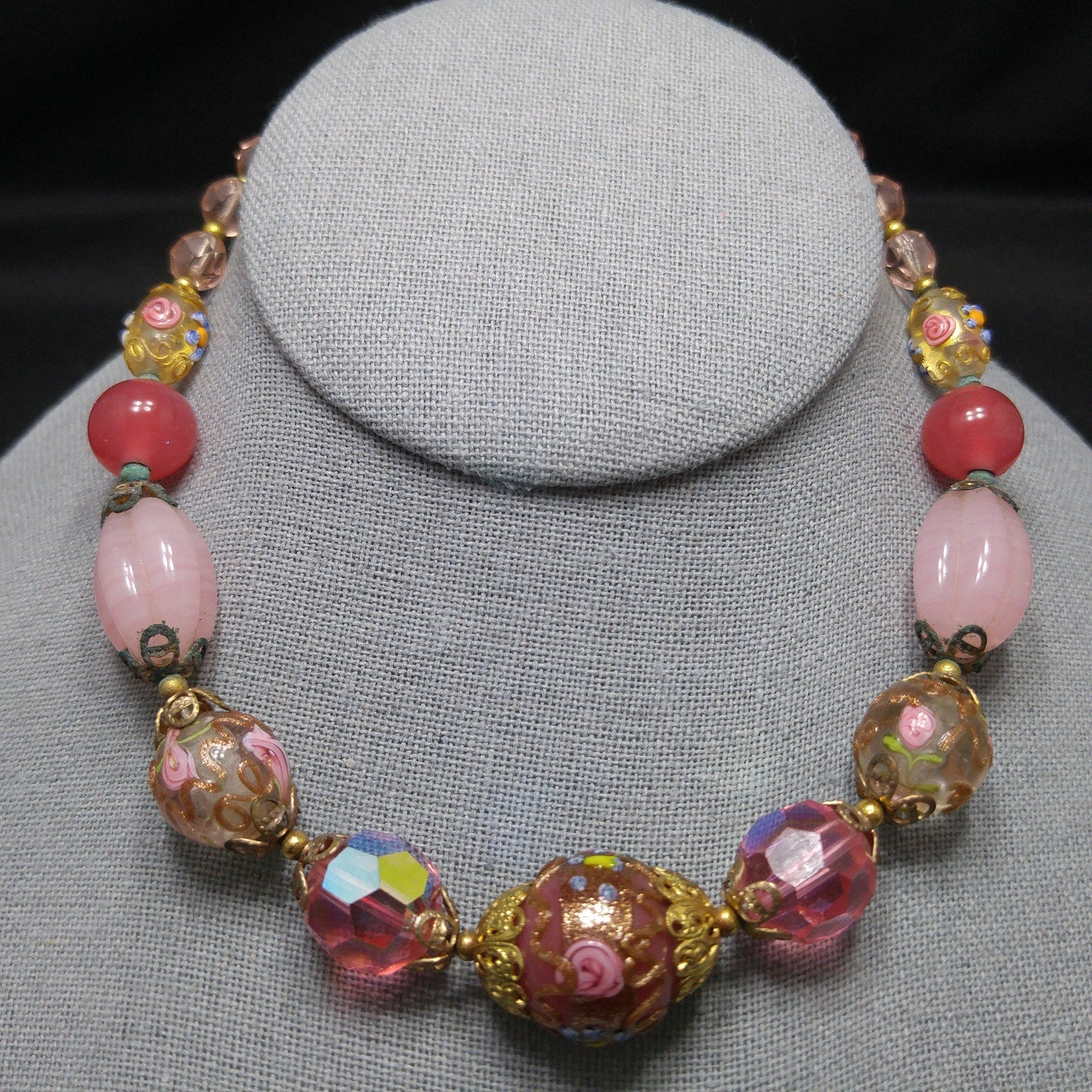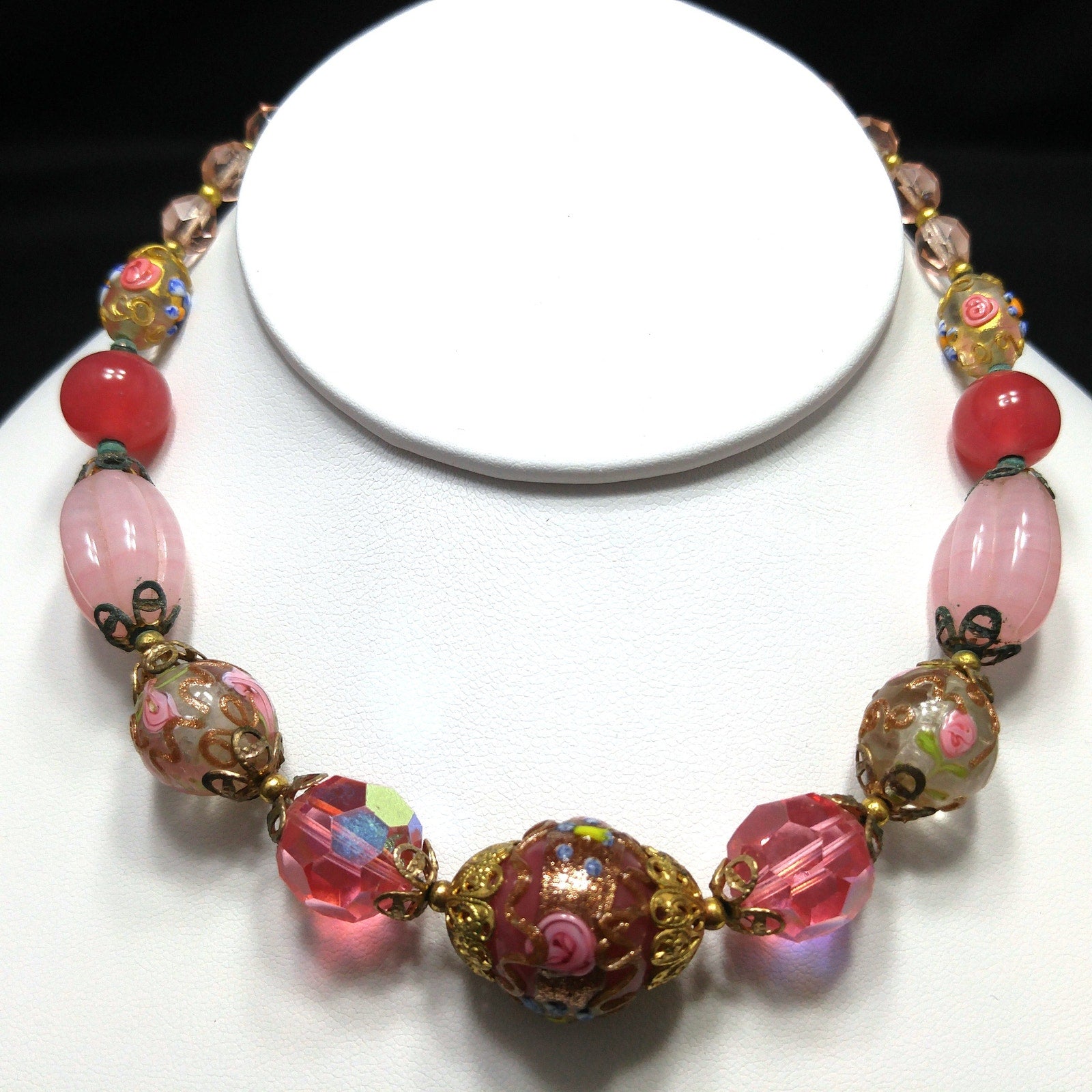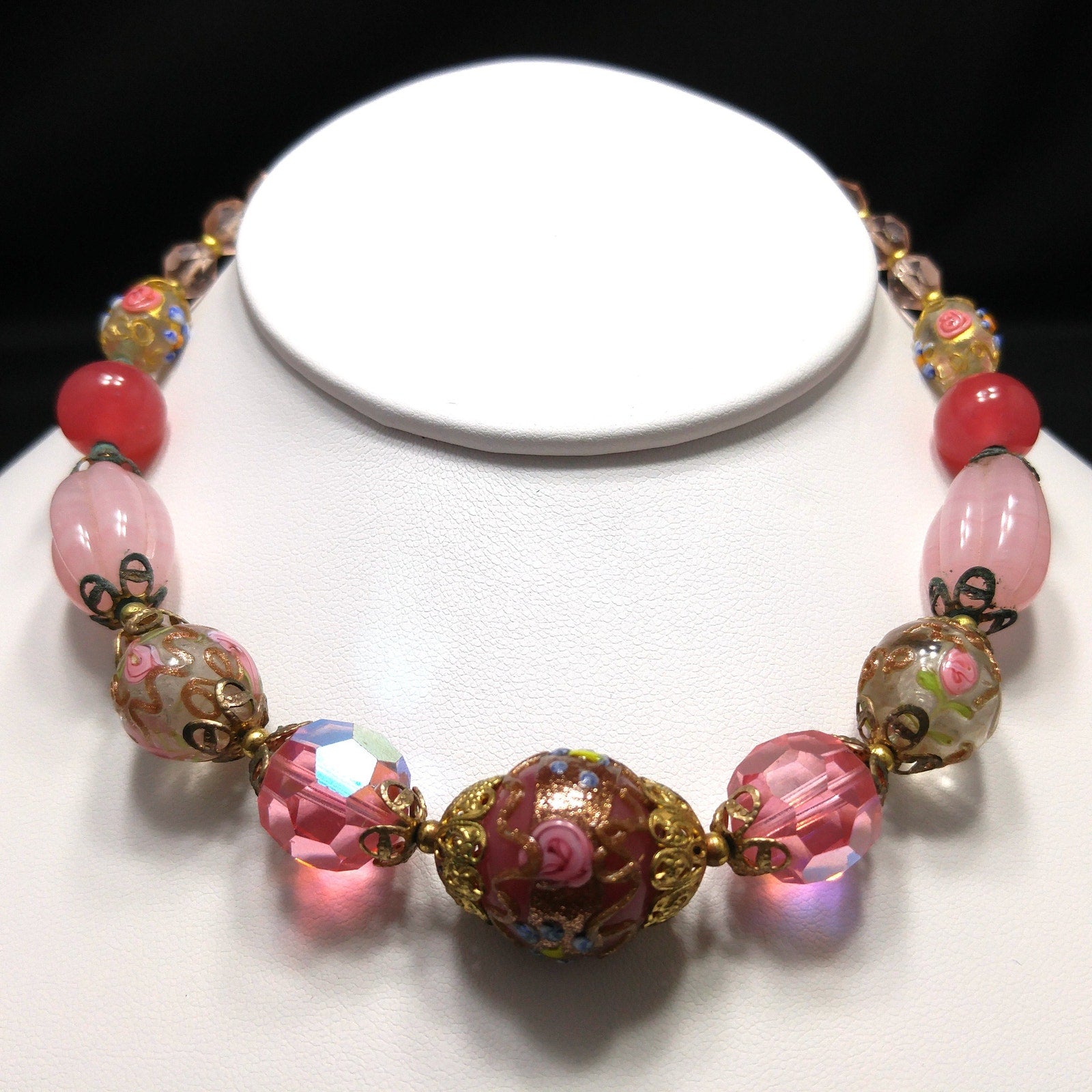 *Description: This is a beautiful pink choker necklace from the 1940s with a variety of pink vintage beads. This gorgeous necklace includes a center large wedding cake bead on dark pink, two large hot pink crystal faceted beads, two medium wedding cake beads with goldstone and pink rose buds on clear glass, creamy pink molded glass beads, darker pink orb beads, two smaller wedding cake beads on clear glass, and small light pink glass beads. The necklace has a hook clasp, allowing a length up to 16 inches. The largest wedding cake bead, center front, is 20mm. This would be a great addition to your vintage jewelry collection or make a great vintage gift!