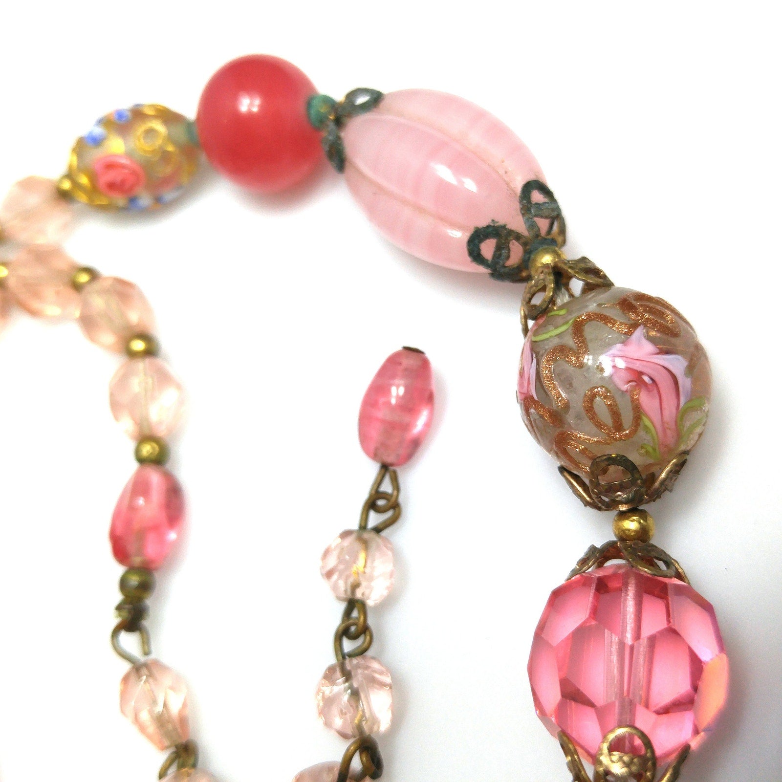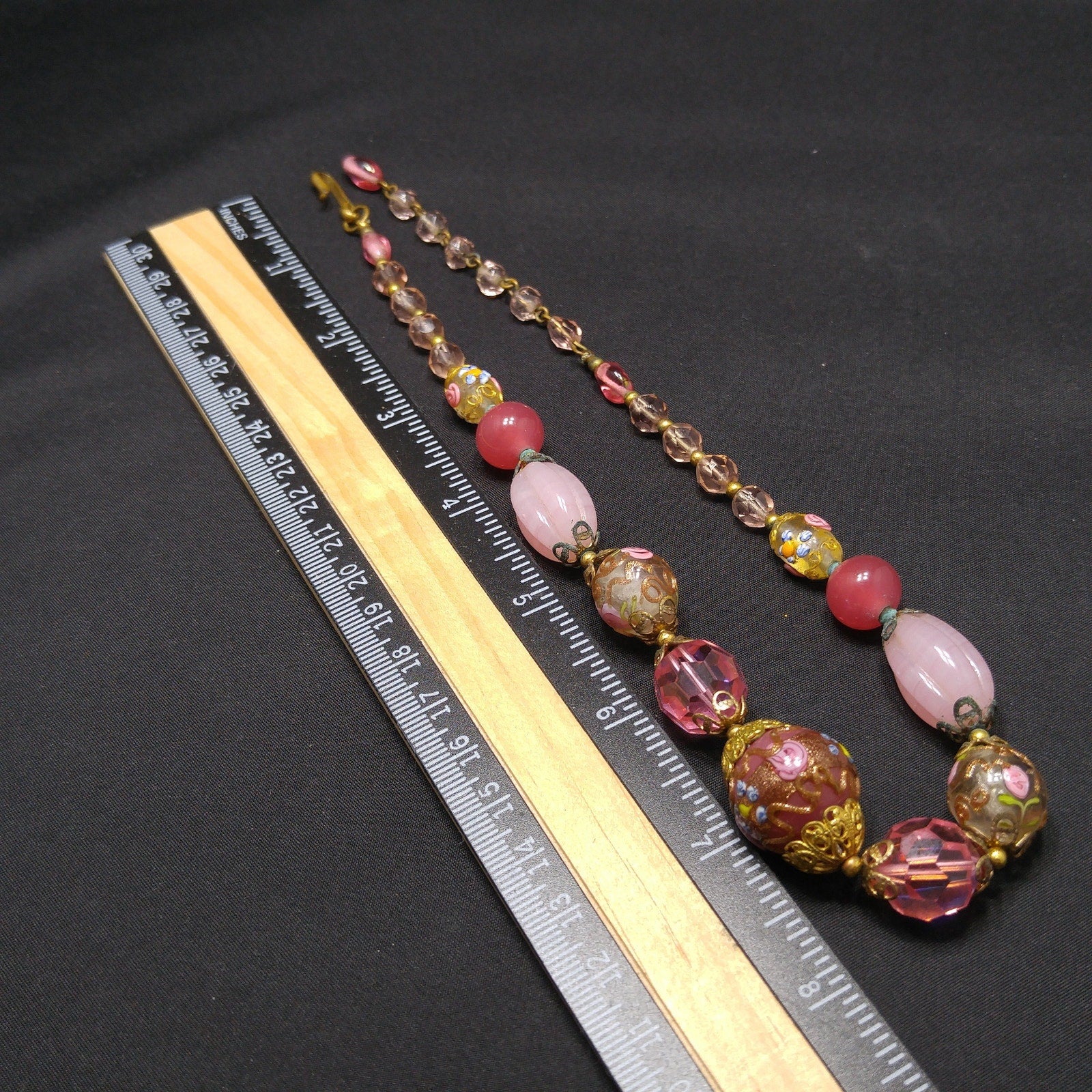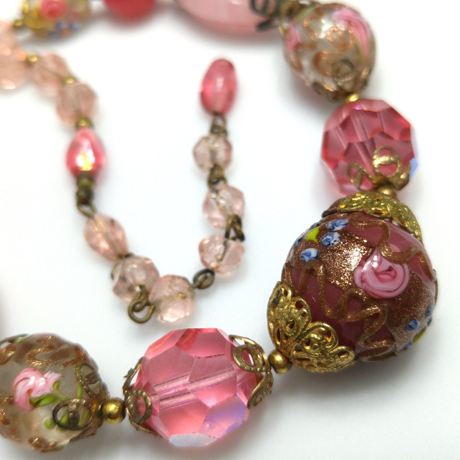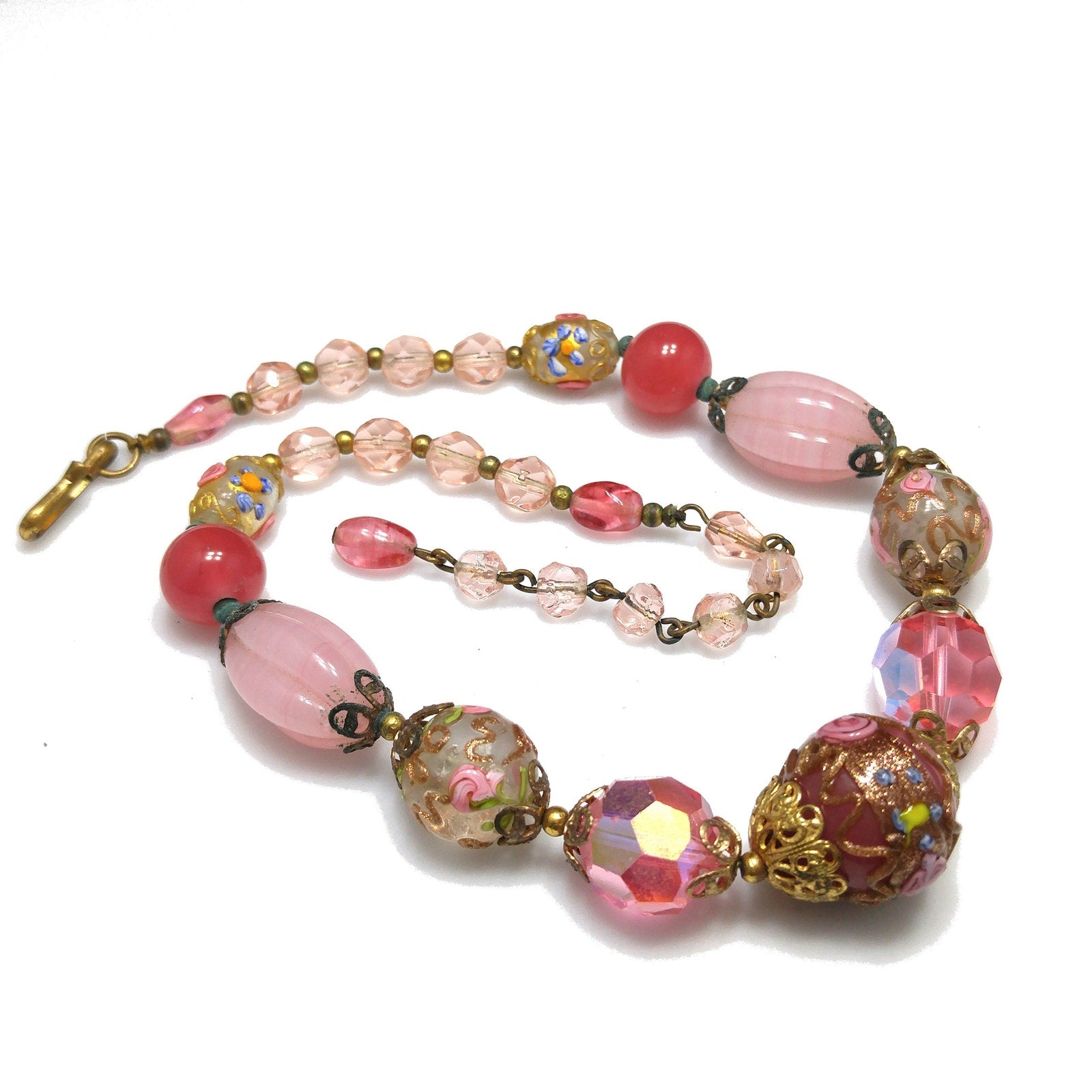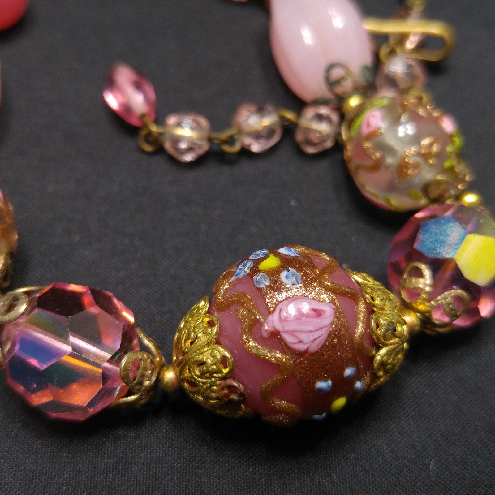 *Description: This is a beautiful pink choker necklace from the 1940s with a variety of pink vintage beads. This gorgeous necklace includes a center large wedding cake bead on dark pink, two large hot pink crystal faceted beads, two medium wedding cake beads with goldstone and pink rose buds on clear glass, creamy pink molded glass beads, darker pink orb beads, two smaller wedding cake beads on clear glass, and small light pink glass beads. The necklace has a hook clasp, allowing a length up to 16 inches. The largest wedding cake bead, center front, is 20mm. This would be a great addition to your vintage jewelry collection or make a great vintage gift!