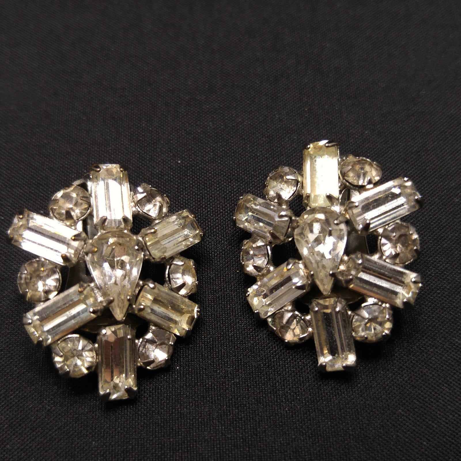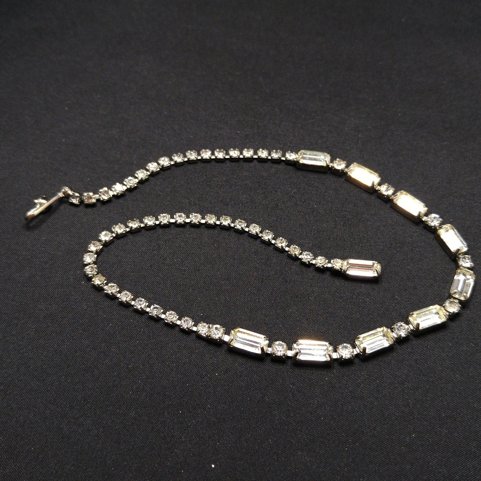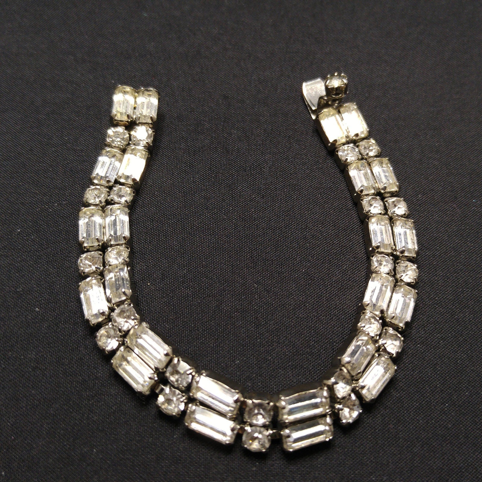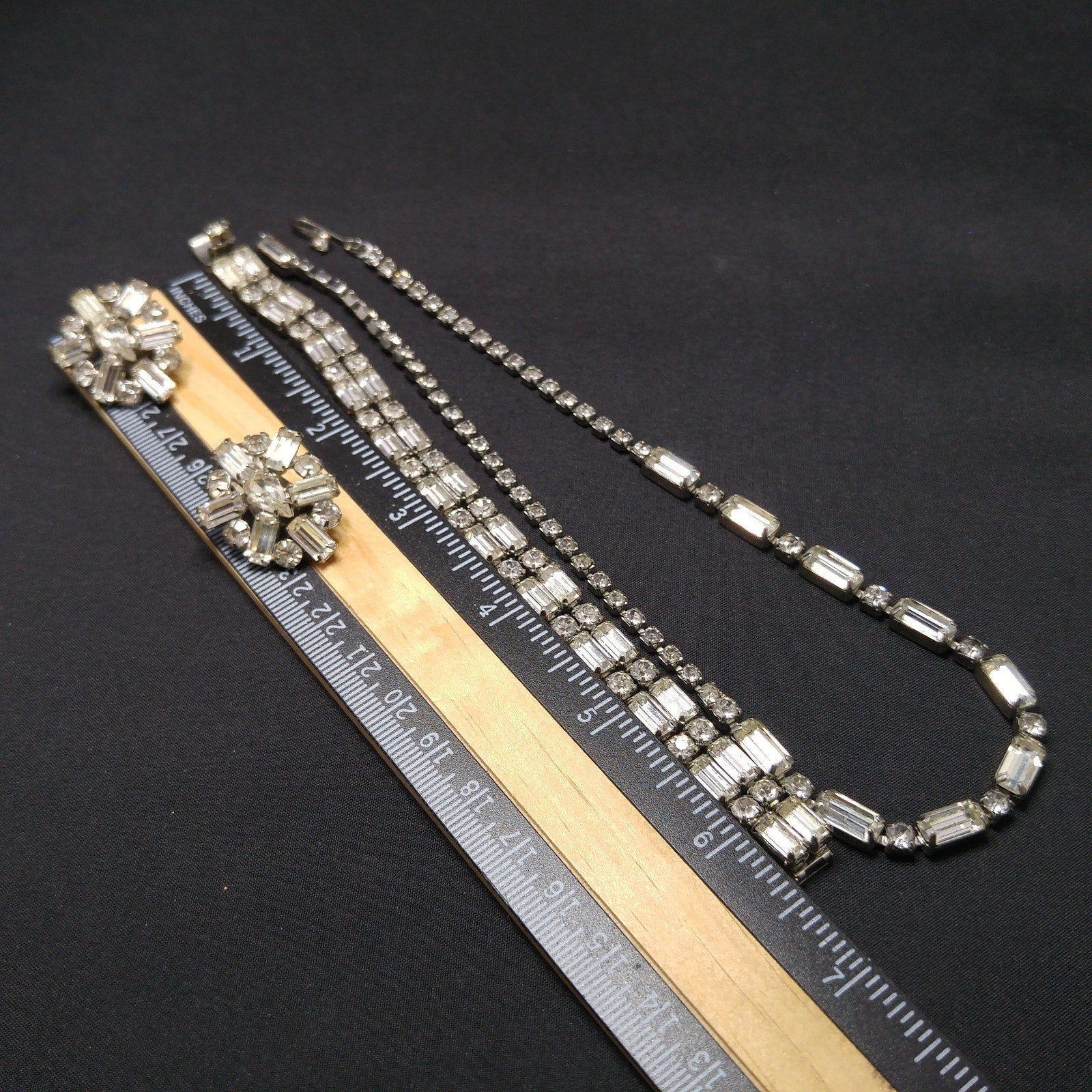 The necklace features alternating chaton and emerald-cut rhinestones with a hook closure accented by a single rhinestone at the end. The bracelet showcases a double row of prong-set rhinestones with a hidden box clasp. The clip-on earrings, stamped WEISS, feature a central pear-cut rhinestone surrounded by baguettes and rounds in a radiant starburst design.