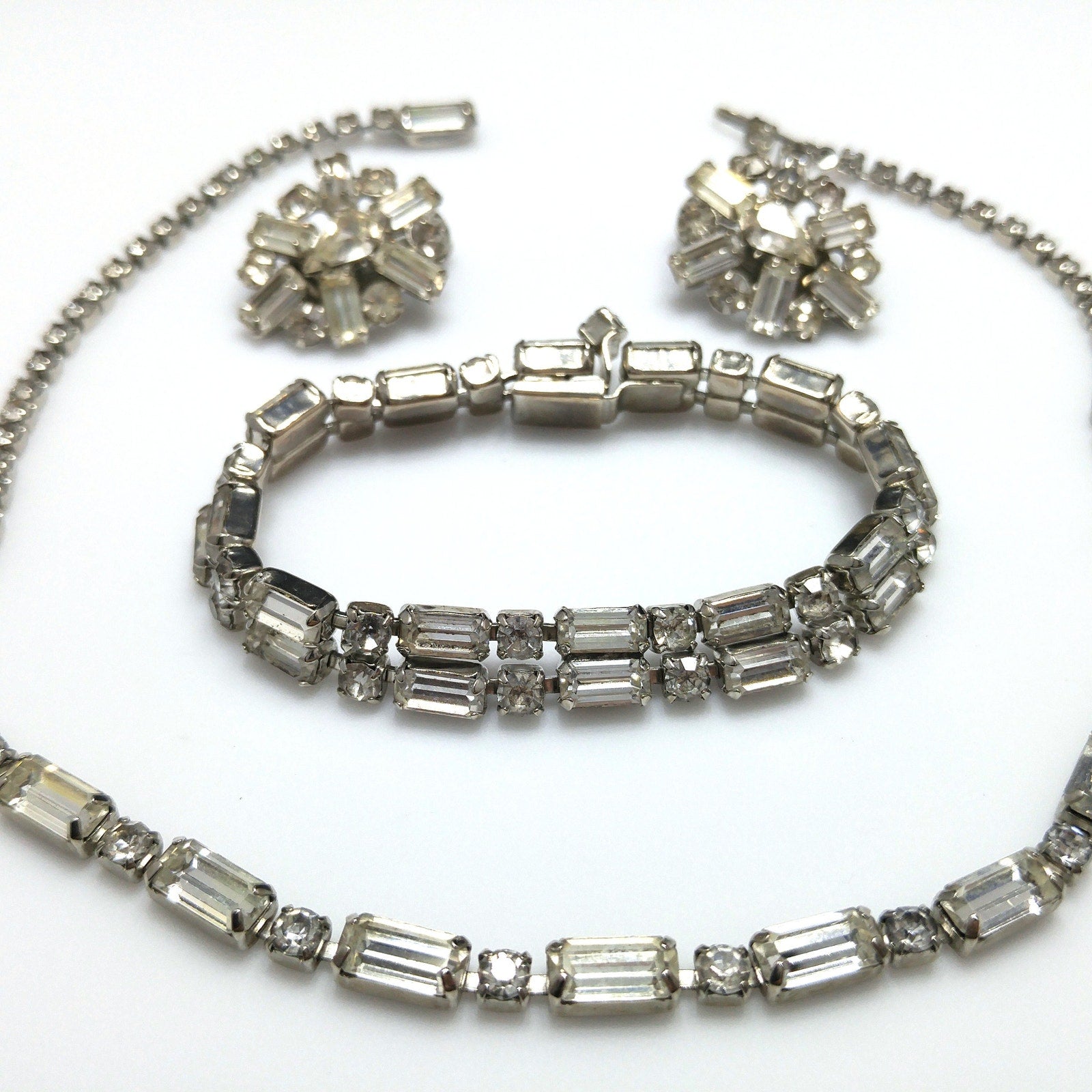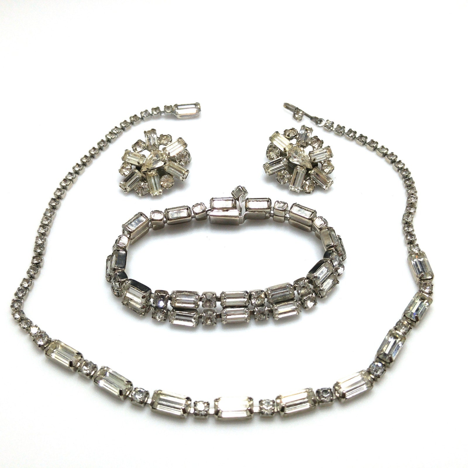 Weiss 1950s Clear Rhinestone Necklace, Bracelet & Earrings Set – Rhodium Plated Parure