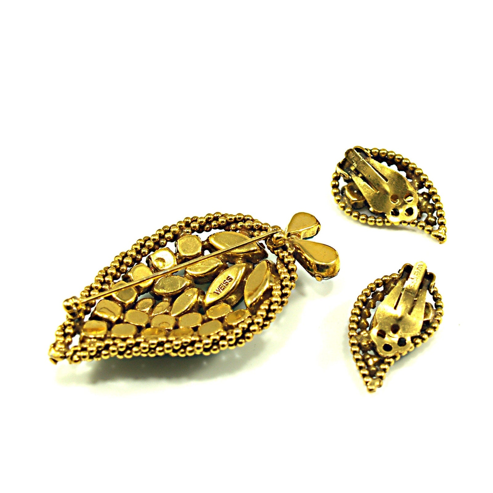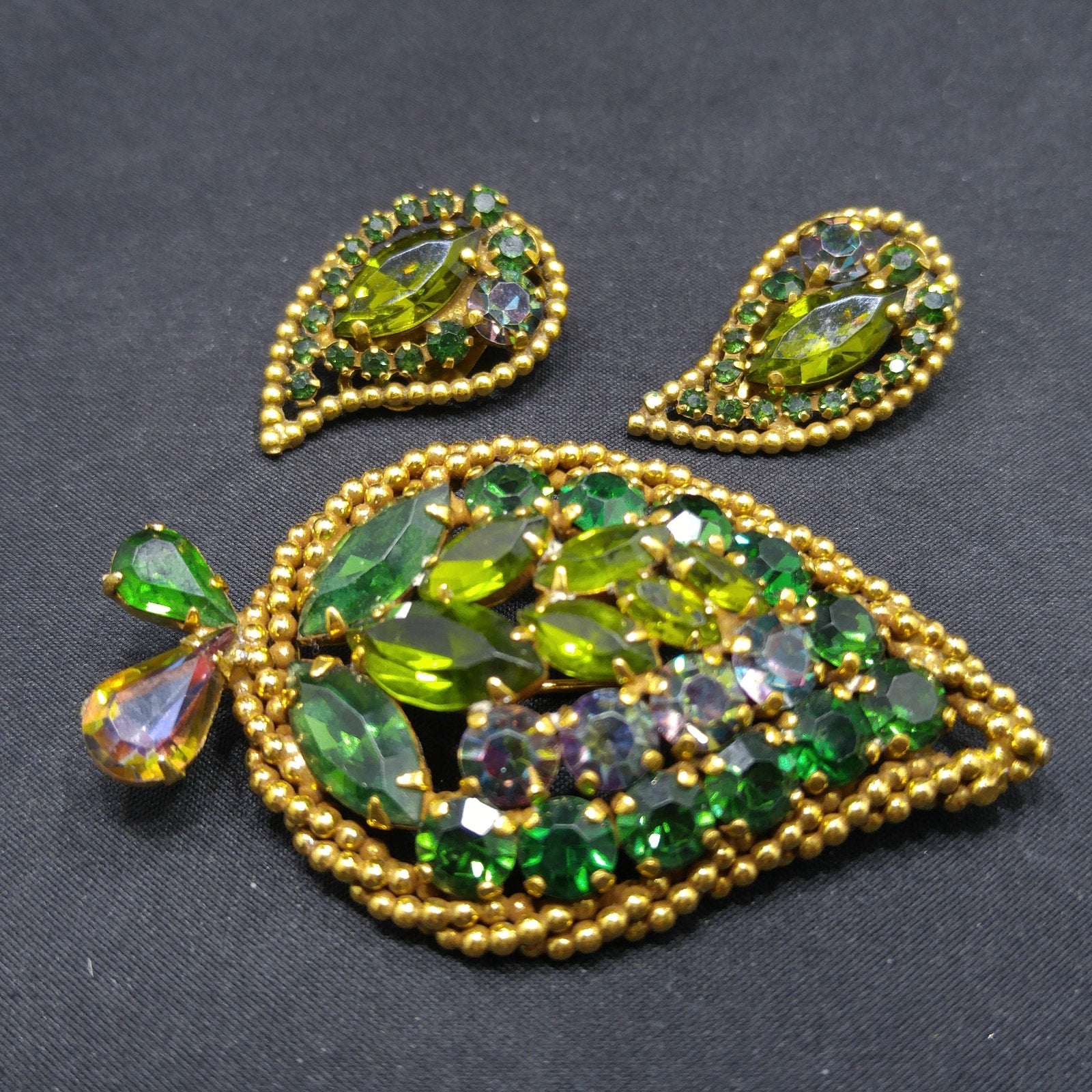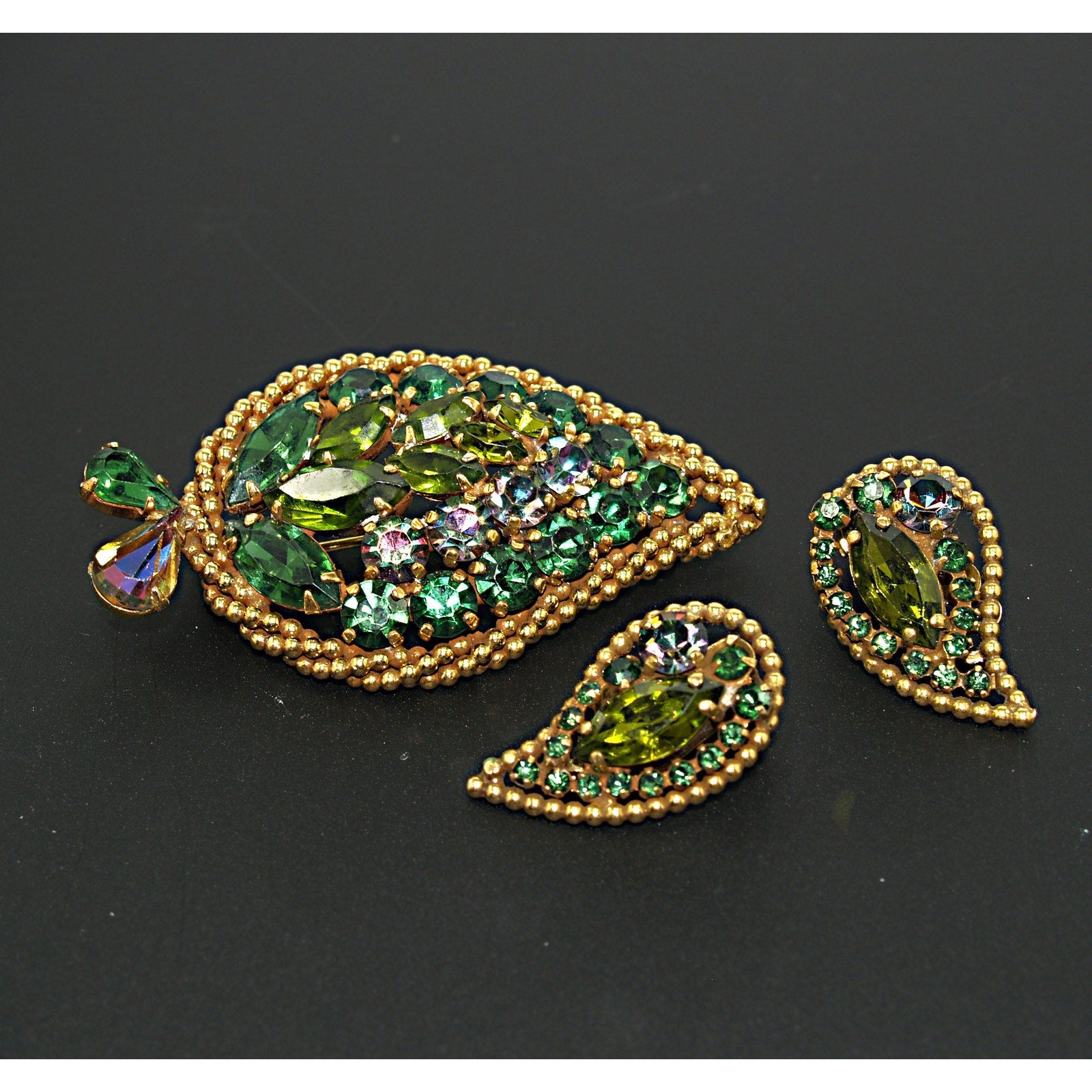 Weiss 1950s Emerald & Vitrail Rhinestone Leaf Brooch & Earrings Set – Gold Beaded Design
