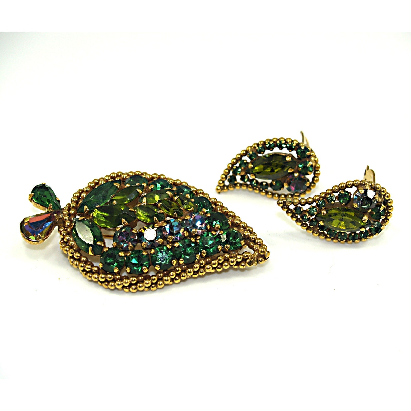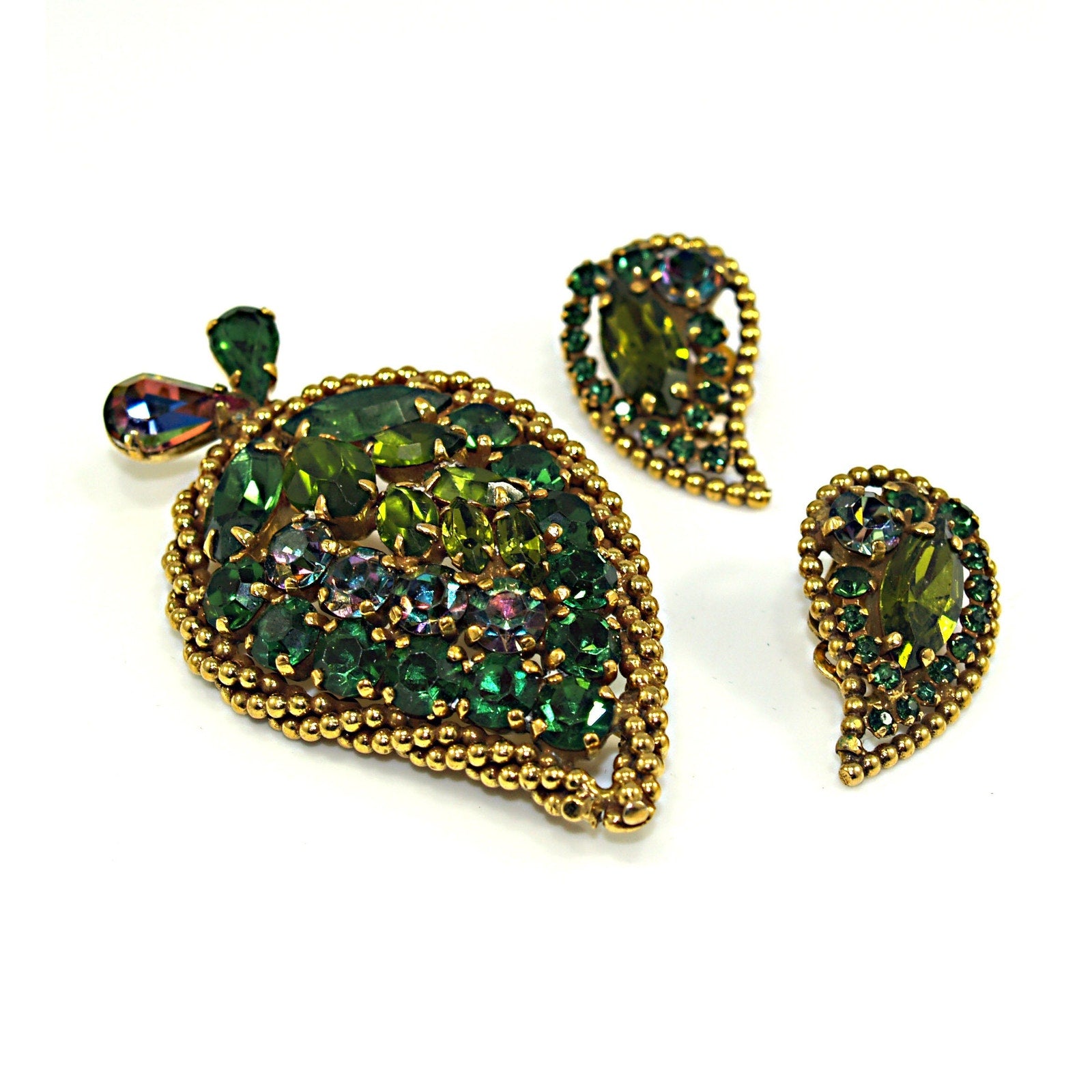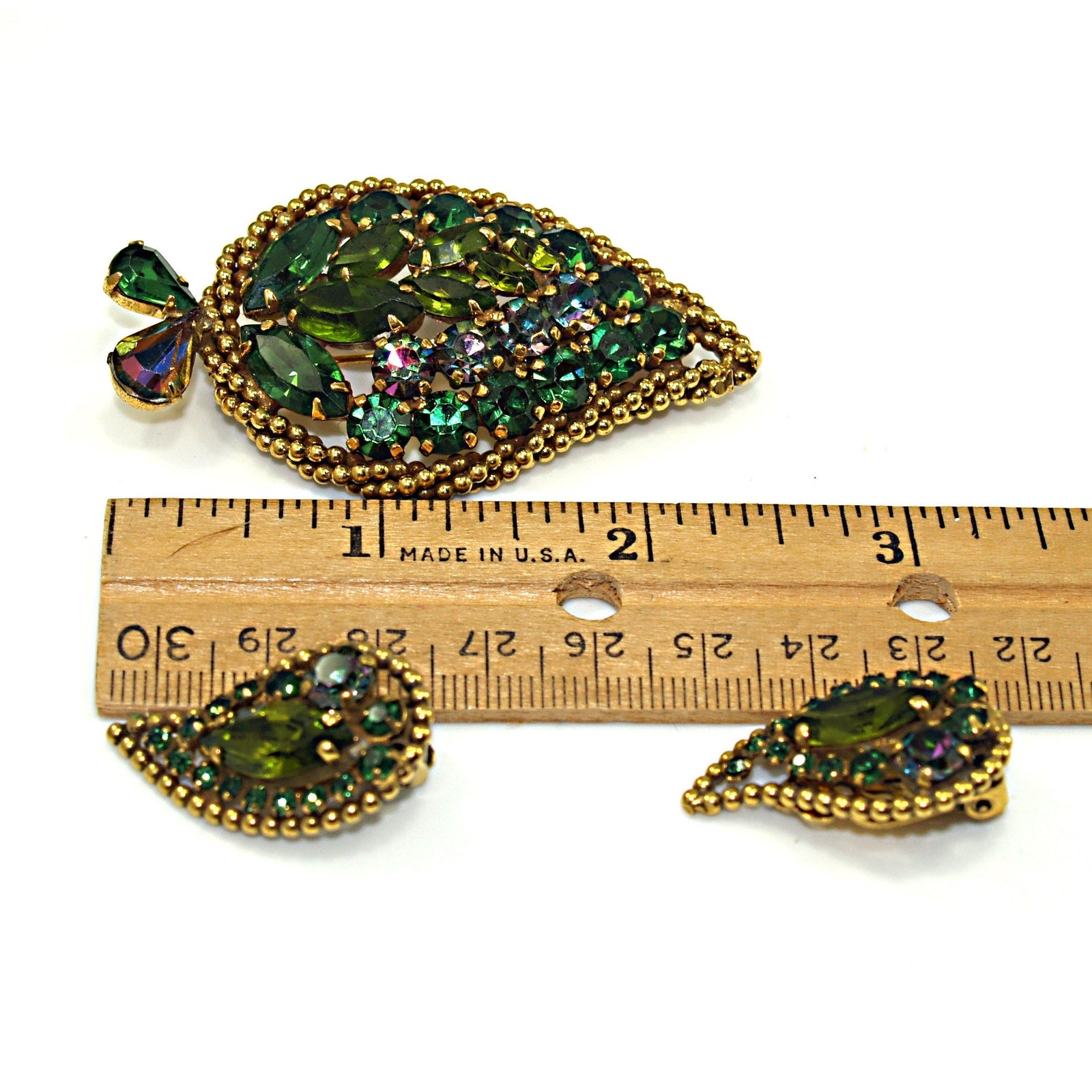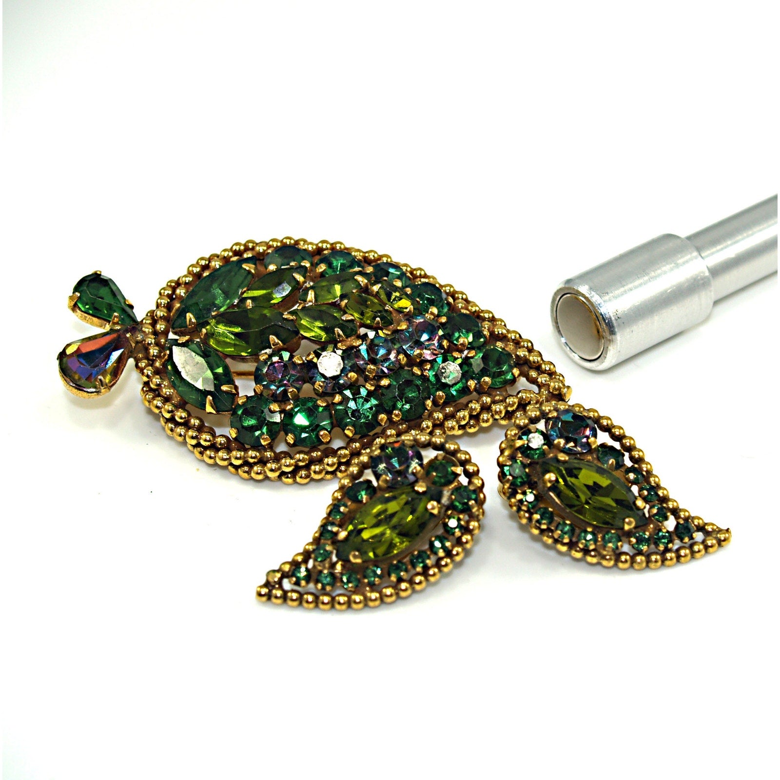 Weiss 1950s Emerald & Vitrail Rhinestone Leaf Brooch & Earrings Set – Gold Beaded Design