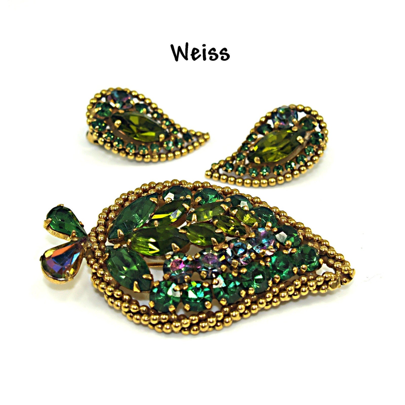 Each piece is stamped WEISS and showcases the brand’s signature craftsmanship—brilliant Austrian stones, heavy plating, and intricate detailing. The mix of greens gives this set a rich, luminous quality, perfect for collectors or anyone who loves vintage statement jewelry.