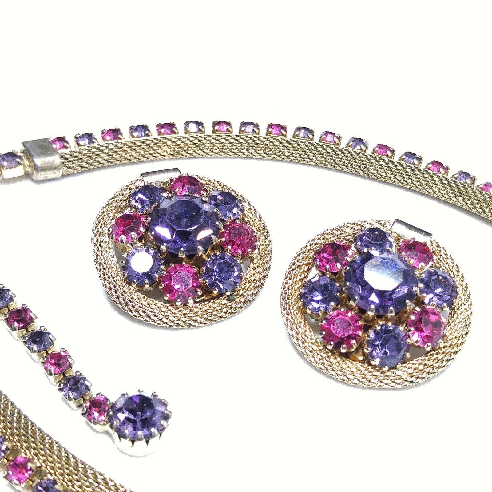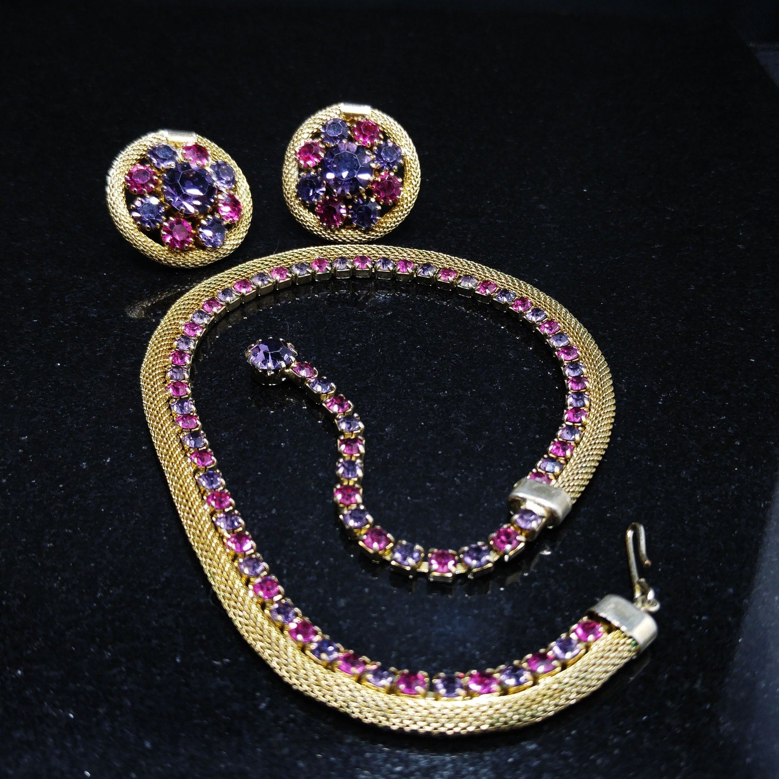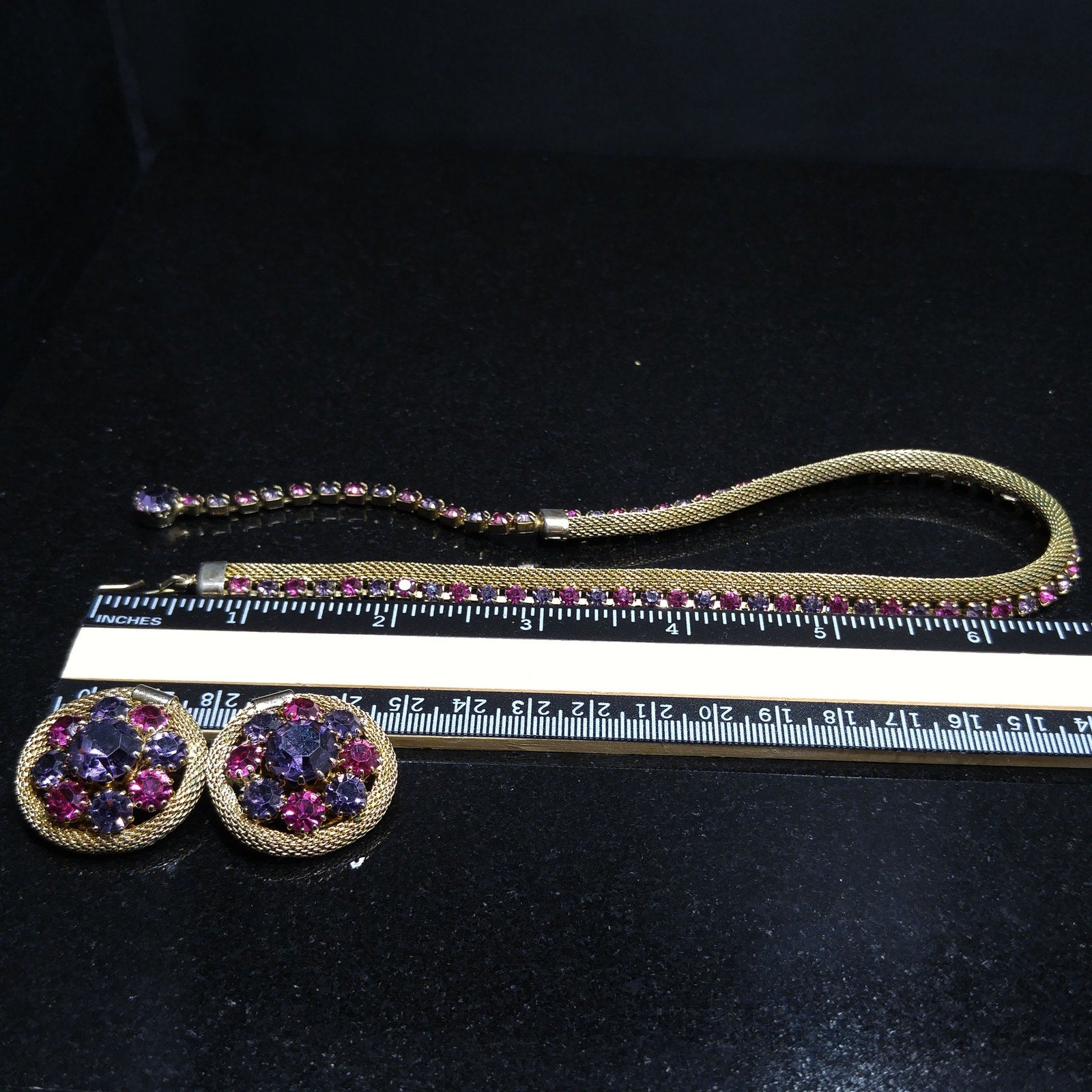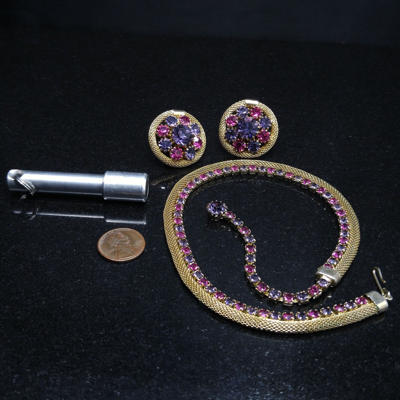 Weiss 1950s Gold Mesh Necklace & Earrings Set – Pink and Lavender Rhinestones
