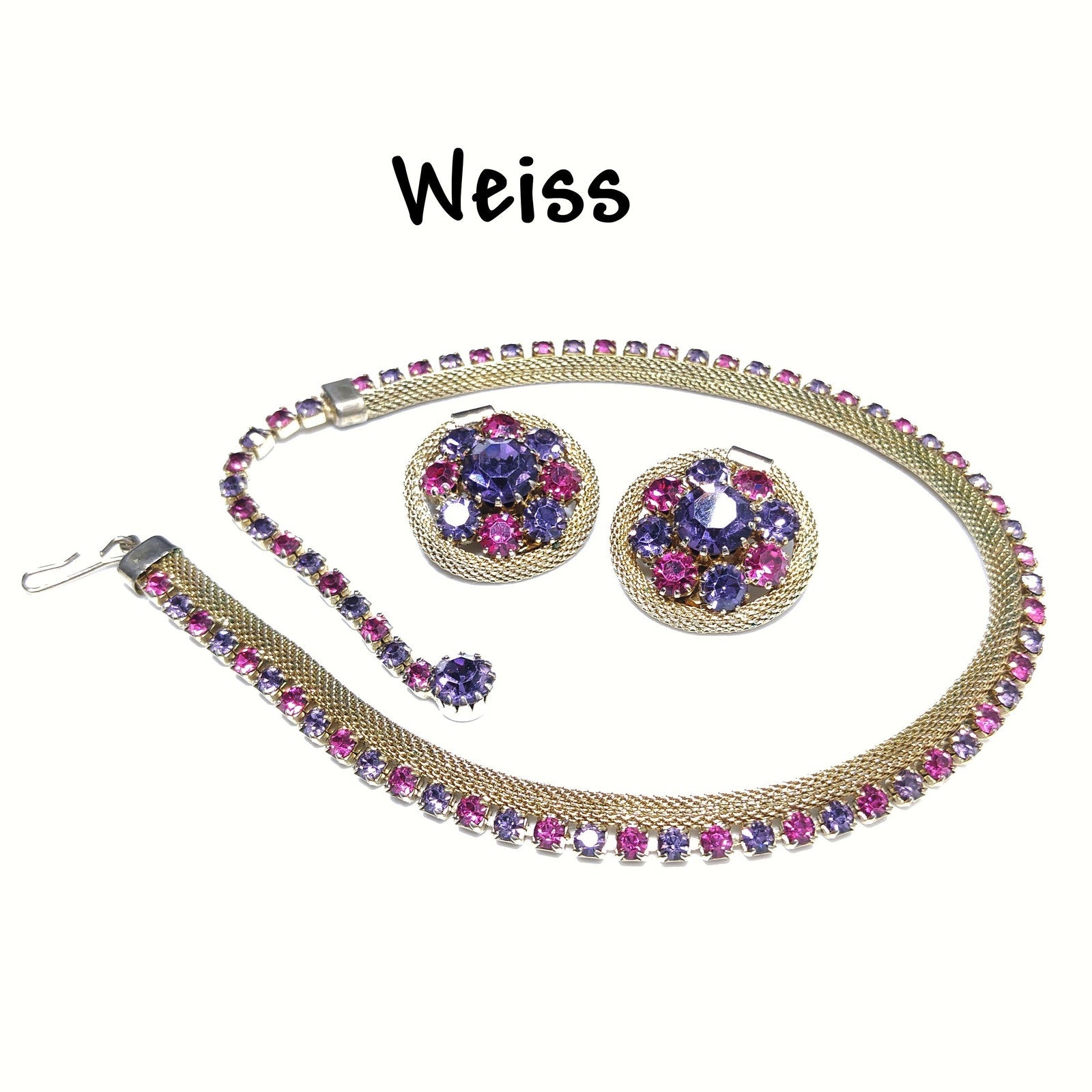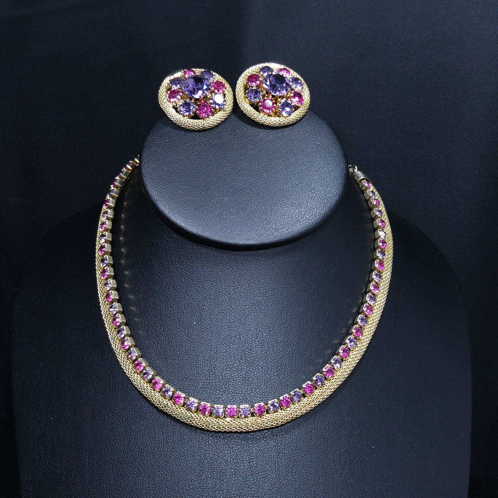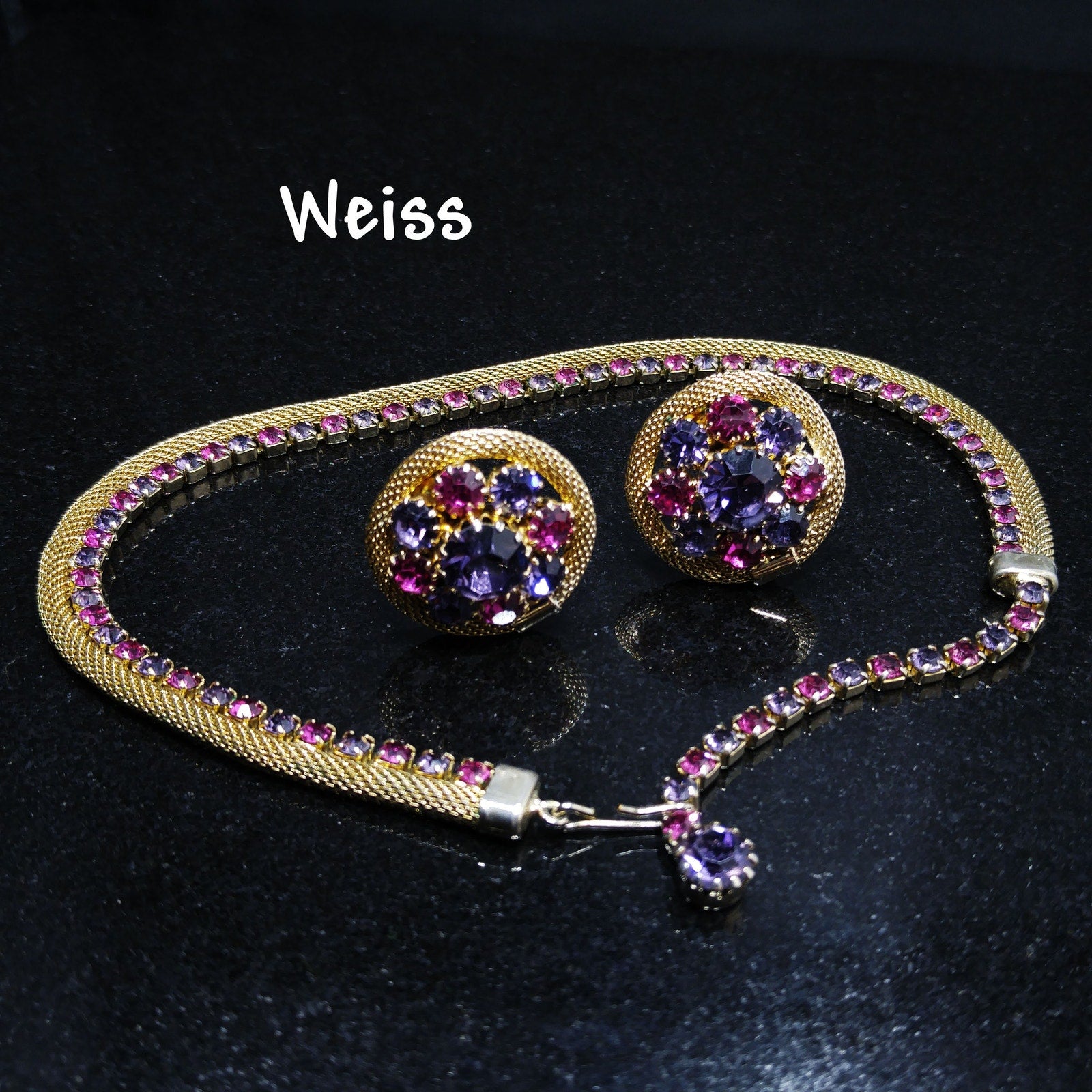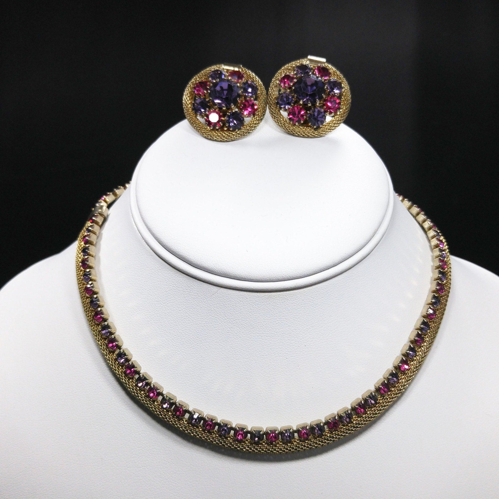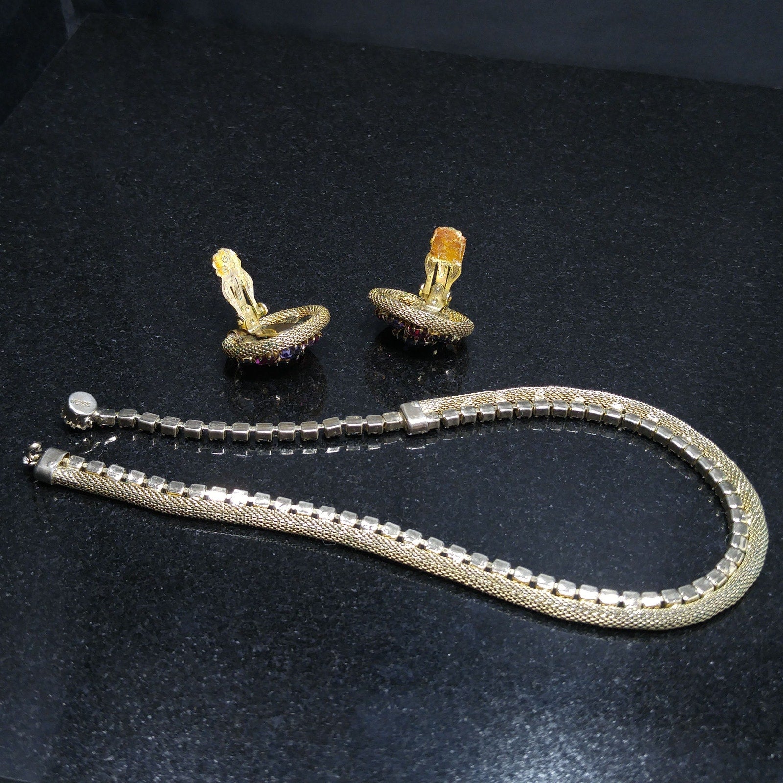 Weiss 1950s Gold Mesh Necklace & Earrings Set – Pink and Lavender Rhinestones