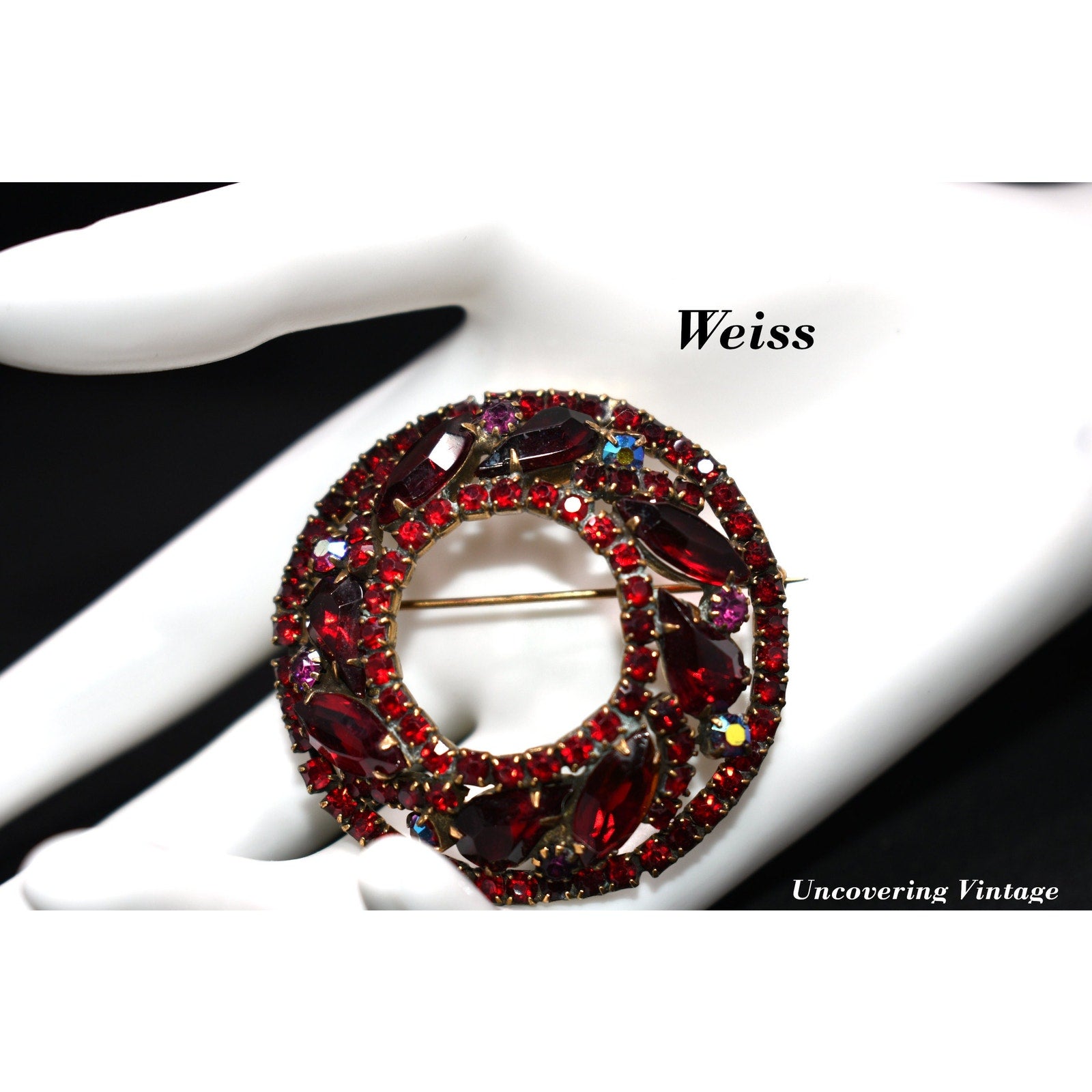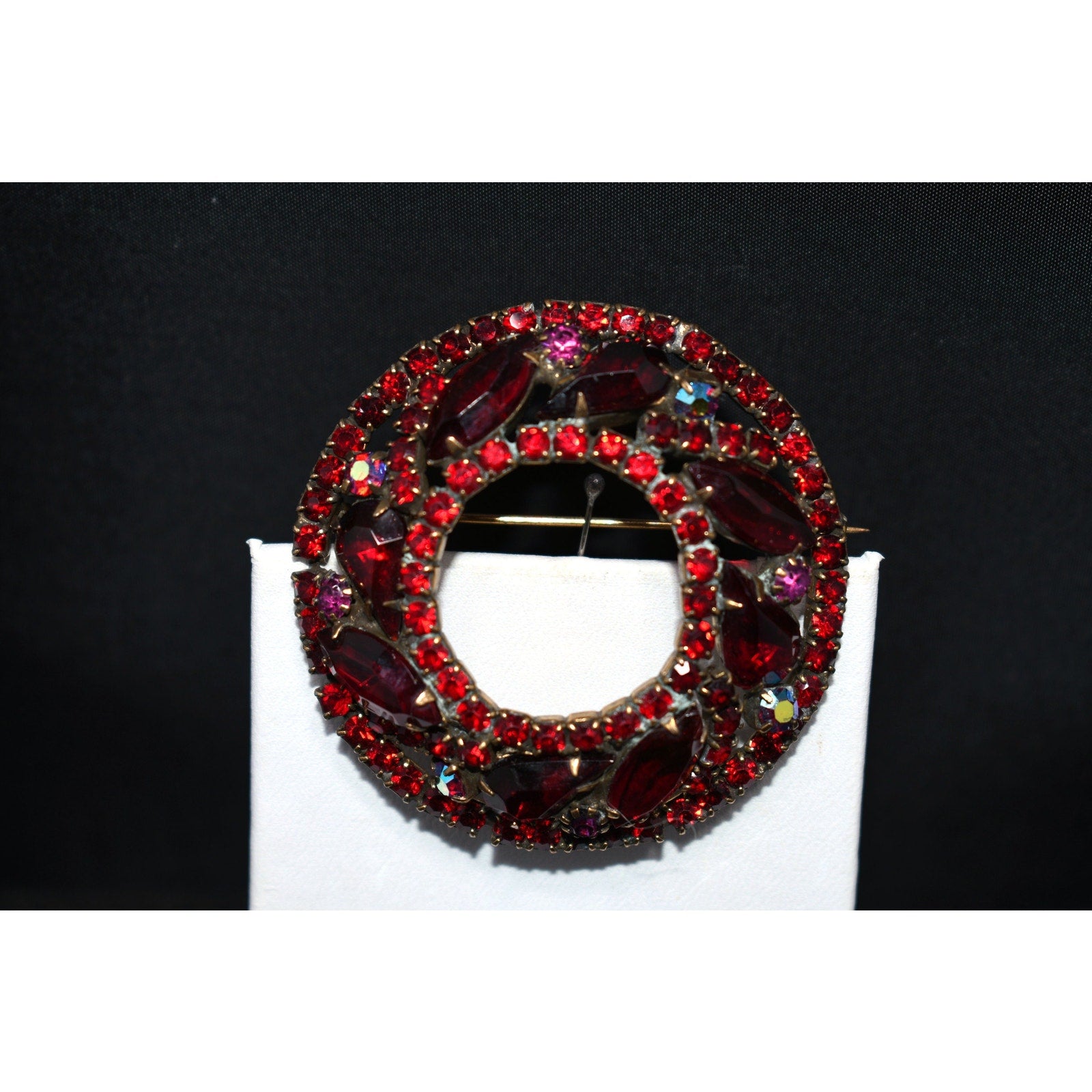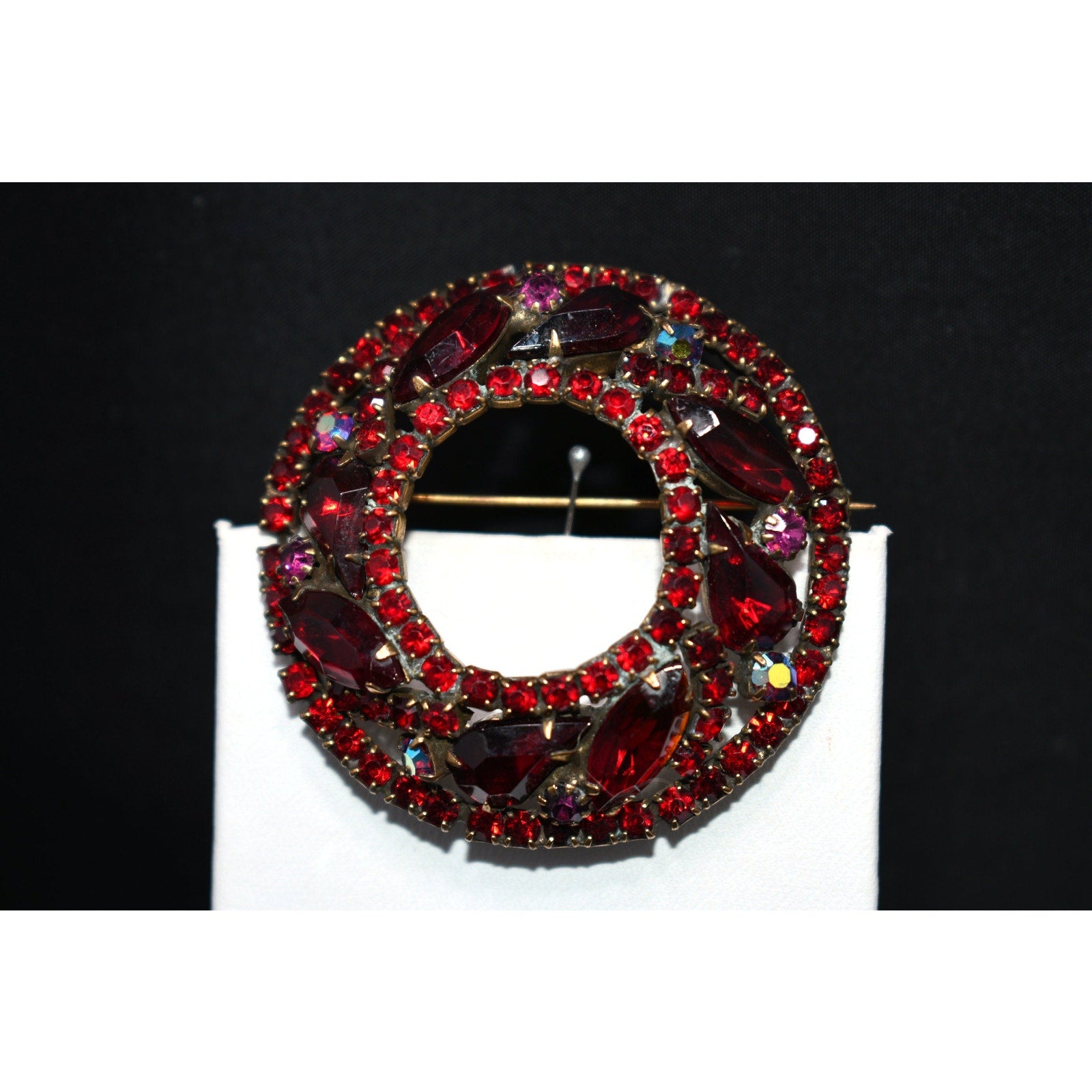 This is a striking Weiss red rhinestone domed wreath brooch from the late 1950s, designed with rich layers of sparkle and intricate craftsmanship. The brooch features a mix of marquise, teardrop, and round chaton-cut rhinestones in two shades of red — deep garnet and fiery scarlet — accented by aurora borealis red stones that shimmer with hints of violet and gold.