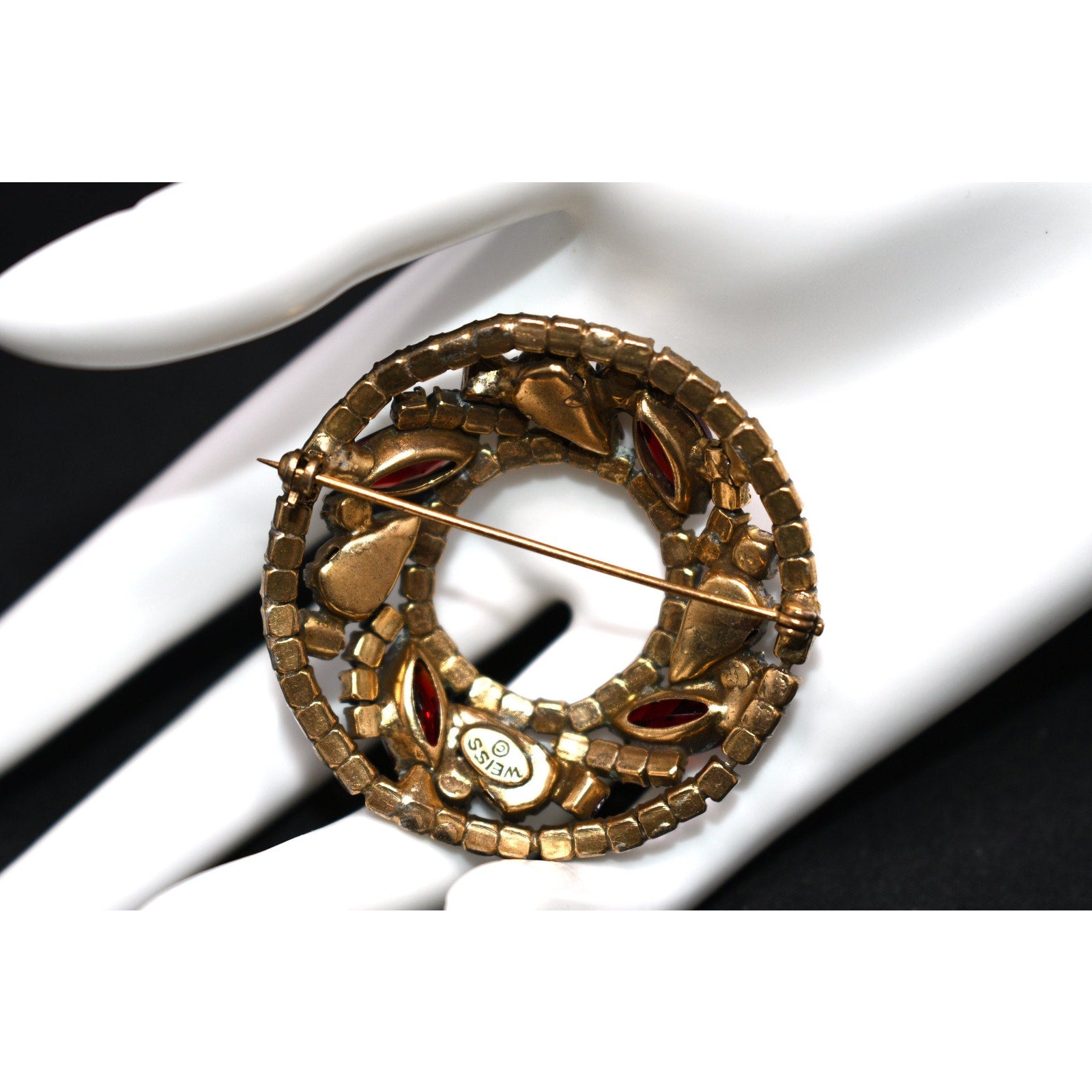 Weiss 1950s Red Rhinestone Wreath Brooch – Domed Gold Tone Holiday Statement