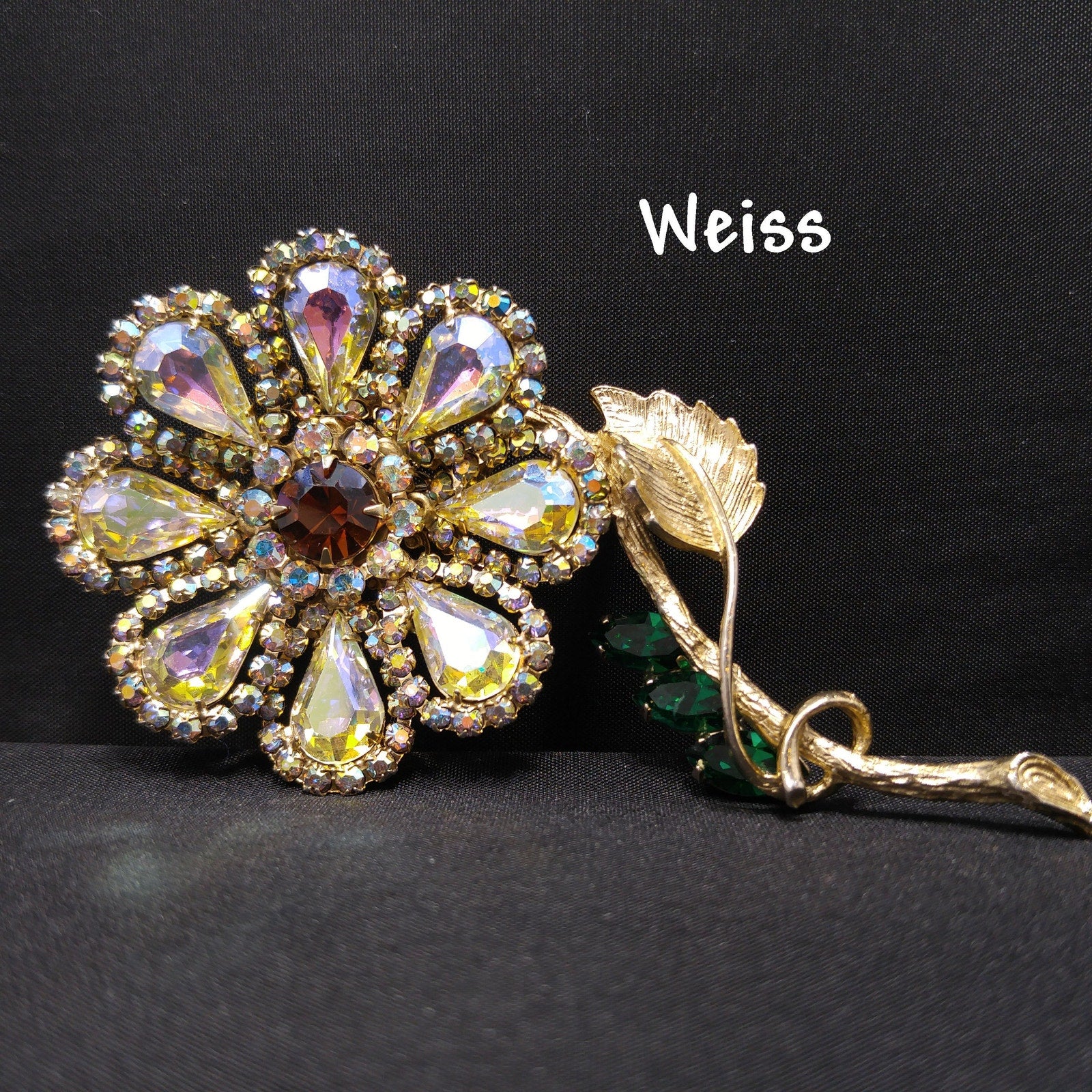 Signed Weiss on the reverse, this brooch is a wonderful example of mid-century rhinestone craftsmanship — radiant, sculptural, and full of life. Perfect for collectors or as an unforgettable gift.
