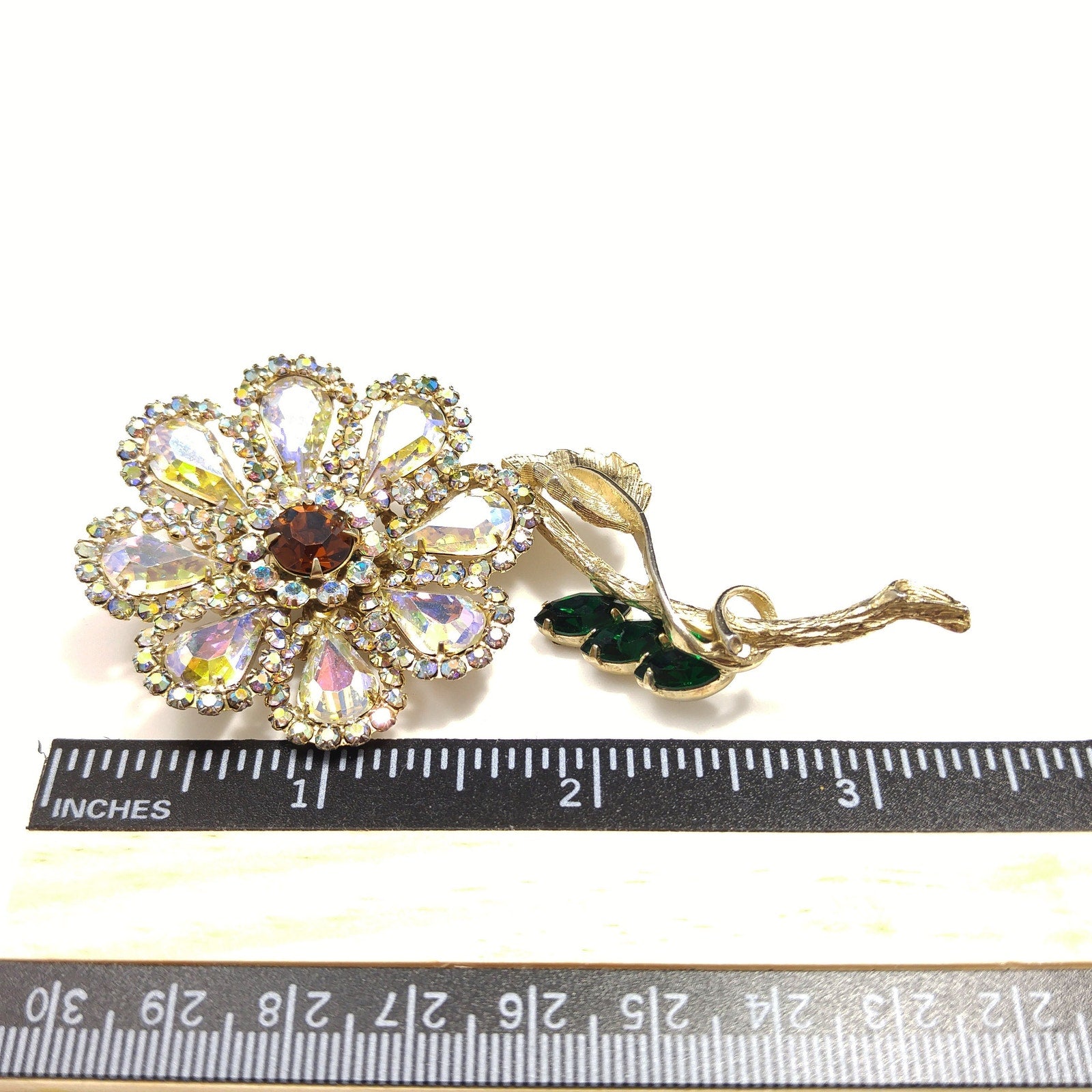 Weiss 1960s Aurora Borealis Rhinestone Flower Brooch with Green Leaves – Gold Plated