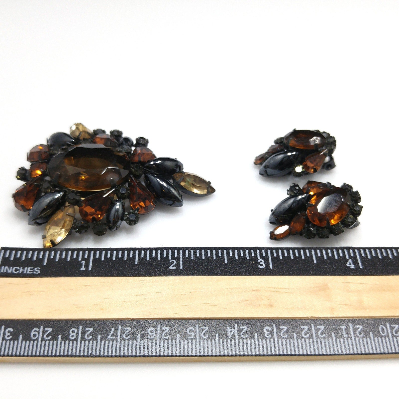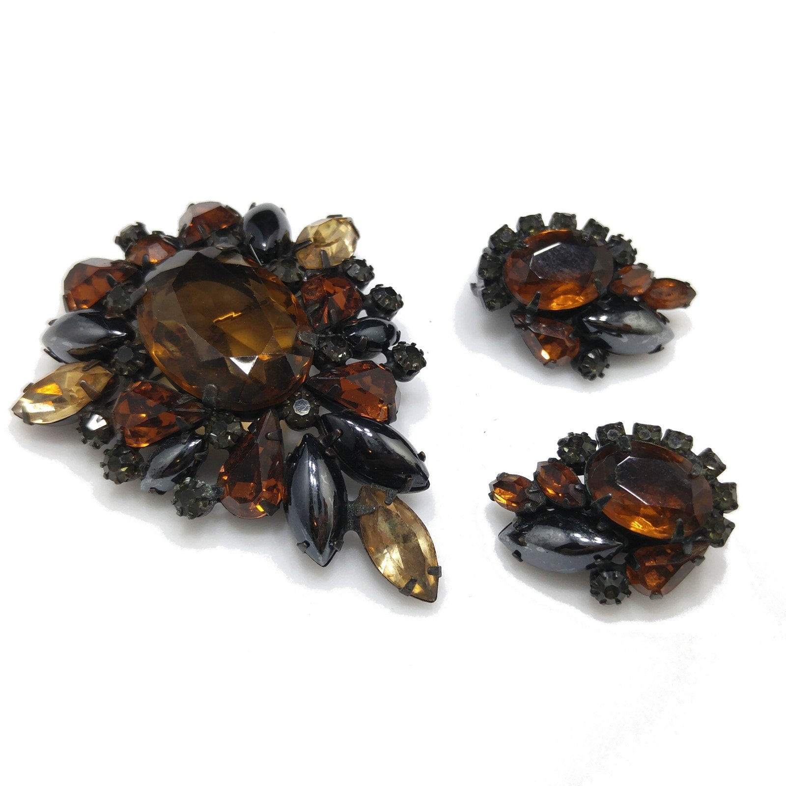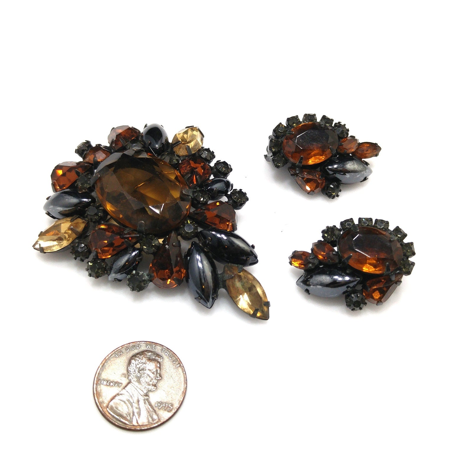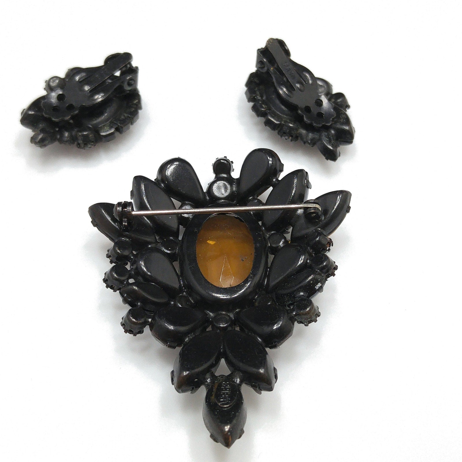 Weiss 1960s Japanned Topaz Rhinestone Brooch & Earrings Set – Faux Hematite Accents
