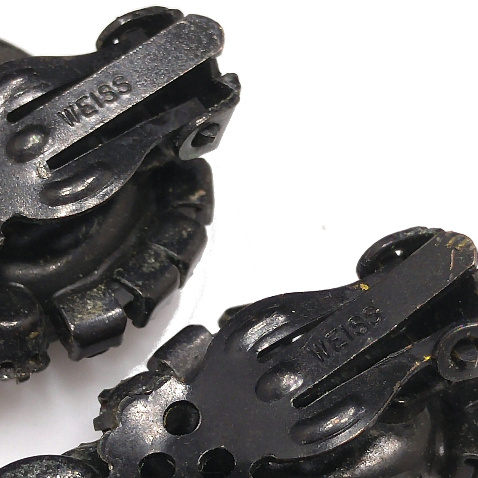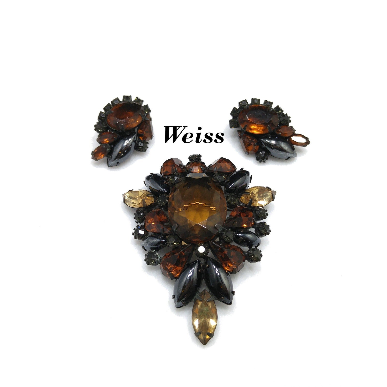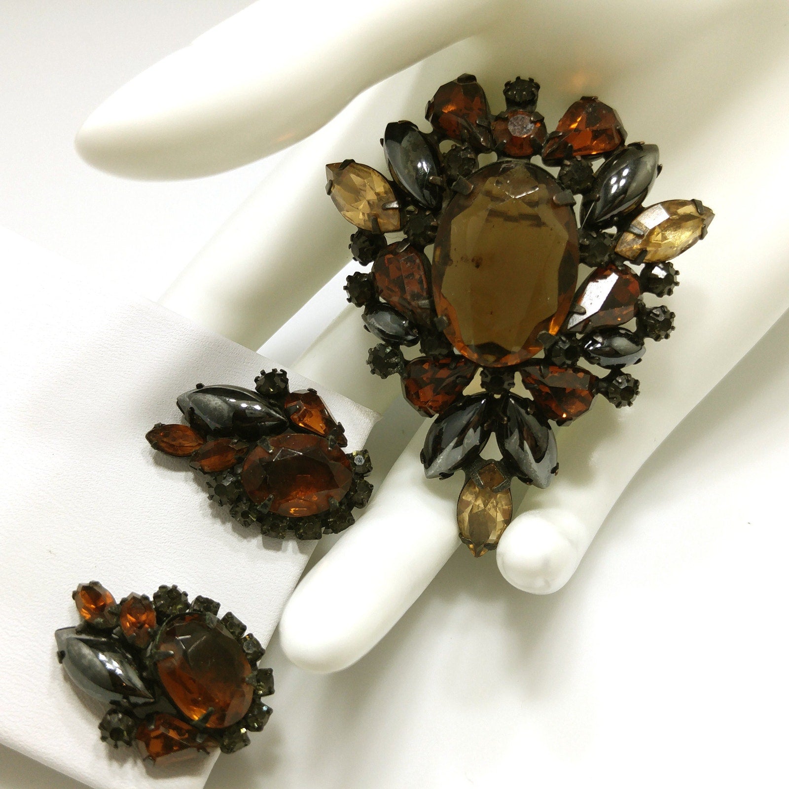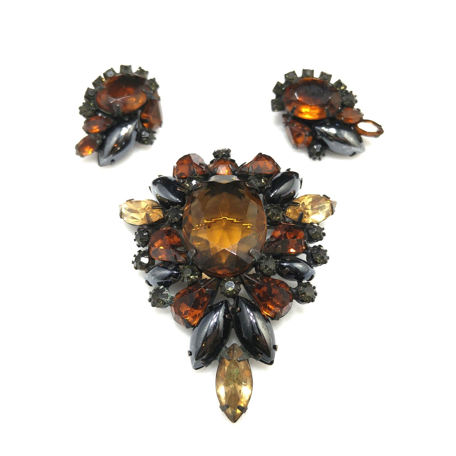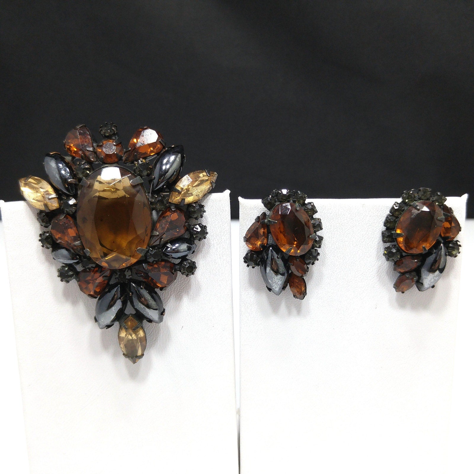 Weiss 1960s Japanned Topaz Rhinestone Brooch & Earrings Set – Faux Hematite Accents