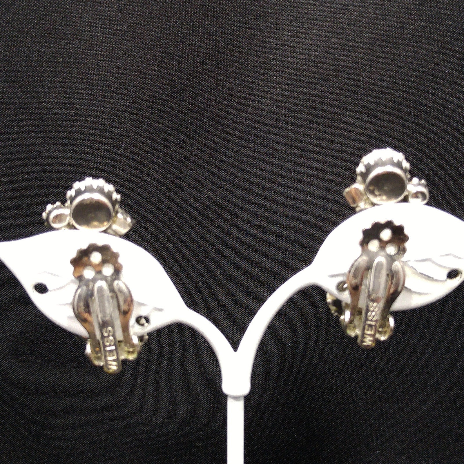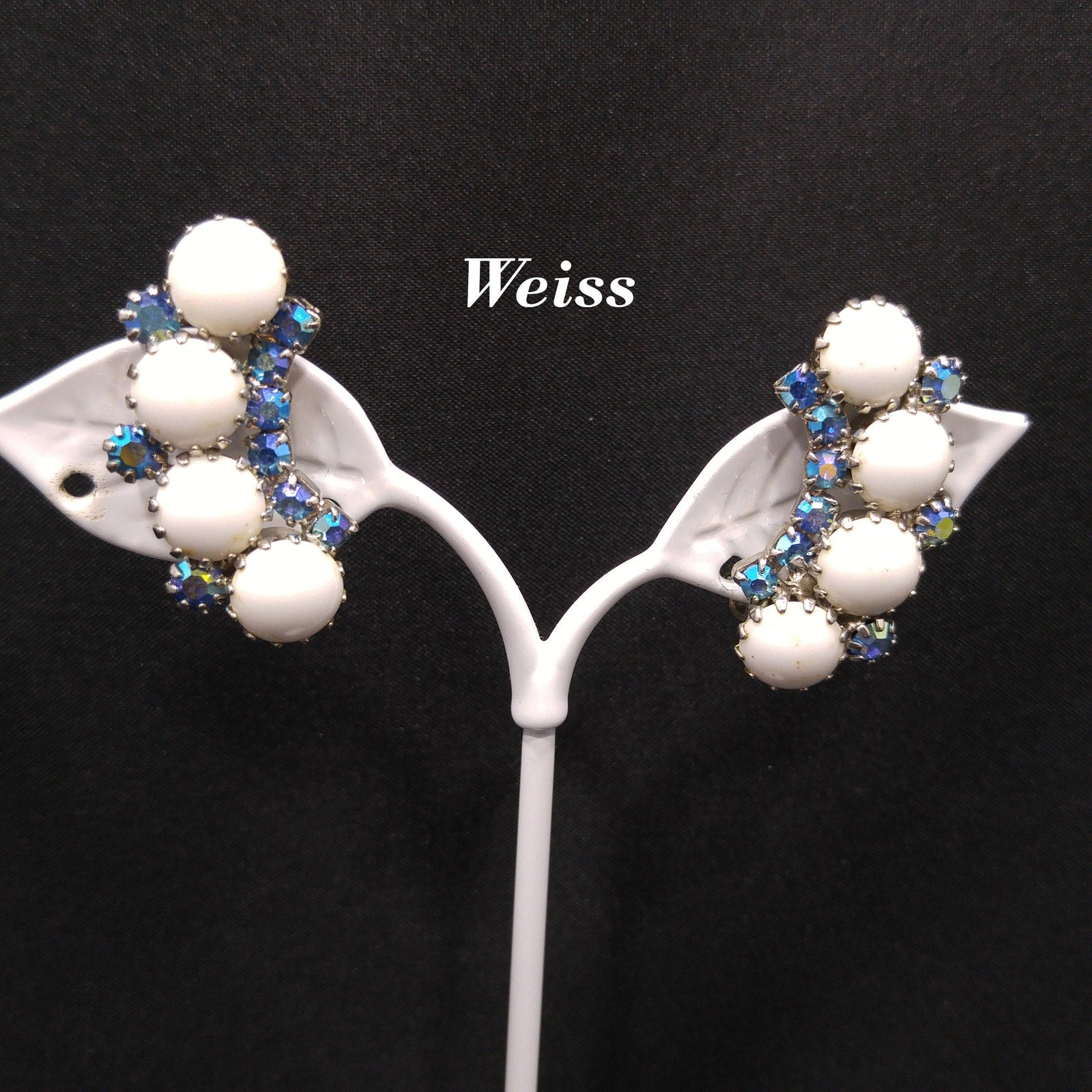 *Description: This is a beautiful pair of mid-century WEISS ear climber clip on earrings with blue aurora borealis rhinestones and white milk glass cabochons from the late 1950s to 1960s. The backs are rhodium plated and each rhinestone is prong set. The earring clips are stamped WEISS on the back of each. This would be a great addition to your vintage jewelry collection or make a great vintage gift!