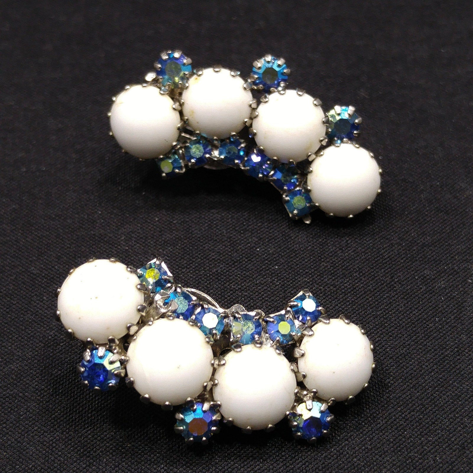 Weiss Aurora Borealis Blue Rhinestone Clip Earrings, White Milk Glass Cabochons, Ear Climbers, 1960s Vintage Jewelry