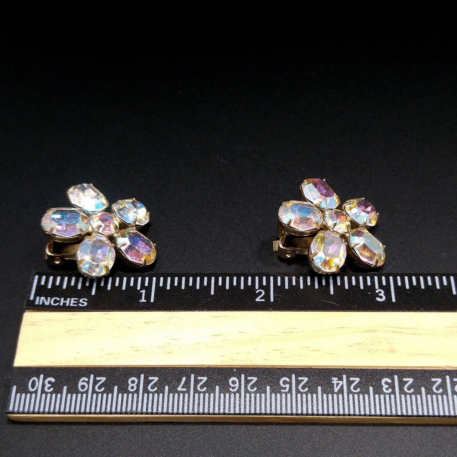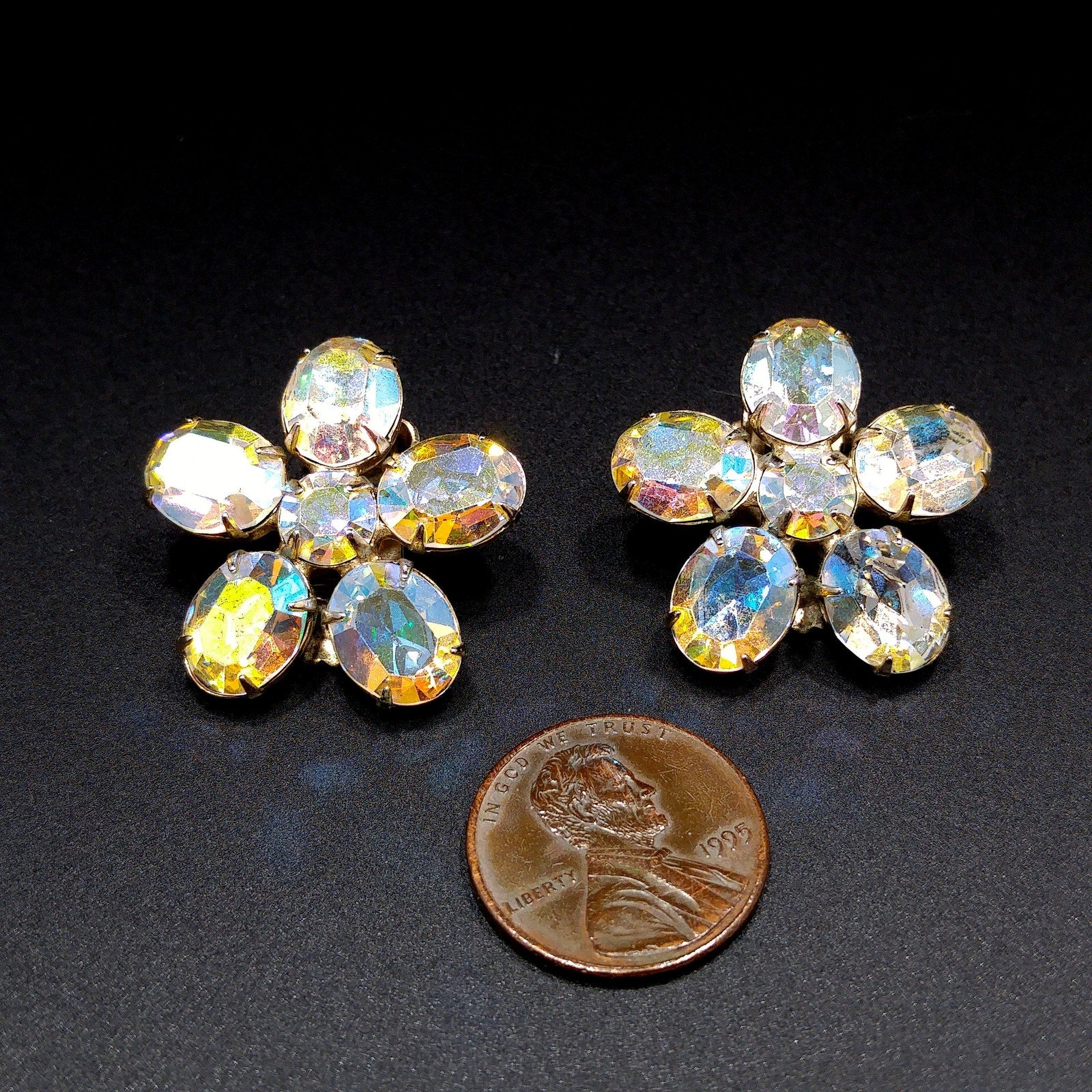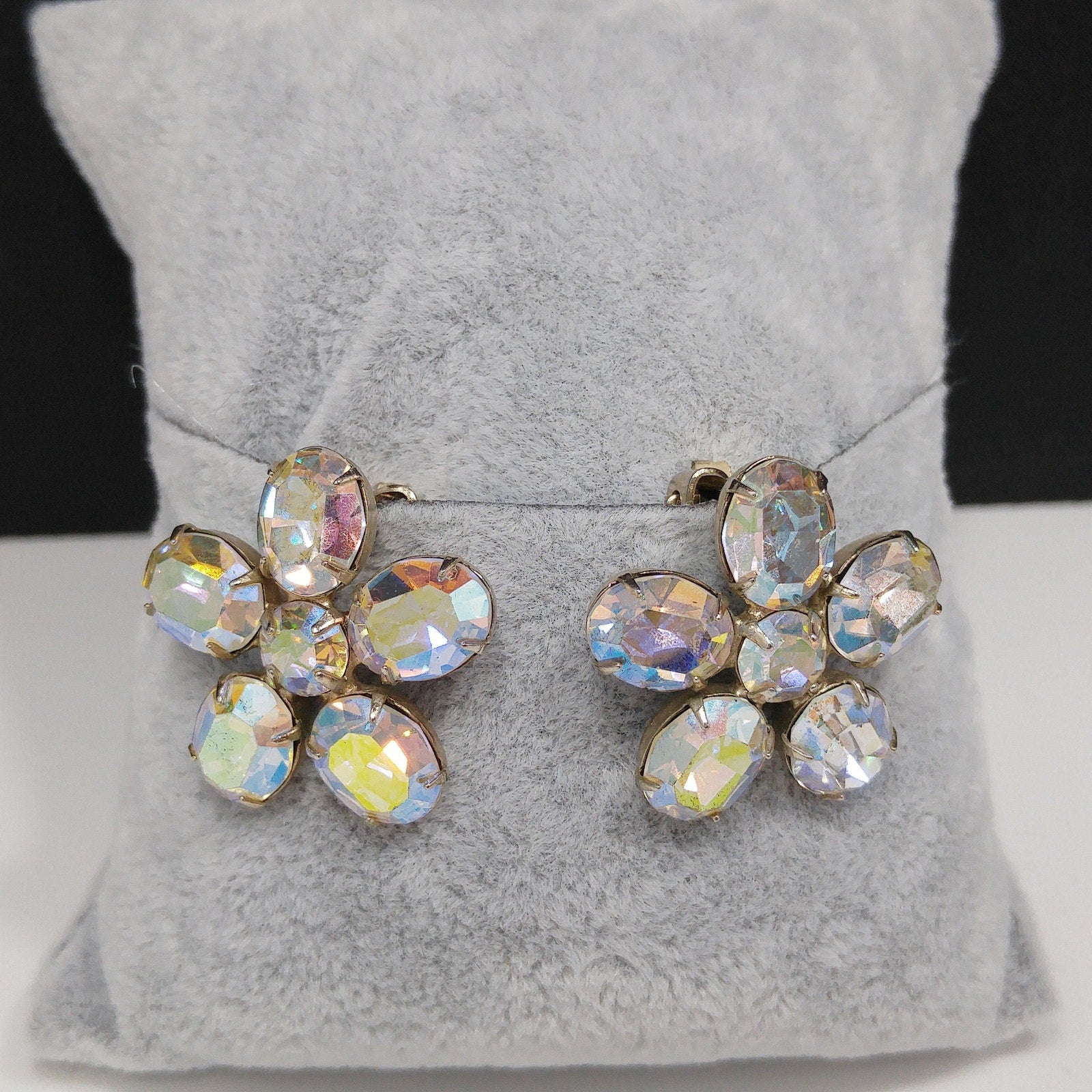 Weiss Aurora Borealis Clear Rhinestone Earrings, Flower Clip Earrings, 1950s Vintage Jewelry