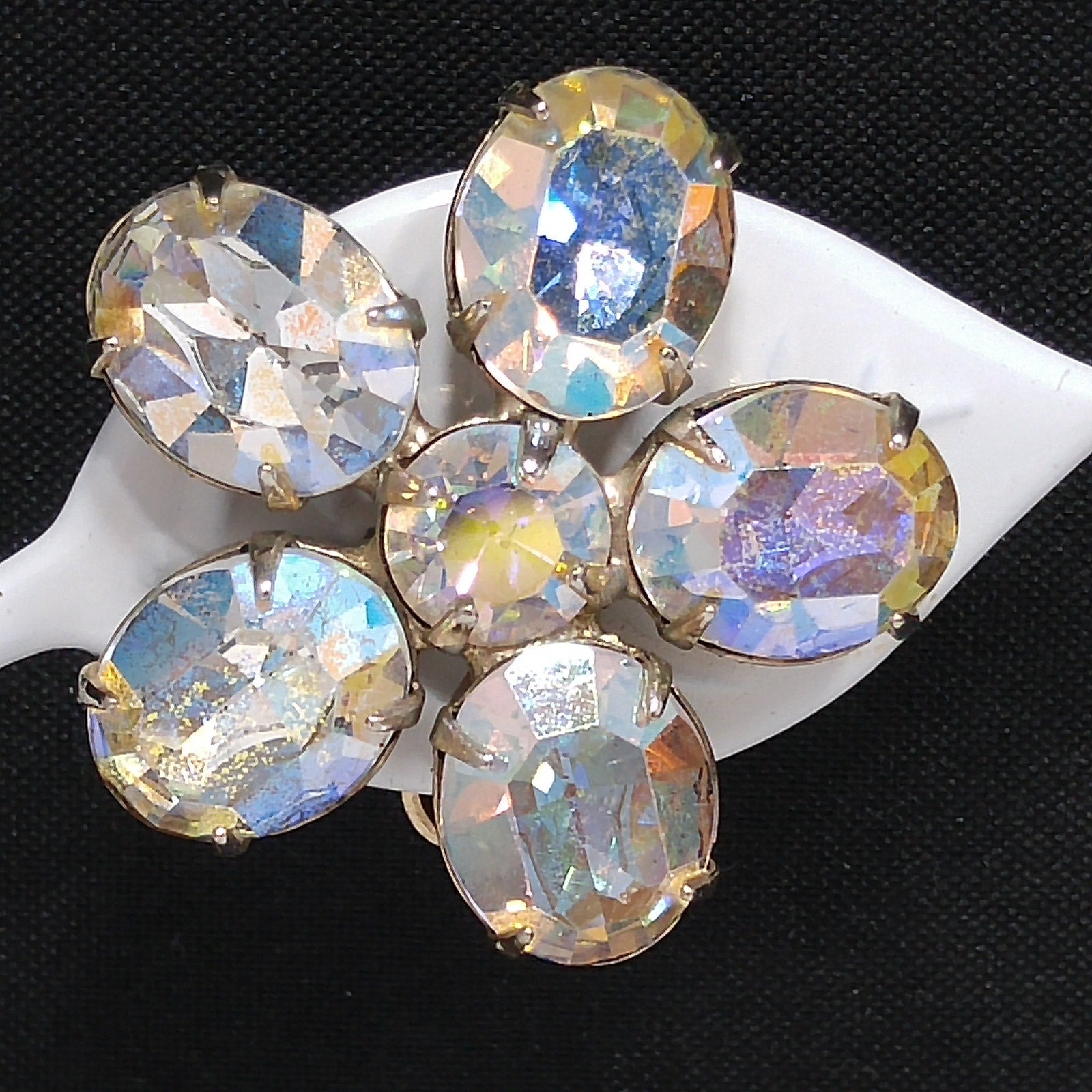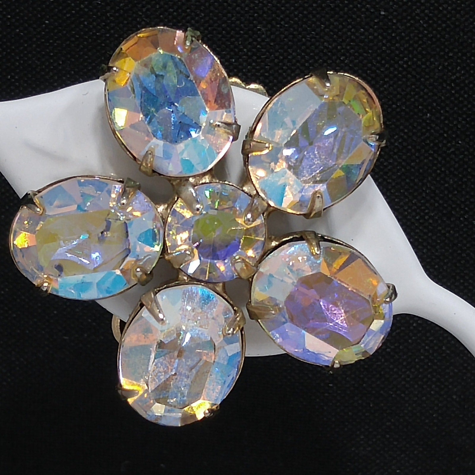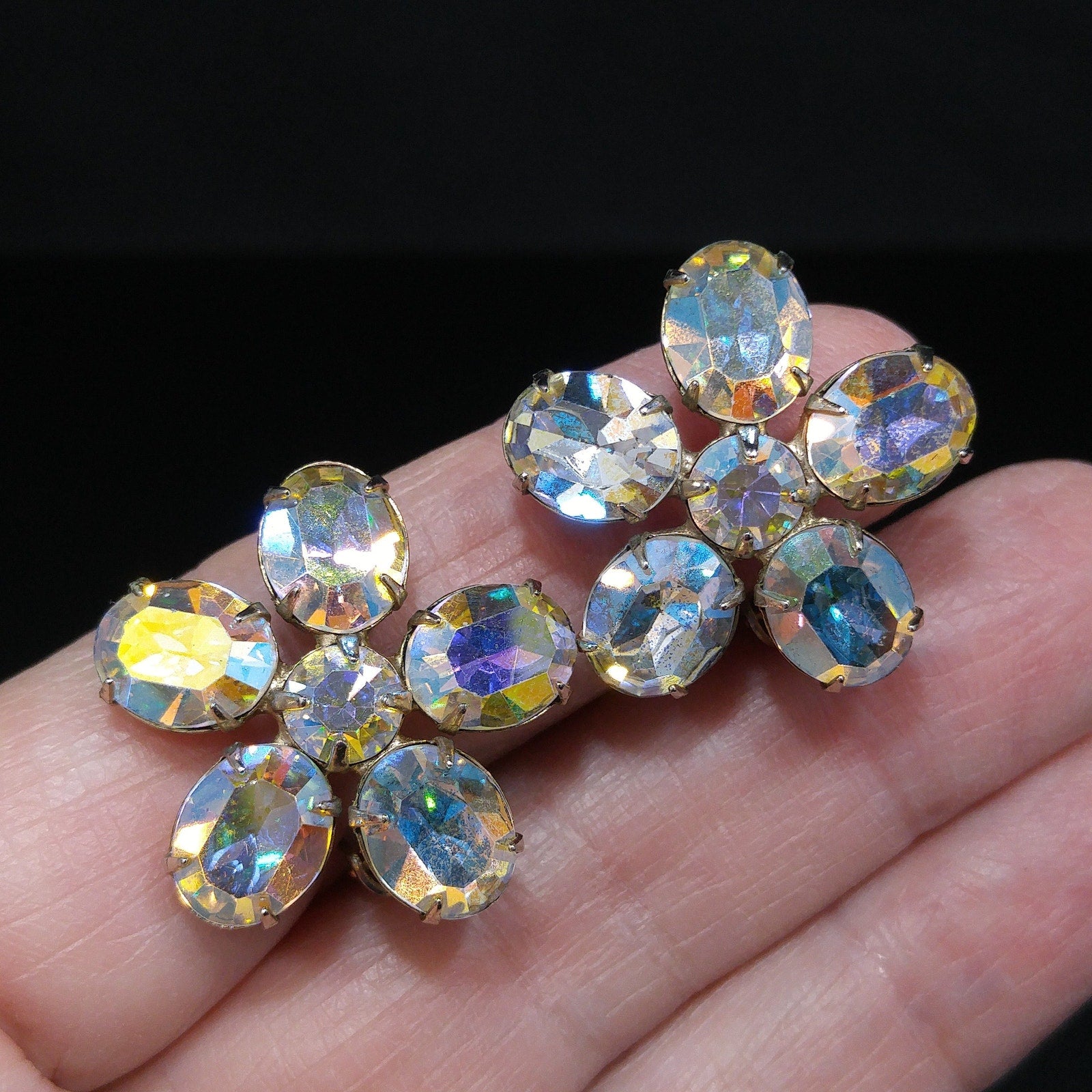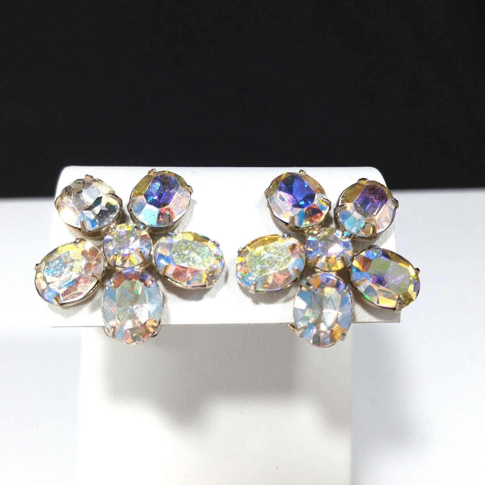 Weiss Aurora Borealis Clear Rhinestone Earrings, Flower Clip Earrings, 1950s Vintage Jewelry