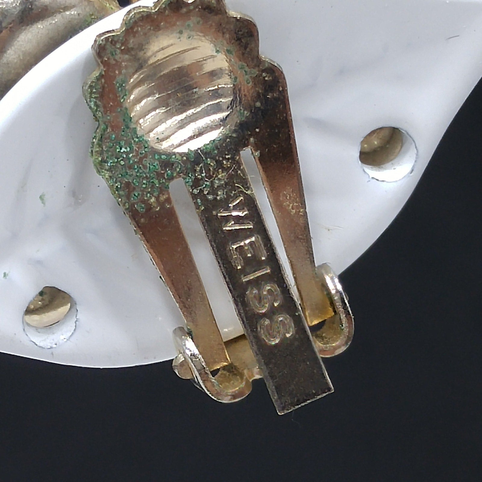 *Description: This is a beautiful pair of Weiss clear aurora borealis crystal petals flower earrings on a gold plated base from the 1950s. Each crystal rhinestone is prong set and full of sparkle. Each earring clip is stamped WEISS on the back. This would be a great addition to your vintage jewelry collection or make a great vintage gift!