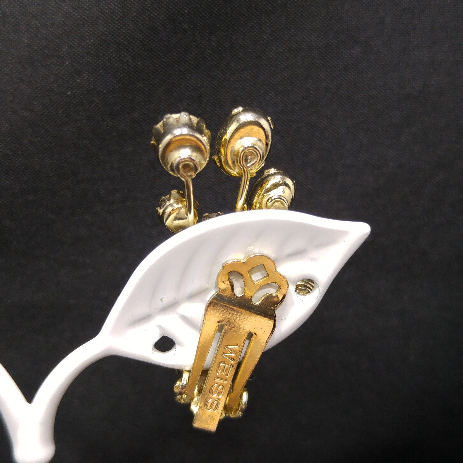*Description: This is a beautiful pair of WEISS ear climber rhinestone earrings from the last half of the 1950s. The rhinestones are aurora borealis clear in two cuts, chaton and oval. The faceted rhinestones are full of glimmer and sparkle as the climb up your ear with the clips near the large prong set round chaton rhinestone at the base. Each earring is stamped Weiss on the back of each clip. The are gorgeous and would be a beautiful addition to any outfit. This would be a great addition to your vintage jewelry collection or make a great vintage gift!