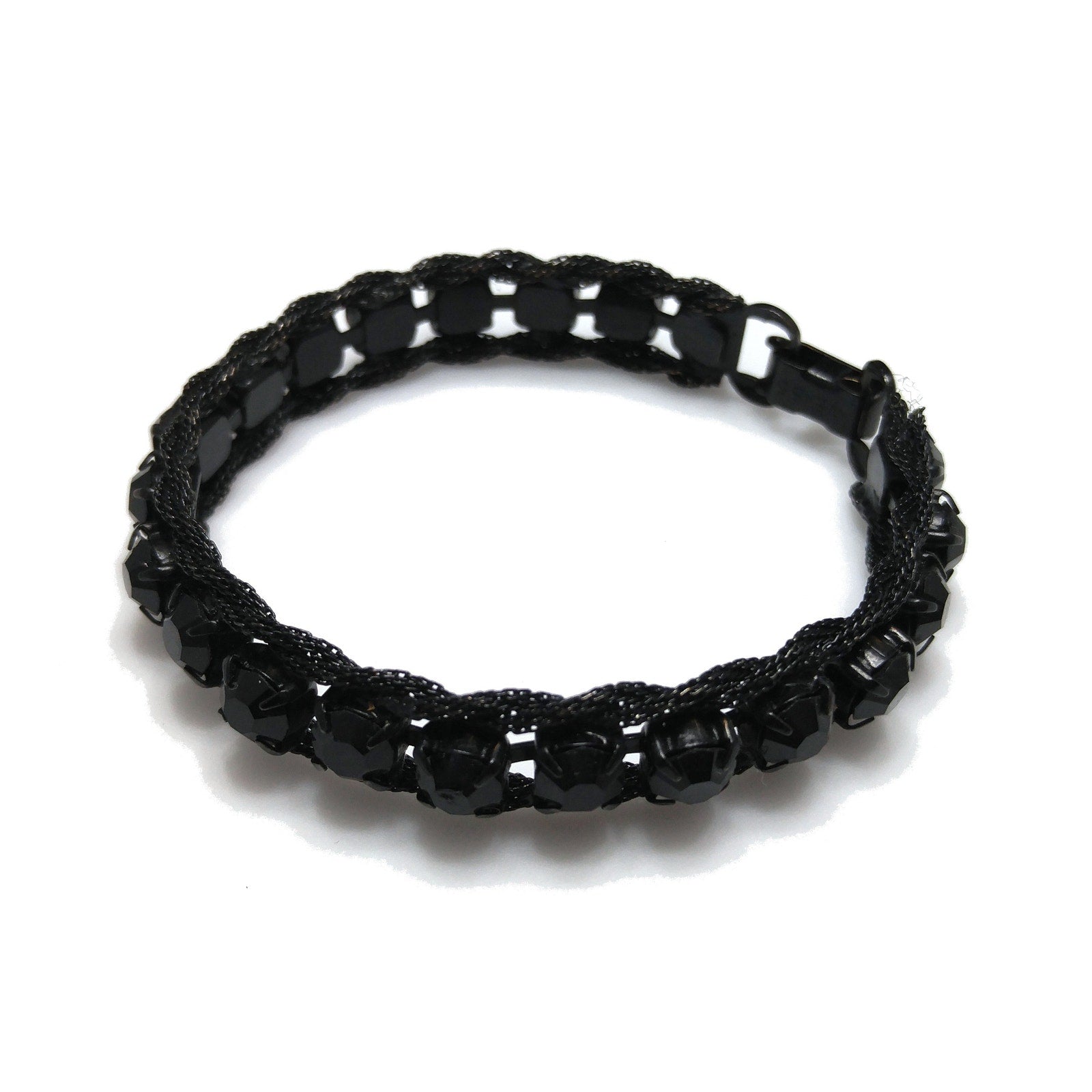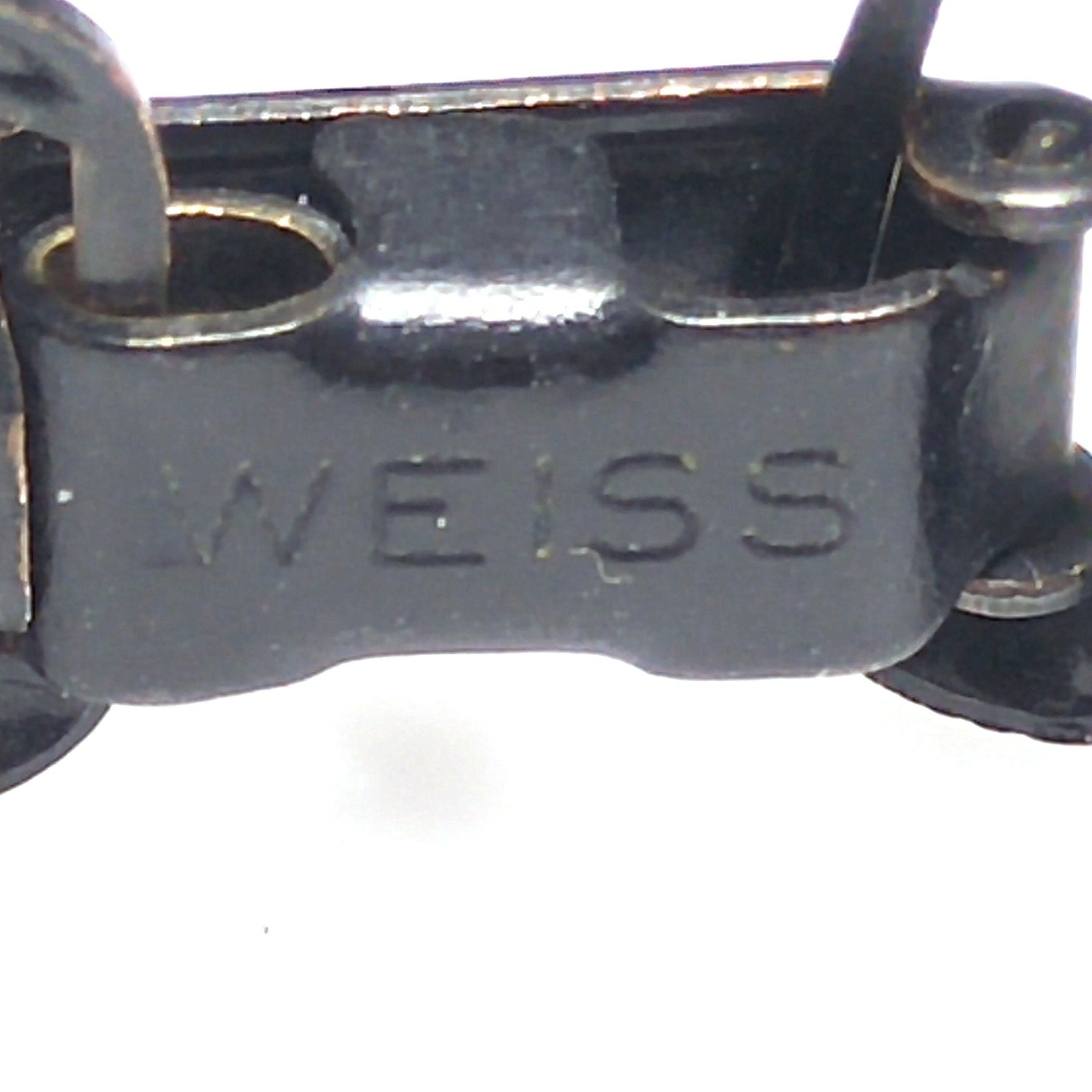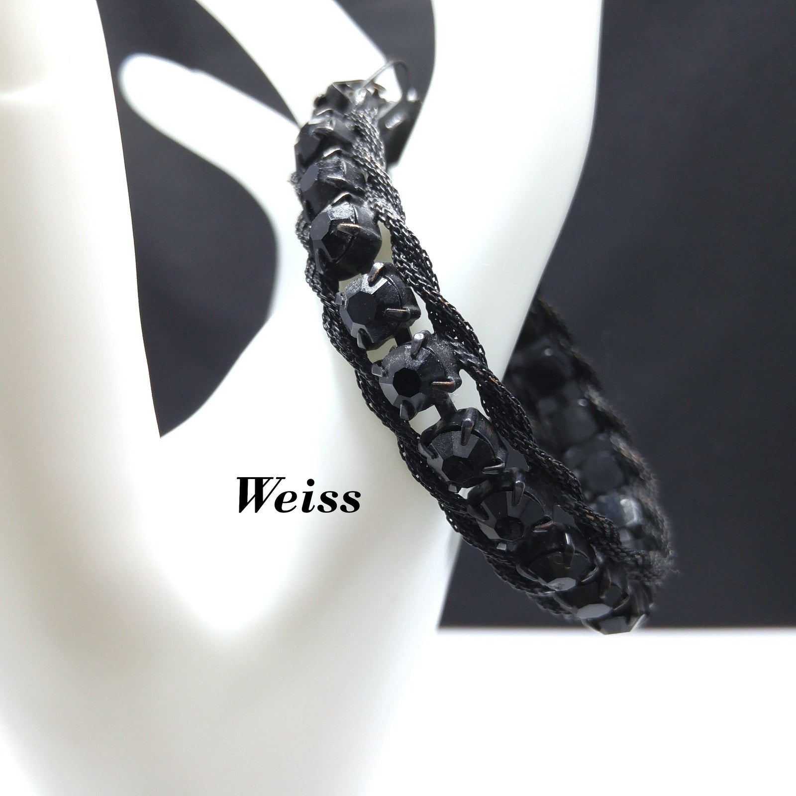 *Description: This is a unique WEISS bracelet in black Japanned enamel over metal with black rhinestones down the center of the bracelet from the 1950s. Japanned finish was very popular during this time period and this bracelet is not commonly found. This would be a great bracelet to wear with a variety of styles. This would be a great addition to your vintage jewelry collection or make a great vintage gift!