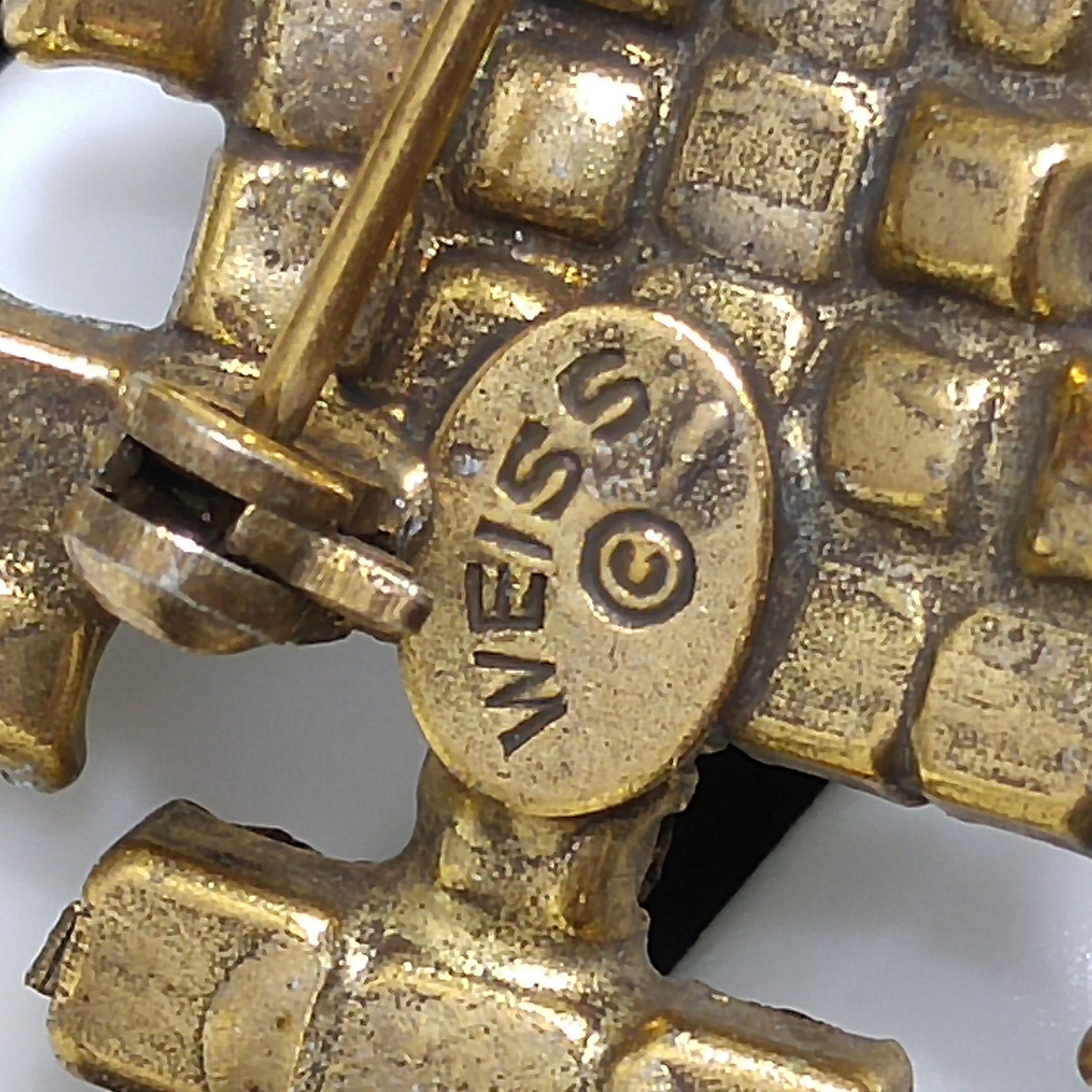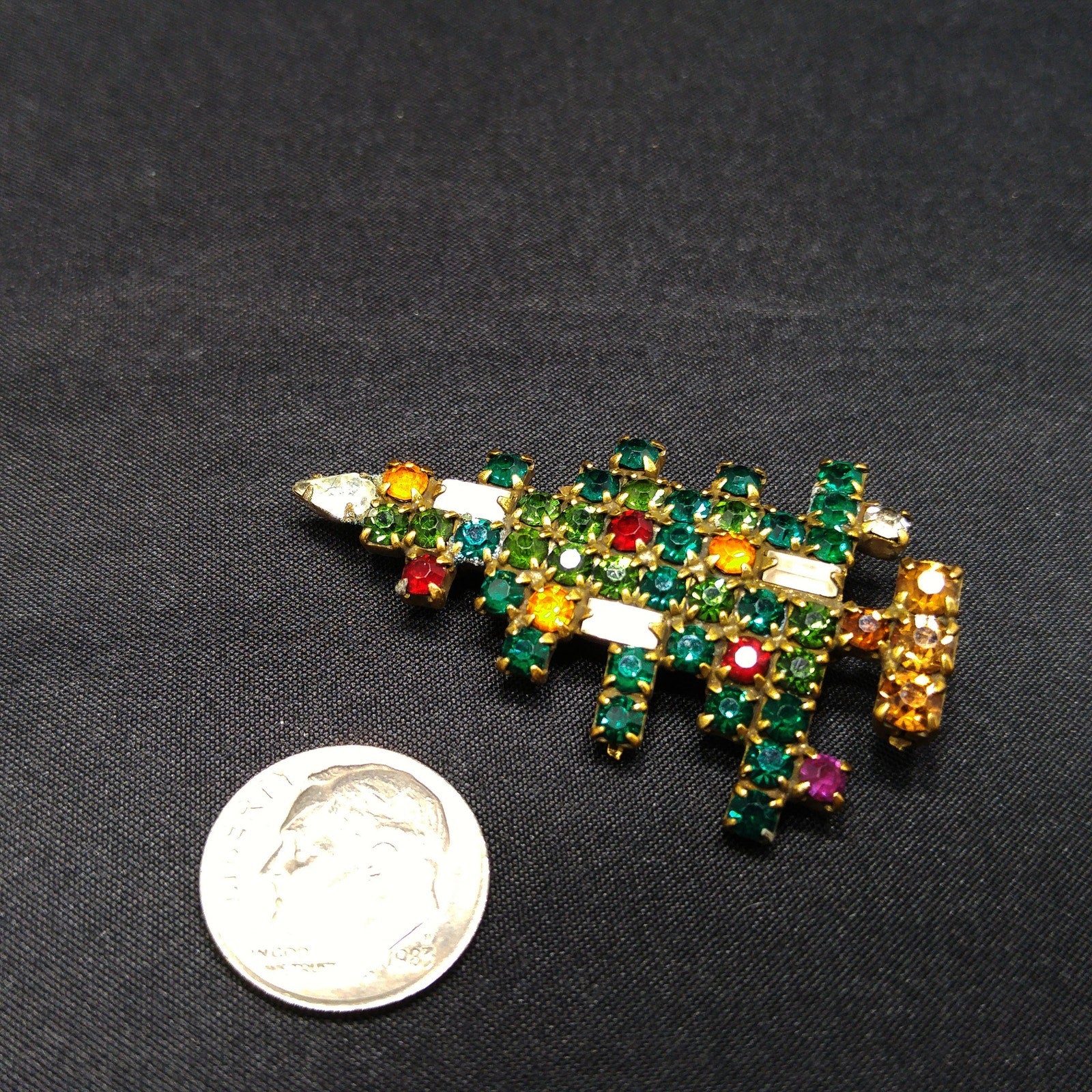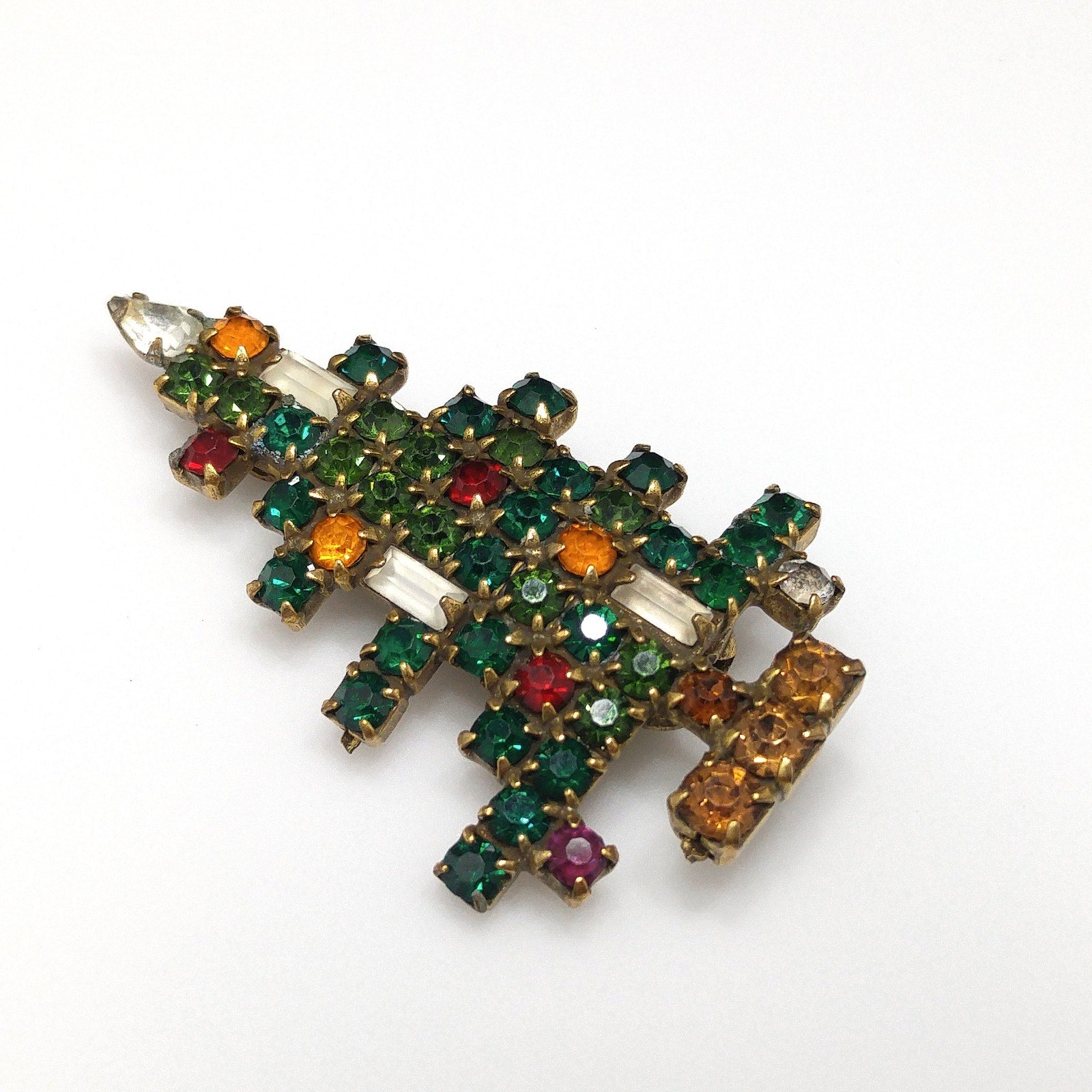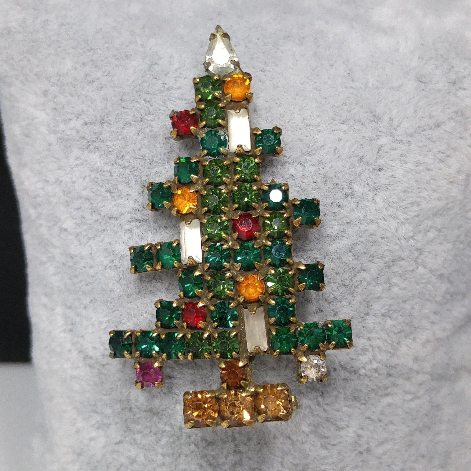 *Description: This is a beautiful Weiss Christmas Tree brooch with three white candles from the late 1950s to 1960s. This brooch is a book piece and is featured in "Christmas Tree Pins O Christmas Tree" by Nancy Unker Trowbridge on page 156. Trowbridge explains, "Here is probably the best known and most highly sought after Weiss Christmas tree pin. The following three trees (we offer one) could be called "The Weiss Trio" because the design comes in three sizes. A wonderful design with green stones (47) creating their own tiers. It is decorated with white baguette candles with gold flames. The base is a horizontal row of amber stones." The brooch that we offer is the smaller of the three trees and it has slightly darker green stones and famously, three baguette candles. I tested the surface metal and it tested at 10K gold plate or wash. This would be a great addition to your vintage jewelry collection or make a great vintage gift!