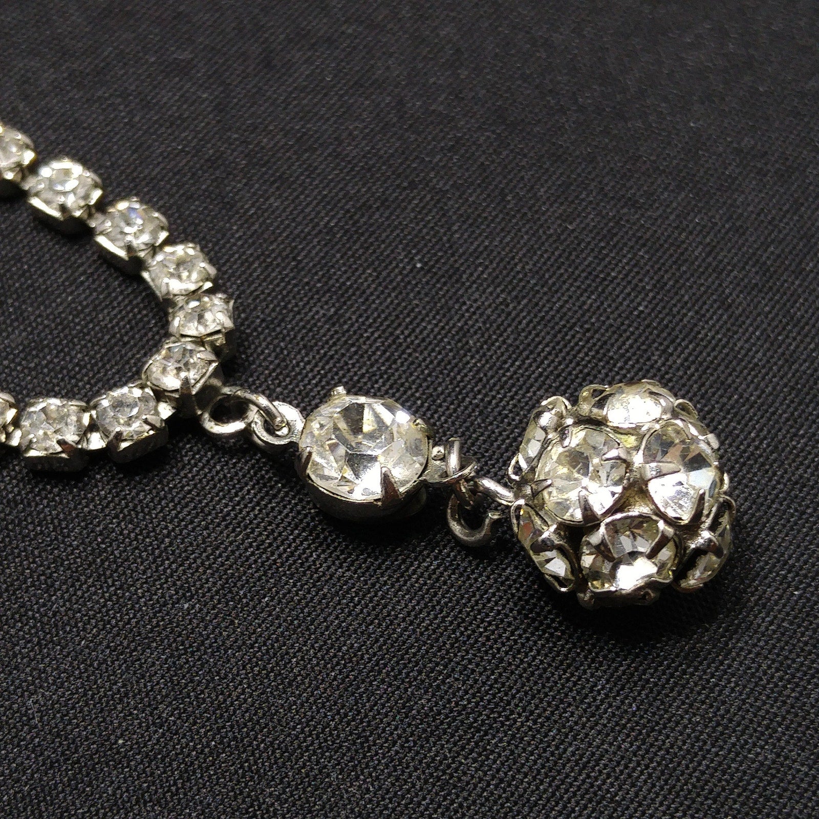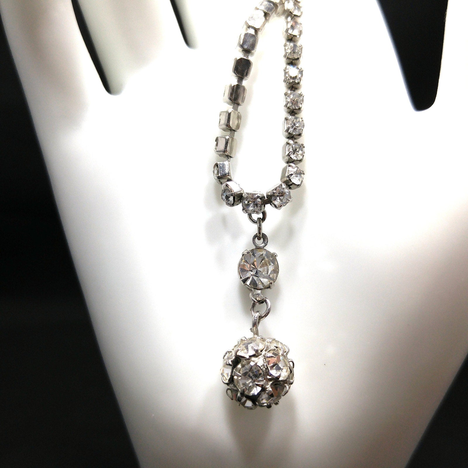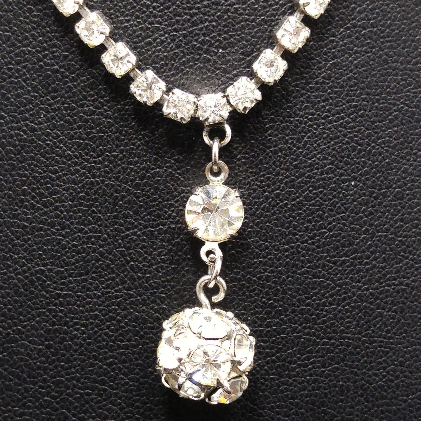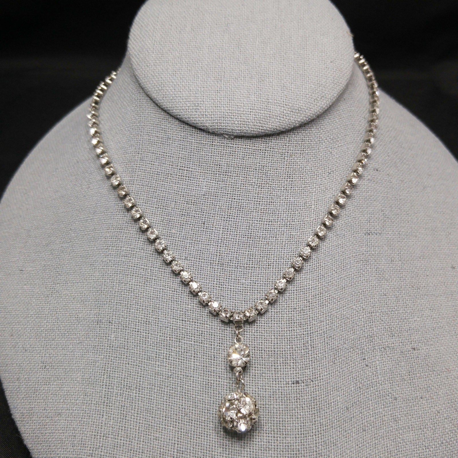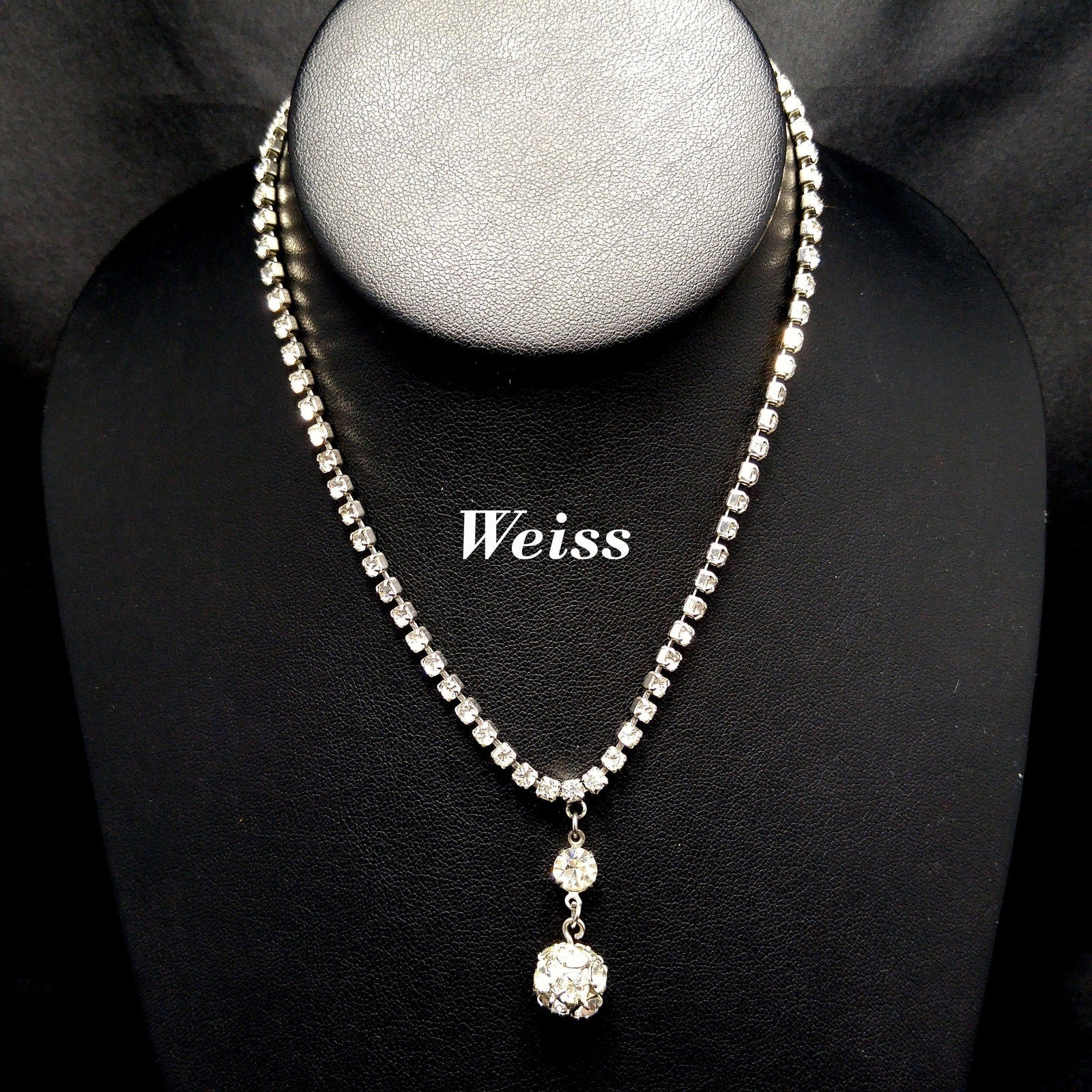 *Description: This is a gorgeous mid-century WEISS necklace in clear rhinestones and rhodium plating from the 1950s. This necklace would look beautiful at a wedding for "something old". One of the unique features of this necklace is the drop pendant which is in two parts. It has a prong set rhinestone with a ball of rhinestones hanging below for a total drop of 1 1/4 Inches. The necklace has a hook clasp and a larger rhinestone at the opposite end so that you can adjust the length up to 15 inches. This would be a great addition to your vintage jewelry collection or make a great vintage gift!