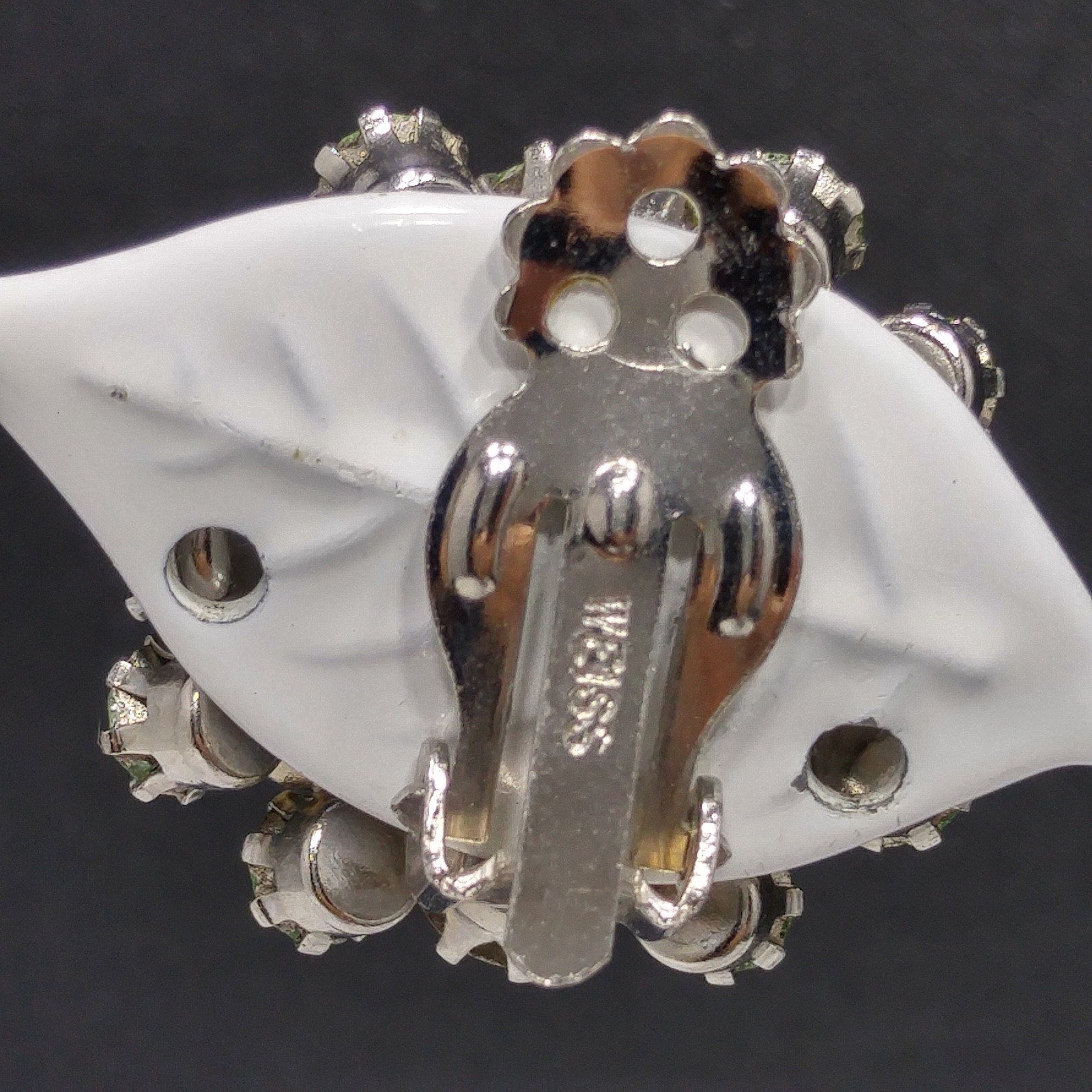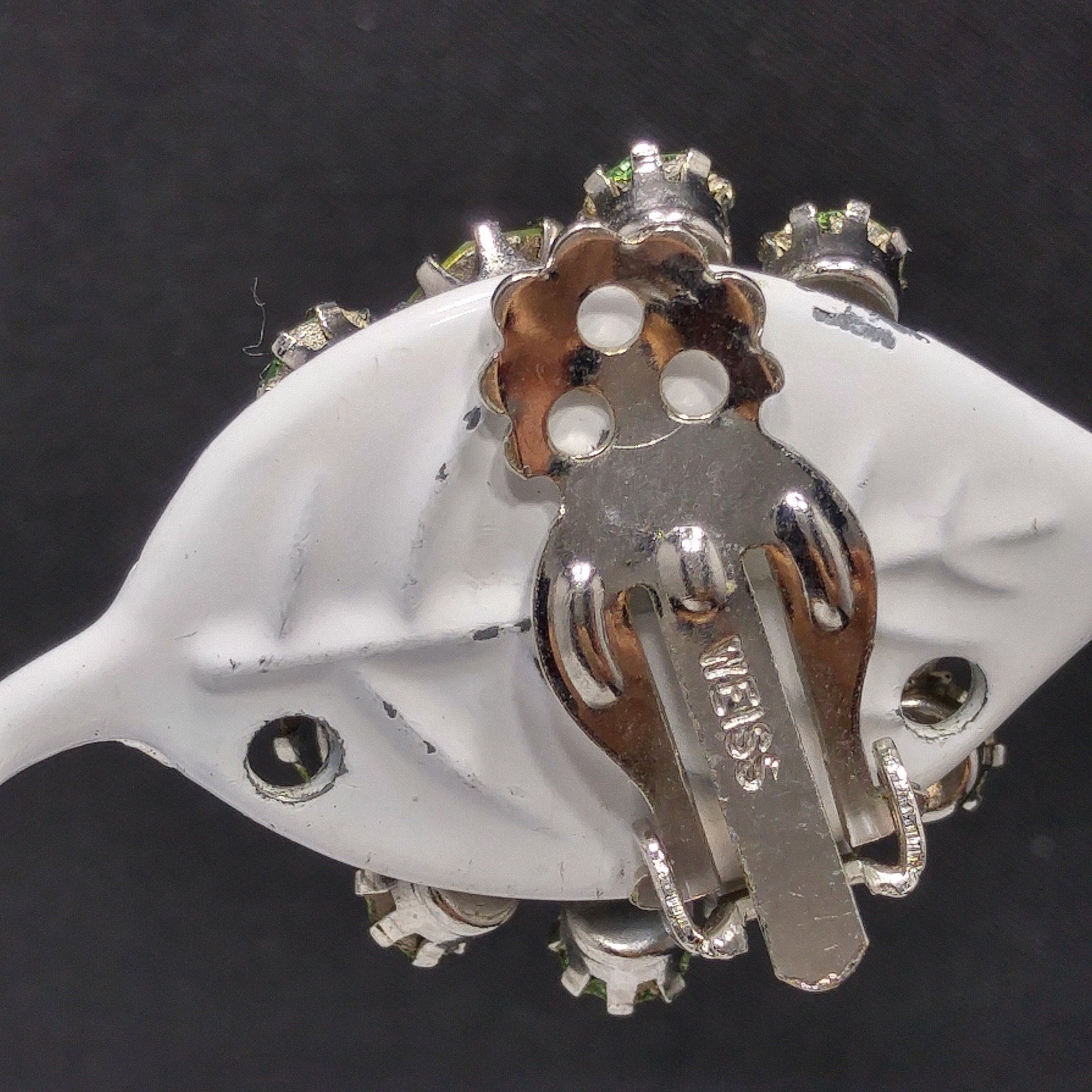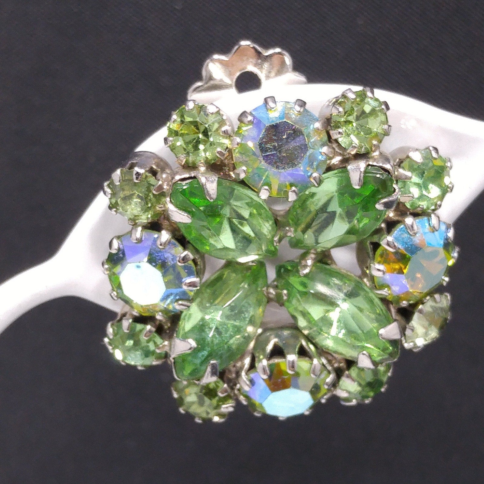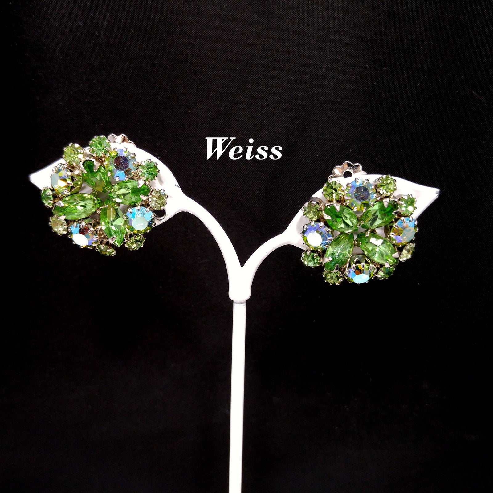 *Description: This is a beautiful pair of Weiss peridot green rhinestone earrings with accents in aurora borealis on a rhodium plated backing from the 1960s. The earrings also include three peridot green rhinestones that are uranium glass. See photo for details. It is easier to see in one earring. The earrings are beautiful, as always, for Weiss. This would be a great addition to your vintage jewelry collection or make a great vintage gift!